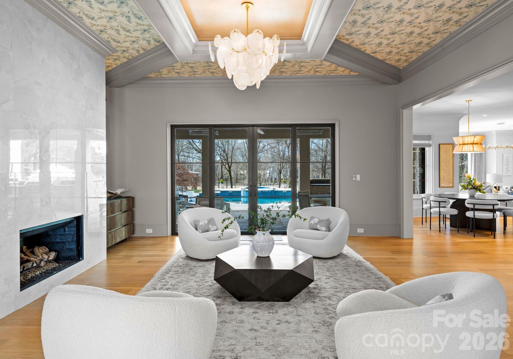 Outdoors, covered terraces open to a resort style pool and spa, complemented by a pool house with a convenient half bath, all set against sweeping fairway views.