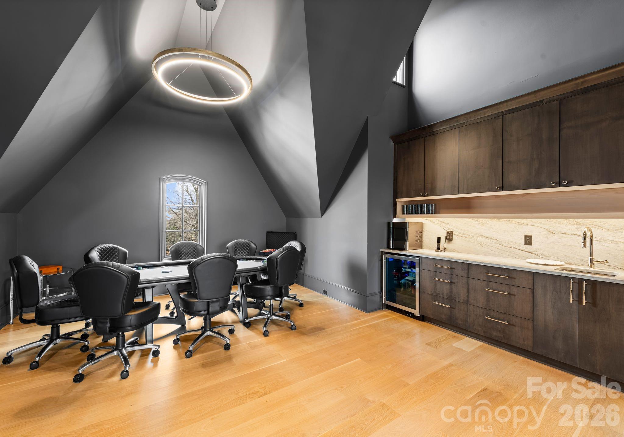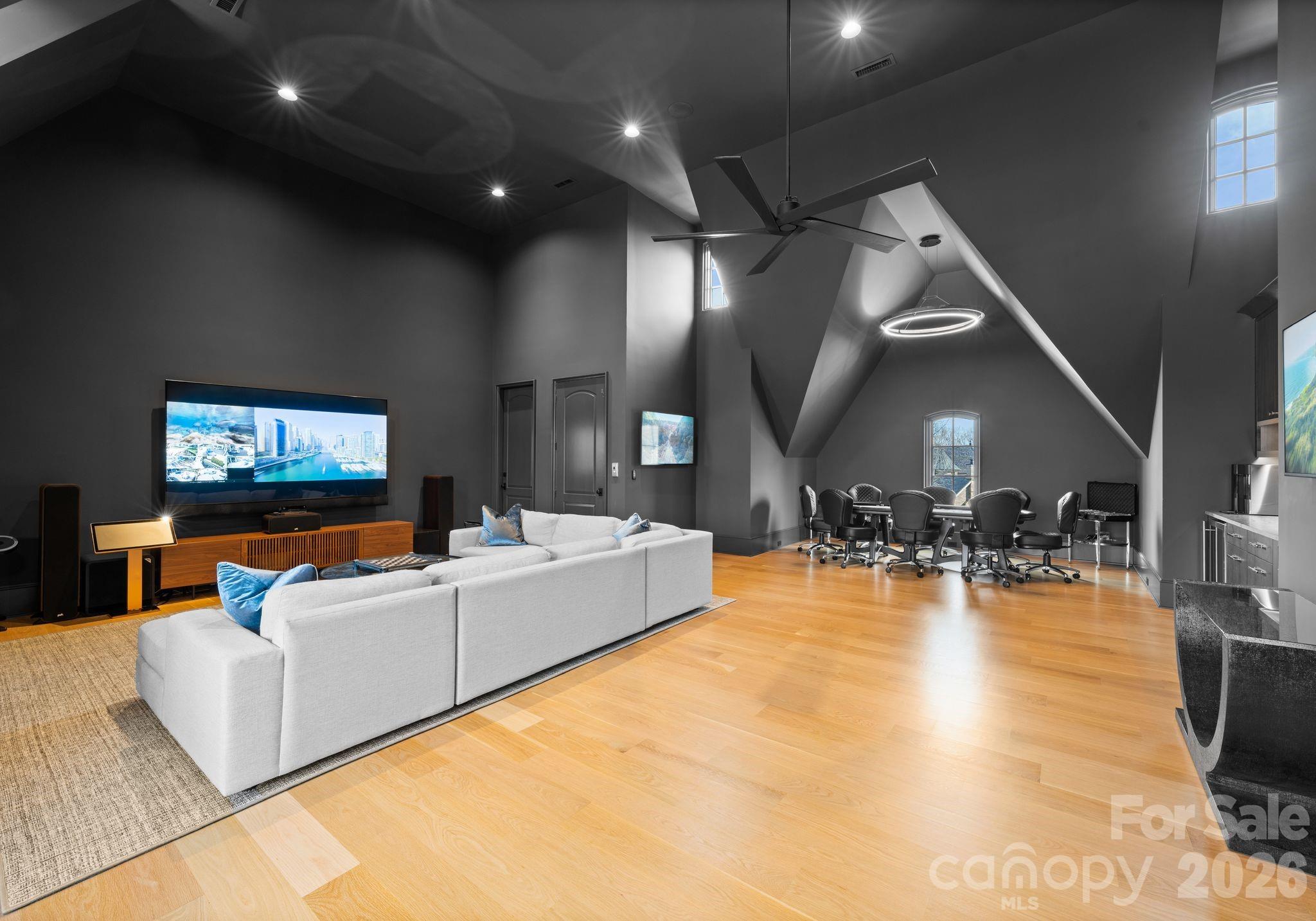 Upstairs, the second level includes four spacious ensuite bedrooms (one is currently being used as a fitness space), a loft, media lounge with bar, secondary laundry room, and office. The third floor presents a versatile game room or flex space, complete with a moody full bath that is ideal for entertaining or a private escape.
