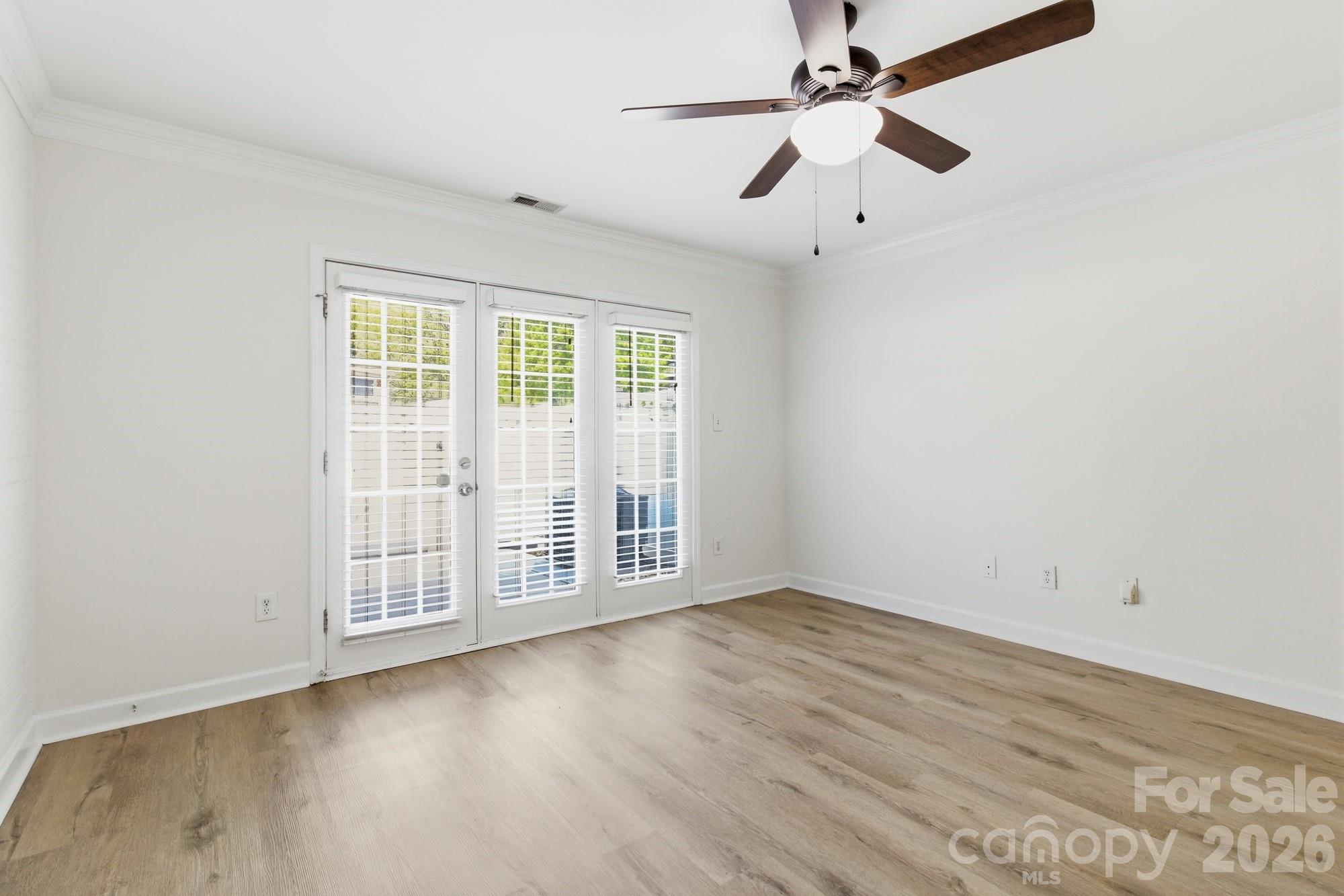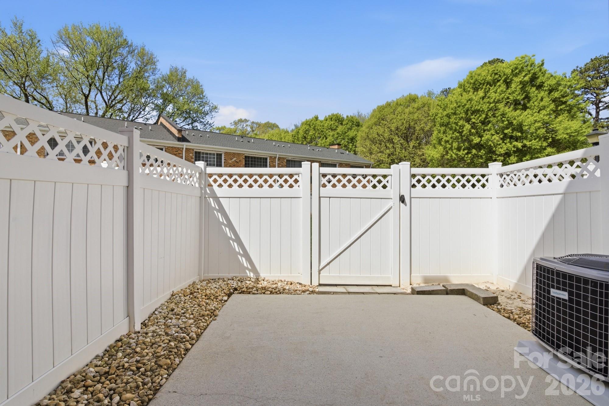 French doors lead to a private, fully fenced patio with 6-foot white vinyl fencing, providing added solitude and usable outdoor space for dining, grilling, or relaxing.