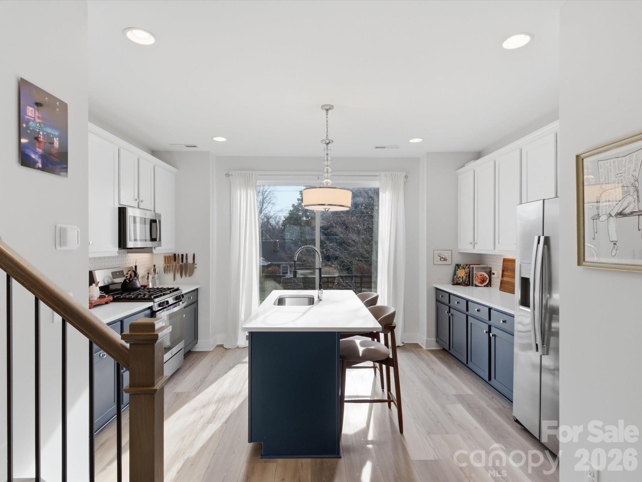 Life in NoDa has a rhythm, morning coffee on the walk to the light rail, afternoons working from a sunlit living space, evenings that begin on the strip and end above the city skyline. 1013 E 36th Street was designed for that rhythm. Located in Landings at NoDa, this light-filled townhome blends modern architectural character with everyday practicality. From the moment you enter, the dramatic open stairwell and vertical volume create a sense of scale that feels intentional and refined. Expansive front-facing windows line the main living level, offering wide sightlines down 36th Street and filling the home with natural light. The result is a true loft-like atmosphere, bright, open, and connected to the energy of the neighborhood. The kitchen features quartz countertops, tile backsplash, and clean, modern finishes that flow seamlessly into the dining and living areas. Whether hosting friends before dinner in NoDa or enjoying a quiet night in, the space adapts effortlessly. Upstairs, the private rooftop terrace becomes the unexpected luxury. Capturing soft morning sunlight and positioned away from direct street noise, it offers a quiet, elevated retreat for coffee at sunrise or evenings under the city glow. Privacy walls on either side create an intimate setting rarely found in this price point. A true two-car garage, increasingly rare in this pocket of NoDa, provides convenience and security, while street-facing orientation offers broader sightlines and an open feel within the community. HOA-covered exterior maintenance allows for lock-and-leave simplicity without the upkeep typically associated with older homes in the area. Just a 10-minute walk to the NoDa strip and the 36th Street LYNX station, this home delivers the walkable lifestyle buyers seek, without the maintenance profile of a 100-year-old bungalow. Modern systems, architectural presence, and everyday ease come together here. For those who love historic neighborhoods but prefer contemporary design and simplicity, 1013 E 36th Street offers a different way to live NoDa, elevated, intentional, and distinctly urban.