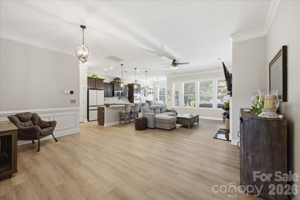 Recent updates include brand-new LVP flooring, fresh Agreeable Gray paint throughout, and updated light fixtures and ceiling fans across the entire home. The kitchen has been upgraded with new Samsung appliances including refrigerator, dishwasher, and microwave, and features custom built-in shelving behind the bar for added style and storage.