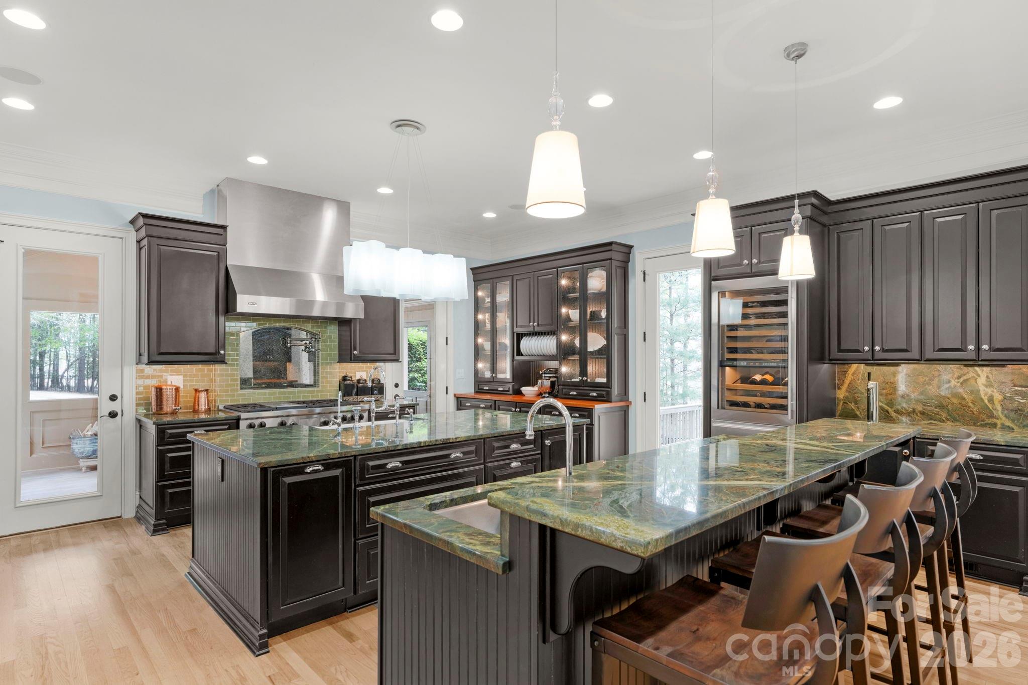 The heart of the home is a magnificent chef’s kitchen designed for high-end entertaining and integrated audio. Two massive granite-topped islands anchor the space: one serves as a social hub with a breakfast bar, beverage refrigerator, and ice maker, while the second functions as a professional prep station equipped with dual Miele dishwashers. The appliance suite is a culinary dream, featuring a SubZero refrigerator, a Wolf 6-burner dual-oven range, a built-in Miele coffee system, and a built-in kegerator. This culinary center flows seamlessly into a bright family room anchored by a stone gas fireplace, while a step-down great room with coffered ceilings offers even more space to gather. For a more intimate setting, the enclosed screened porch features teak hardwood floors and its own stone fireplace, perfect for relaxing to your favorite music in the fresh air.