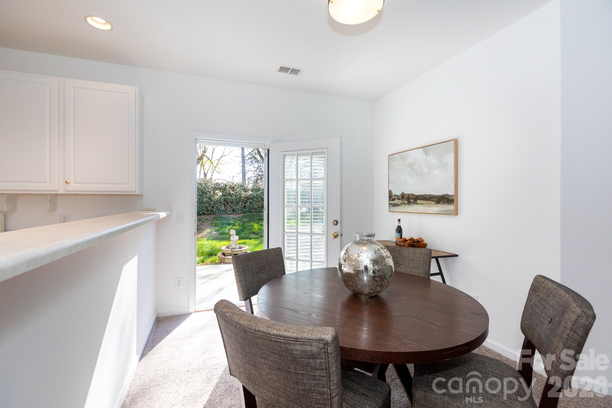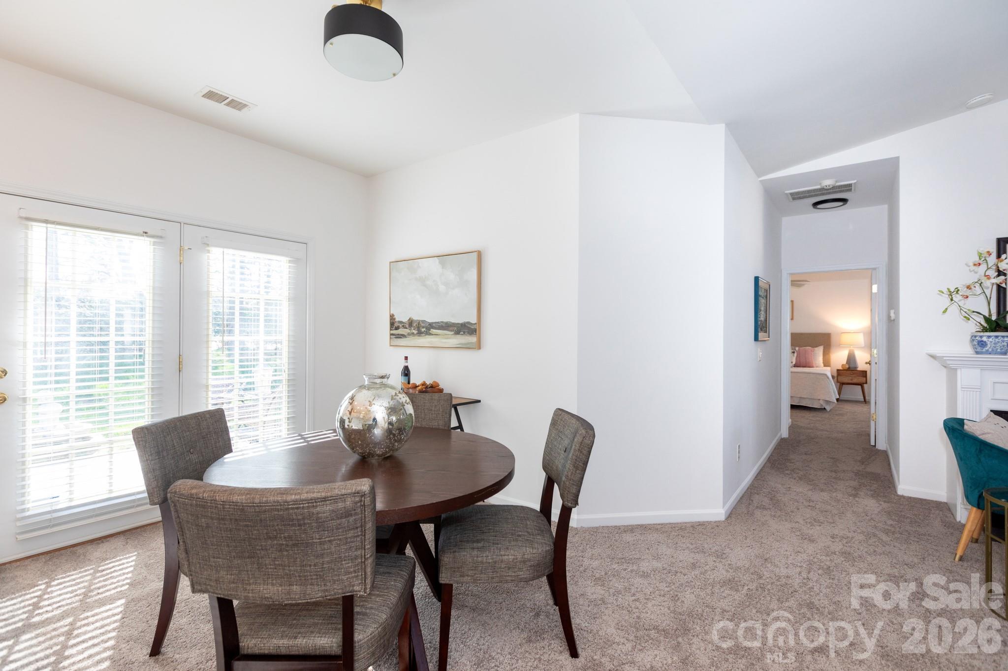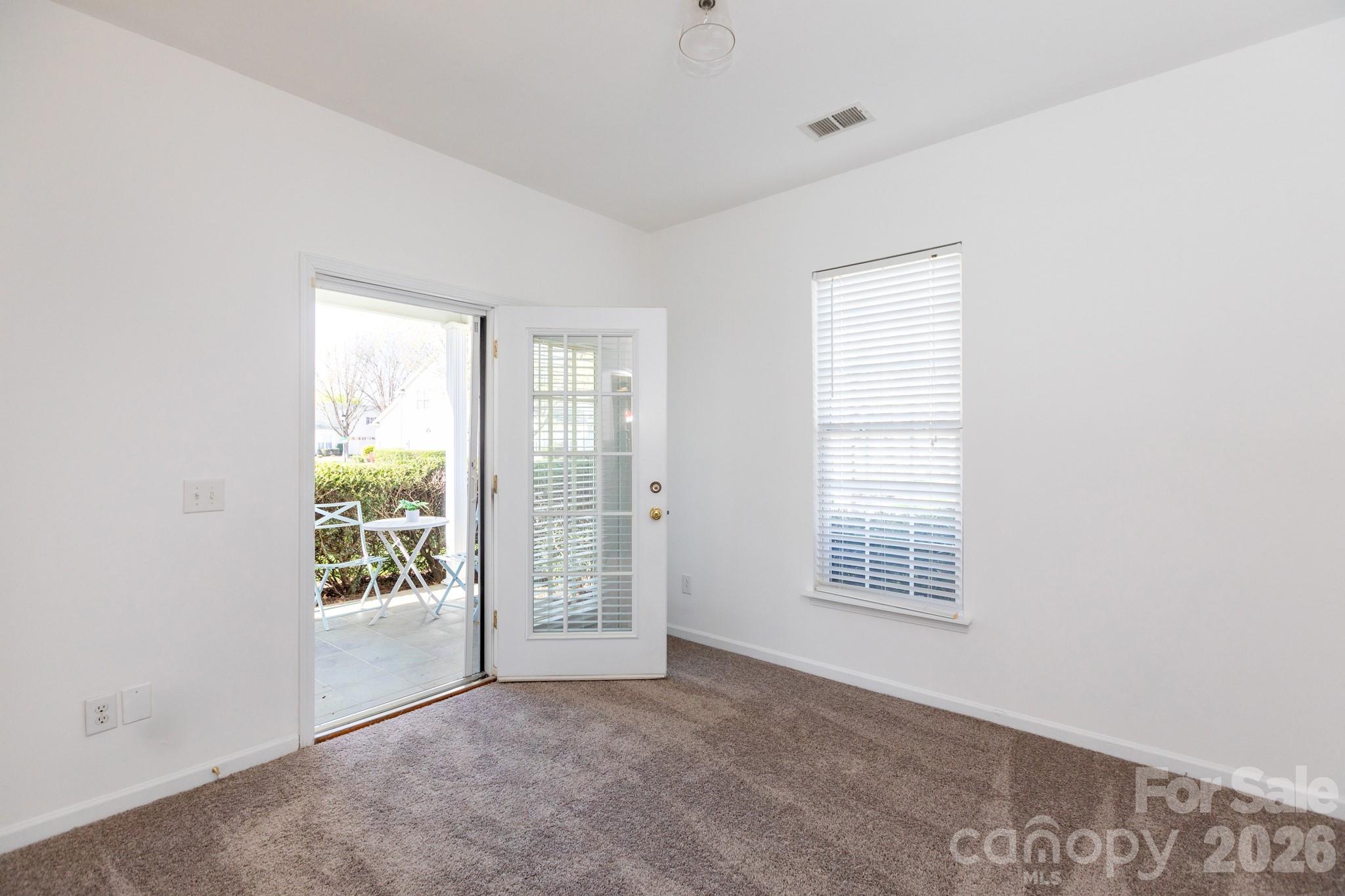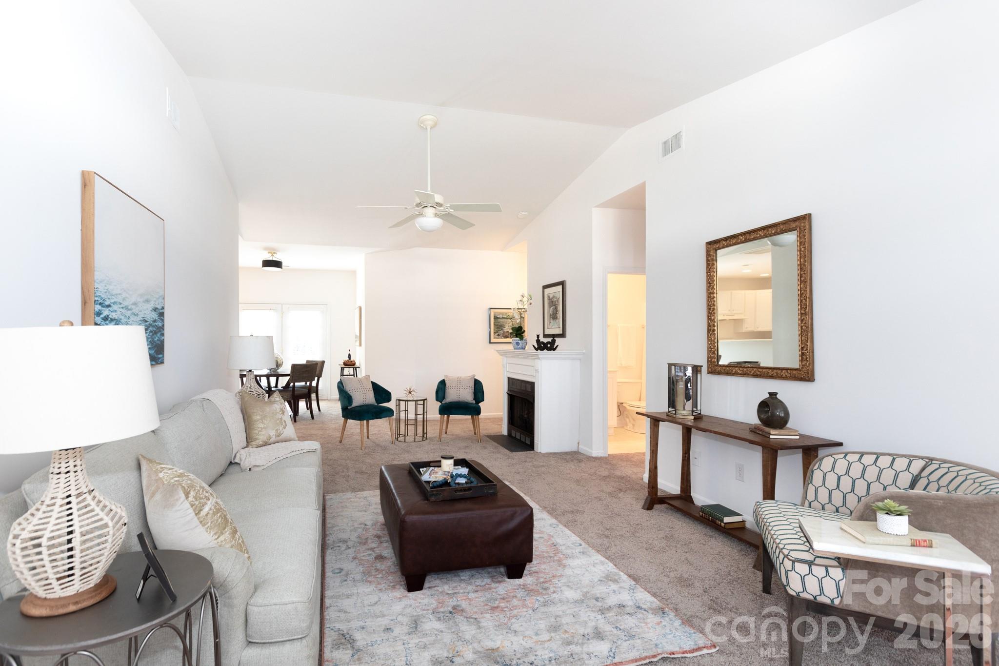 Easy one-story living in this villa in popular Southbrook. Nestled off of Rea Road near Blakeney Shopping Center, this location offers ultimate convenience. This townhouse sits in the back of the community, backing common area, and with not one, but two outdoors spaces (covered porch and back patio). Inside, there's a spacious vaulted living room with fireplace. It leads to the dining area, with french doors to the back patio. The kitchen w/white cabinetry, connects to the spacious laundry room with coat closet and zero-entry to the 2-car garage. The primary suite is large, with tray ceiling and extra sitting area, plus an a bath with dual vanity, and roomy walk-in closet. Bedroom two is on the front of the home with doors to the covered porch, and access to a hall bath. There's new paint throughout, some updated lighting, and new carpet, just installed. Enjoy the community pool, as summer approaches. Welcome home!