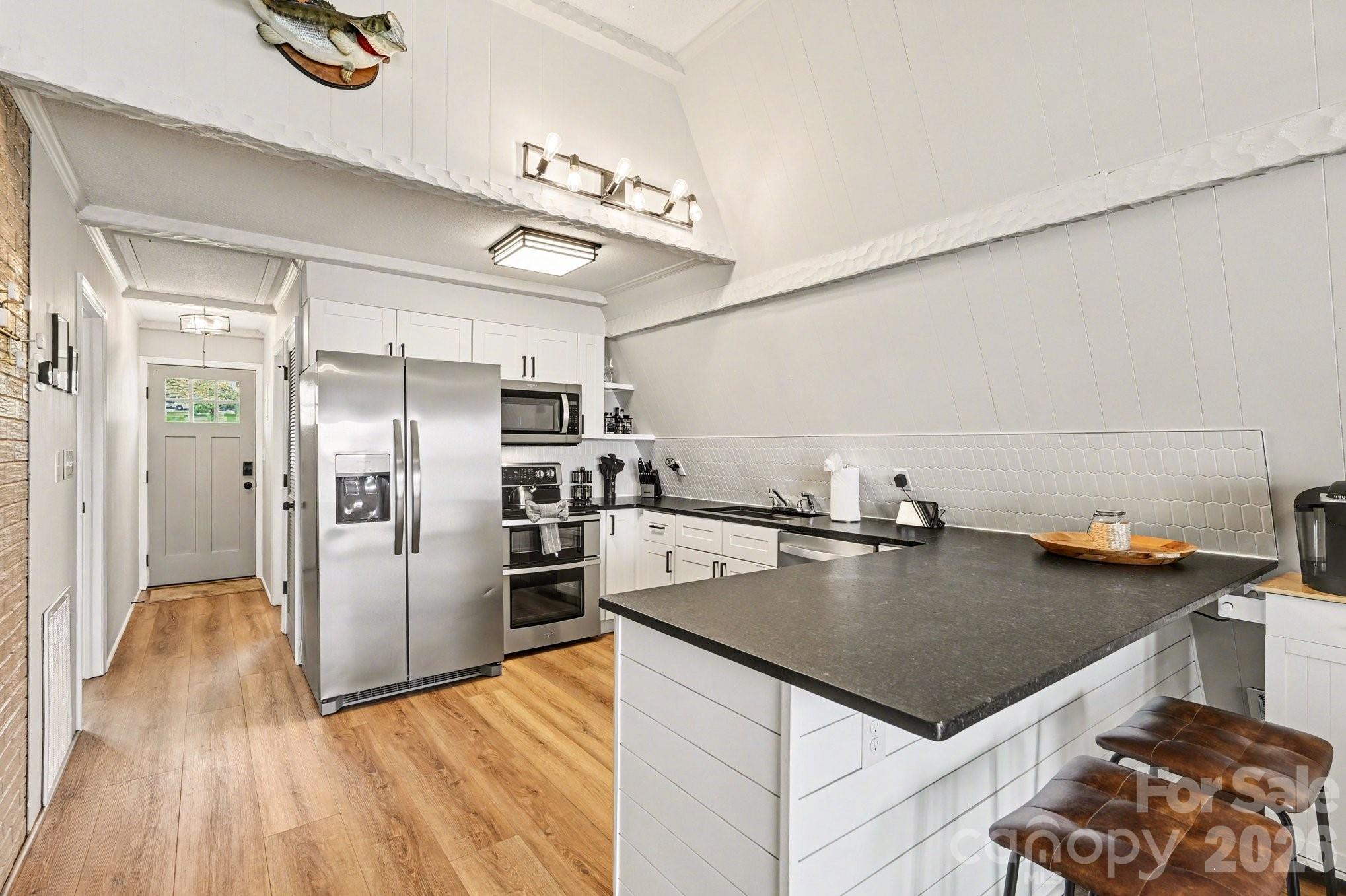 Inside, you’ll feel like you’re on a yacht in this Lake Norman classic. You’ll be mesmerized by the close-up water views the moment you step inside. The ceilings soar, and the first-floor living space is bright, open, and comfortable. The home has been lovingly renovated with new wide luxury vinyl plank flooring throughout. The kitchen features newer stainless steel appliances, white shaker cabinetry, black leathered granite countertops, and a stylish backsplash. The primary bedroom and a full bathroom are conveniently located on the main level, along with a laundry area. Upstairs offers two additional bedrooms and another full bathroom along with locked owners closet storage closets.