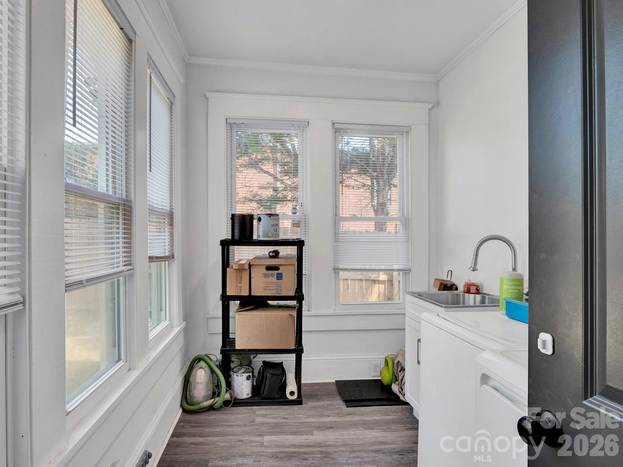 The bright and airy living room is filled with natural light from oversized windows. The primary suite offers a private ensuite bath, complemented by two additional bedrooms and a full hall bath. A dedicated laundry room with utility sink and space for extra storage adds everyday convenience.