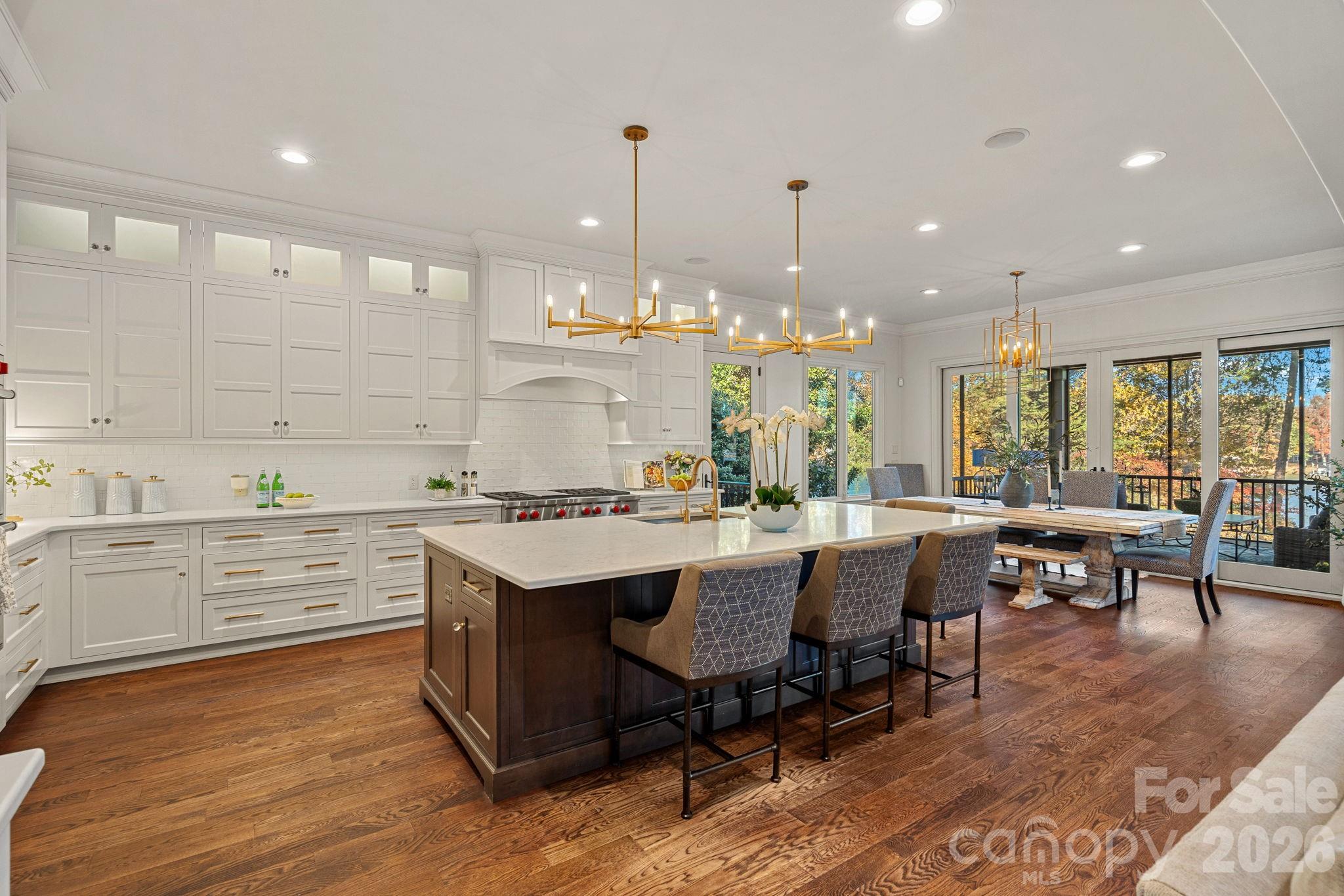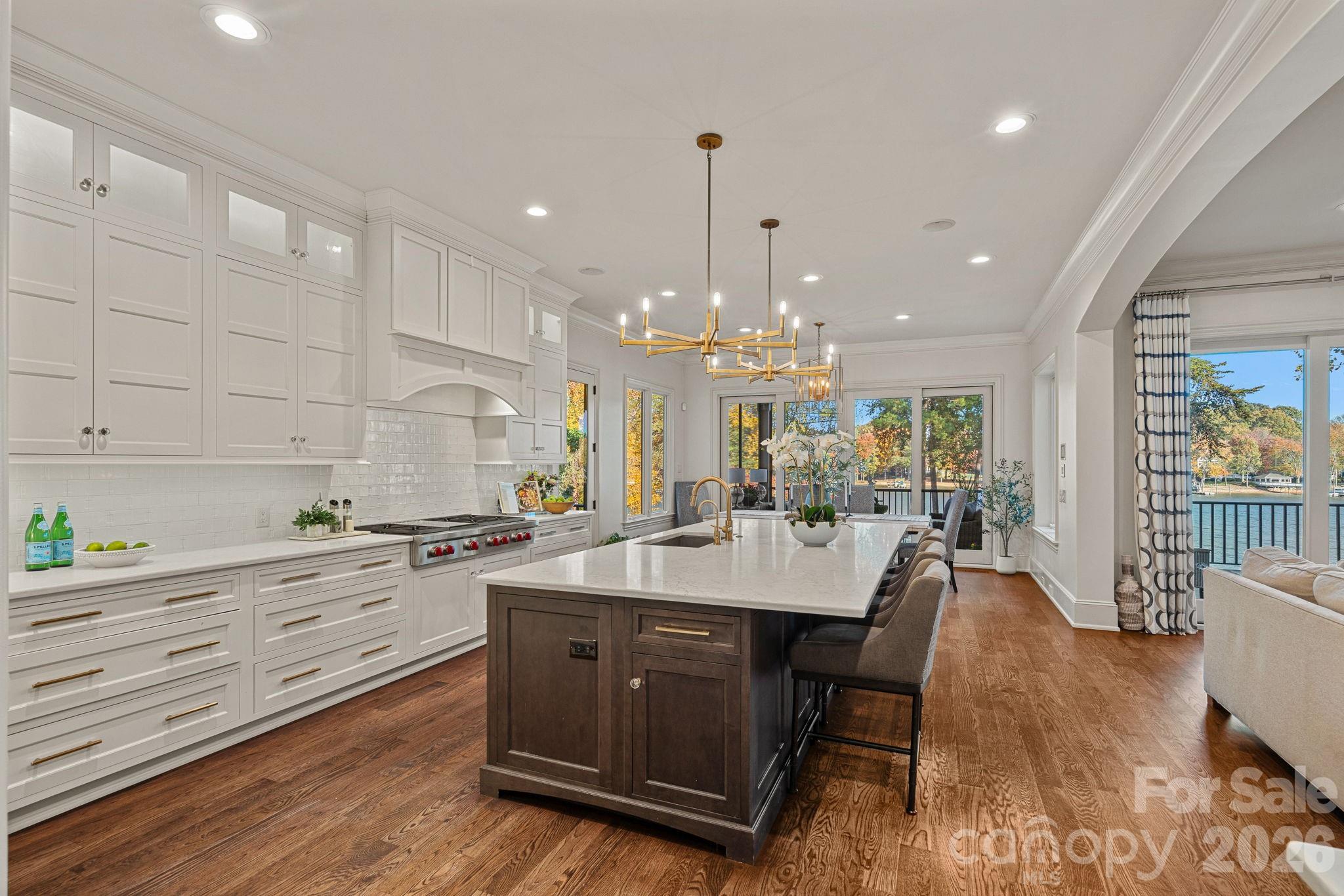 At the heart of the home, a chef’s kitchen with an open-concept layout flows seamlessly into a warm, inviting hearth room, creating the perfect setting for gathering. Expansive windows frame long-range lake views, while multiple outdoor living spaces—including a screened porch, covered veranda, grilling terrace, and an expansive terrace for alfresco dining—extend the living experience outdoors.
