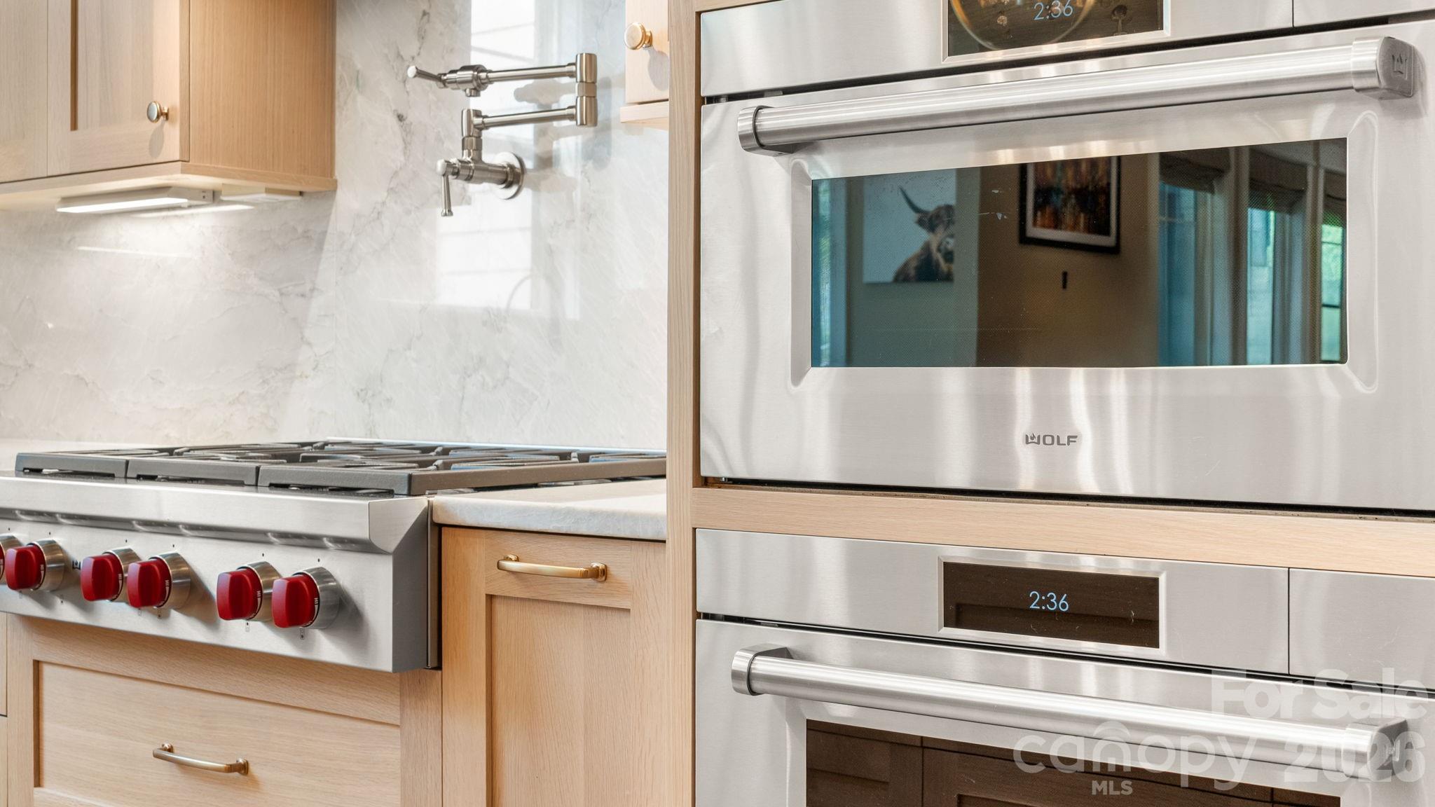 The chef’s kitchen is a true showpiece, outfitted with top-of-the-line Wolf appliances including double steam ovens, a 36” six-burner range with wok grate, microwave drawer, and a powerful 1200 CFM vent hood, complemented by a Bosch 800 Series dishwasher and refrigerator. The space is anchored by stunning 3CM Blanco California quartzite countertops and backsplash with custom quarter-sawn white oak cabinetry that extends throughout the kitchen, pantry, built-ins, and even the half bath.