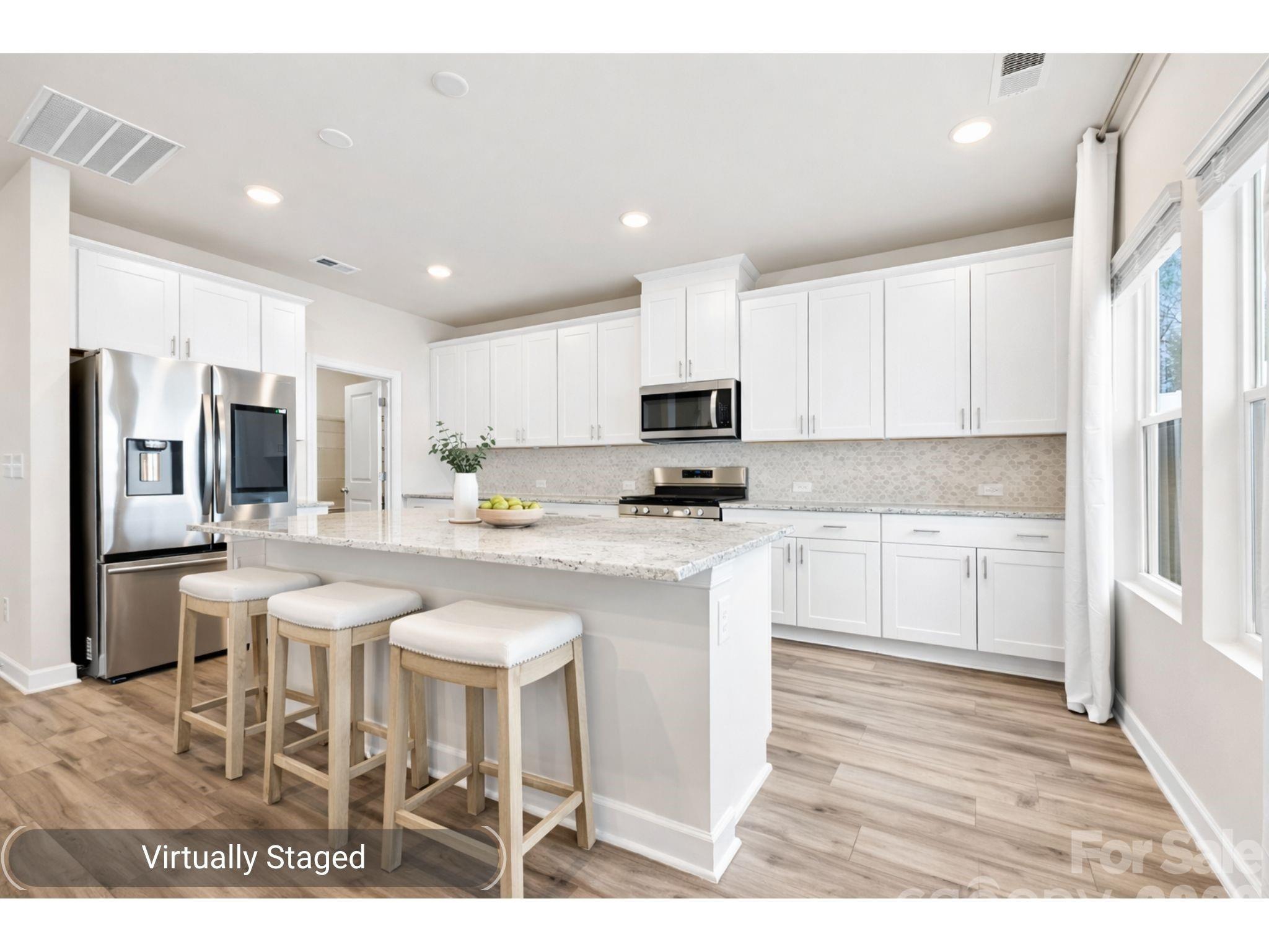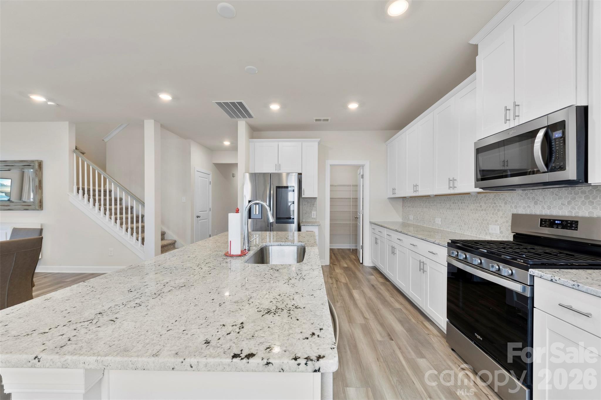 The open-concept main level features a spacious living area filled with natural light and a well-appointed kitchen complete with a large island, granite countertops, 42” cabinetry, walk-in pantry, and gas range with air fry and convection cooking. Luxury vinyl plank flooring throughout the main level provides durability and easy maintenance, while a convenient drop zone adds everyday organization.