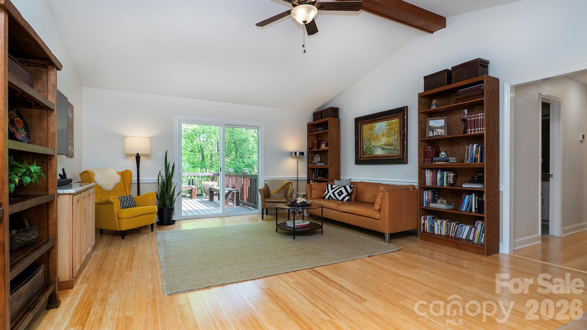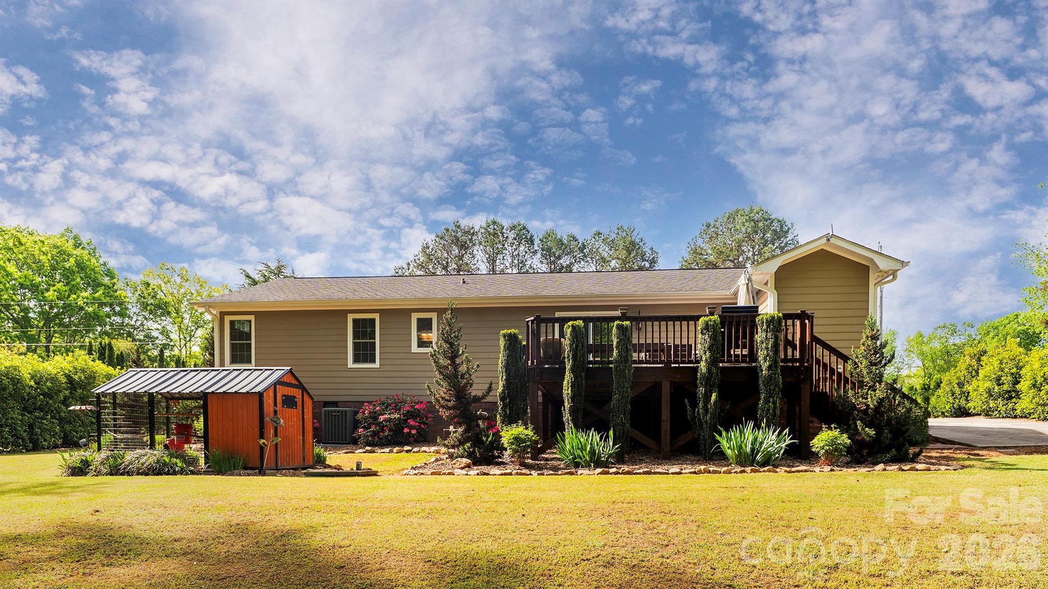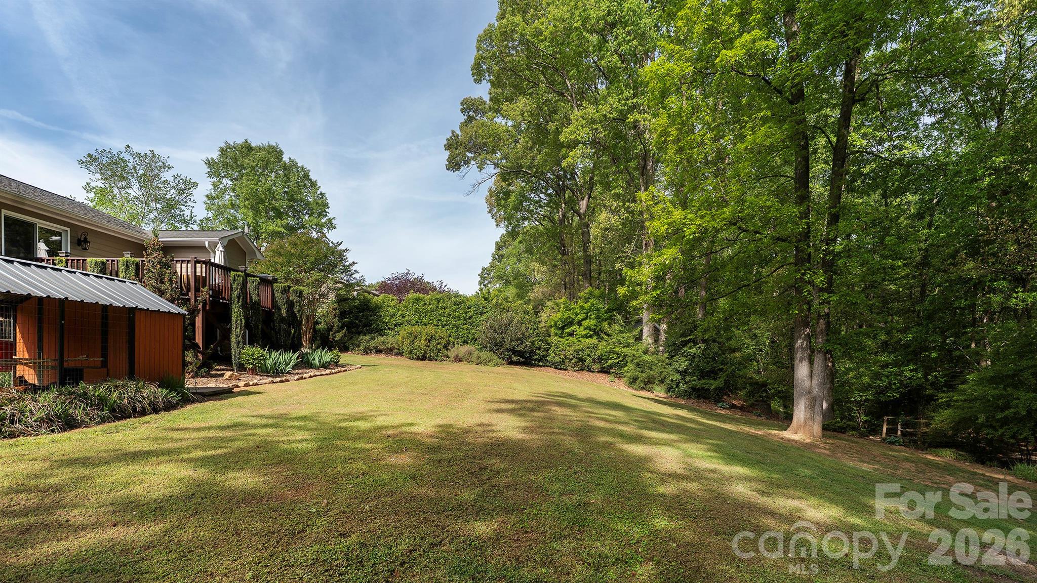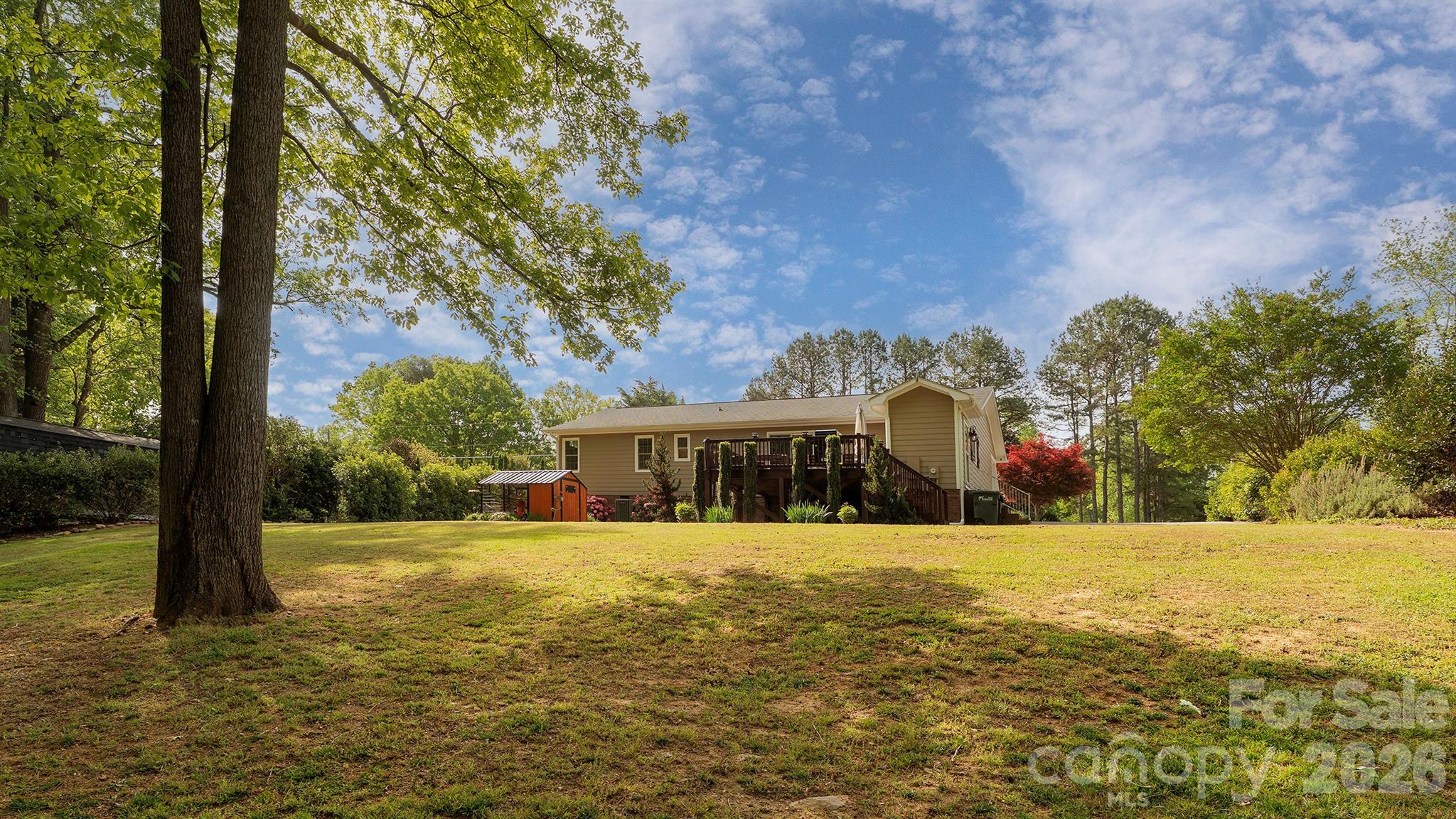 This beautifully updated home delivers a modern, move-in-ready lifestyle with thoughtful upgrades inside and out. Bright, open interiors are anchored by a vaulted great room, inviting dining area, and updated kitchen with stainless appliances, quartzite countertops, and peninsula seating for easy daily living and entertaining. Bamboo flooring flows through the main living spaces for a clean, cohesive look. The primary bedroom stands out with transom windows and custom California Closet shelving for natural light and organized storage. Both full baths feature granite countertops and marble-style tile floors, and the laundry room continues the same finish for durability and design continuity. Outside, the 0.75-acre homesite feels like a private retreat with professionally designed all-season landscaping, a cedar deck, custom benches, grill station, broad lawn, mature trees, winding creek, two footbridges, and a fire-pit area, all with convenient access to Charlotte.