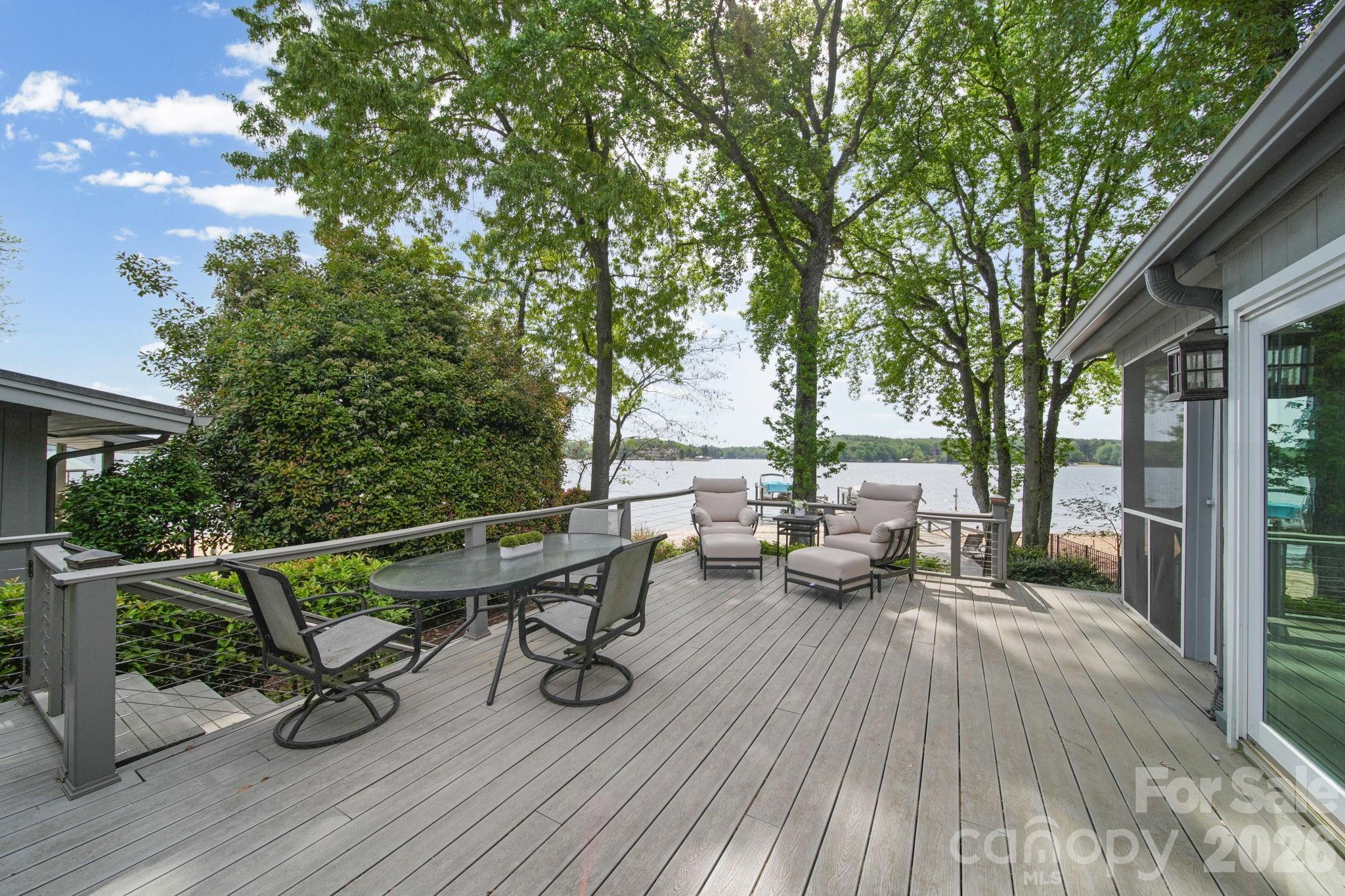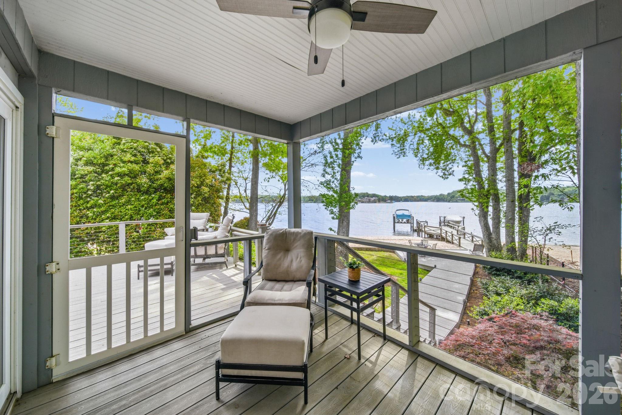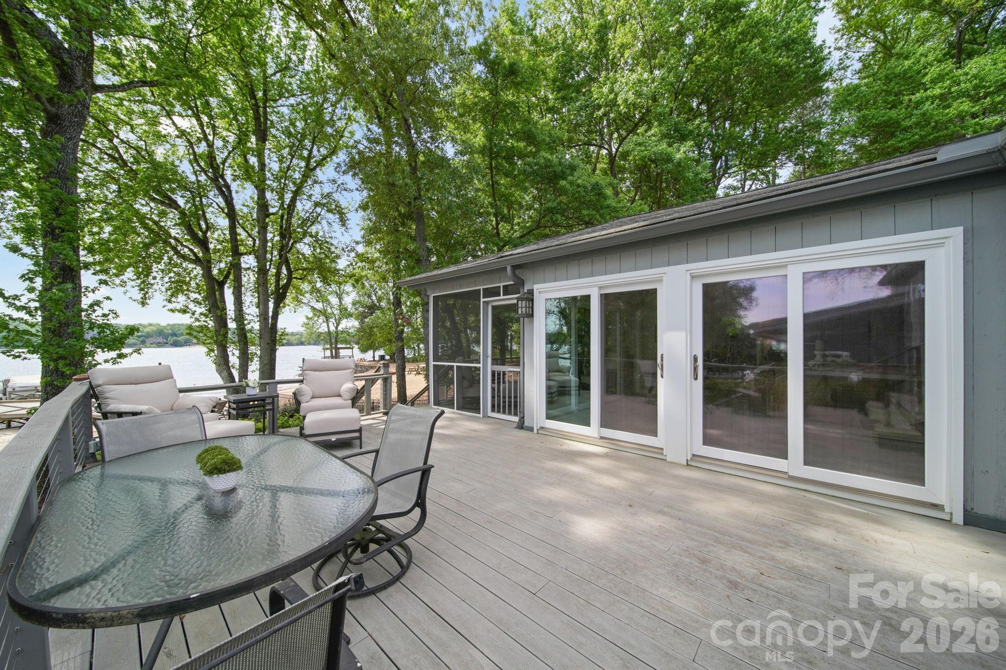 Outdoor living is where this home truly shines. A huge composite deck and walkway lead to a spacious patio area overlooking the water, complemented by a screened porch for year-round enjoyment. The shared dock (with neighbor) includes a boat lift, making lake days effortless, and irrigation keeps the landscape looking its best.