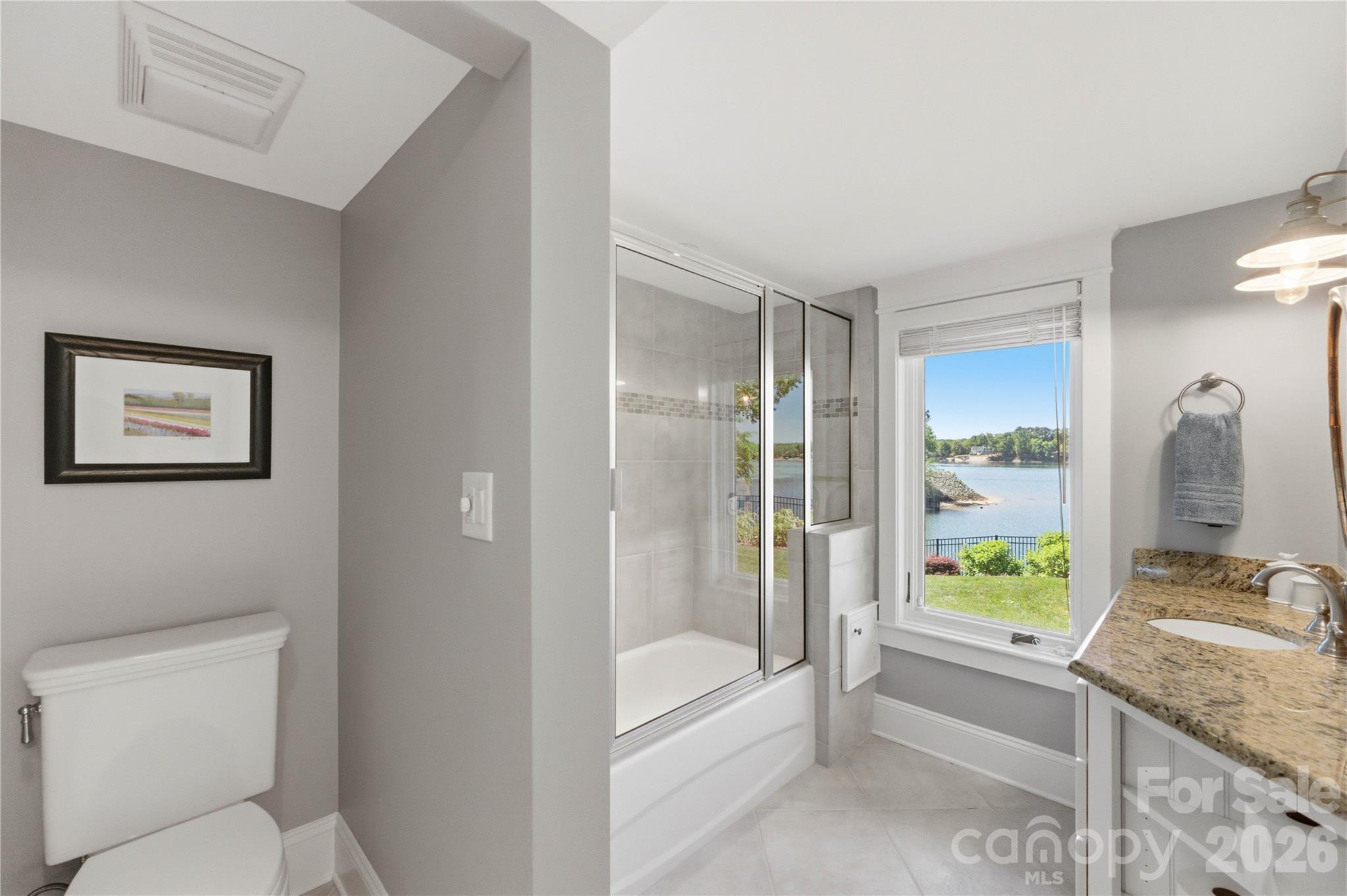 - Grand primary suite offering glorious lake views, dual custom closets, a spa-caliber bath with heated floors, dual vanities, soaking tub, large walk-in shower, and the convenience of an adjoining laundry