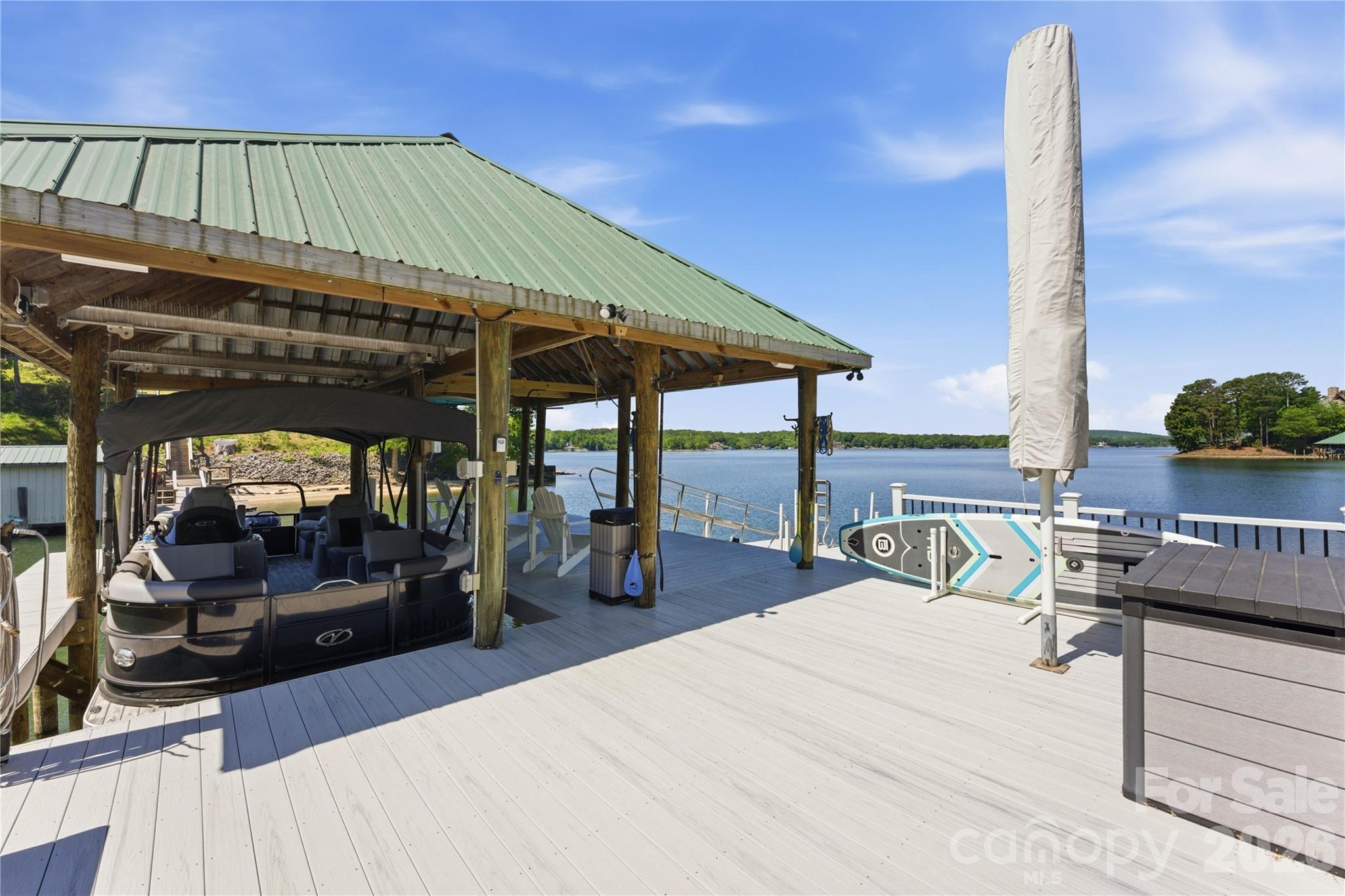 - Covered composite dock with boat lift, seating area, and floating dock