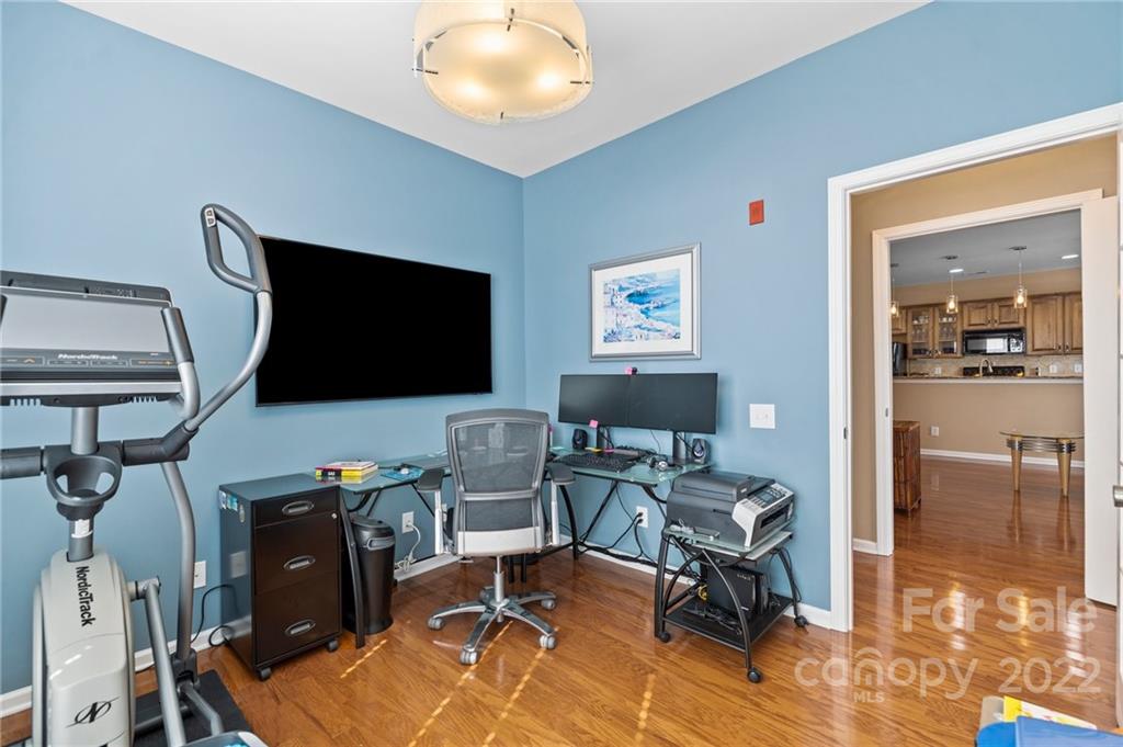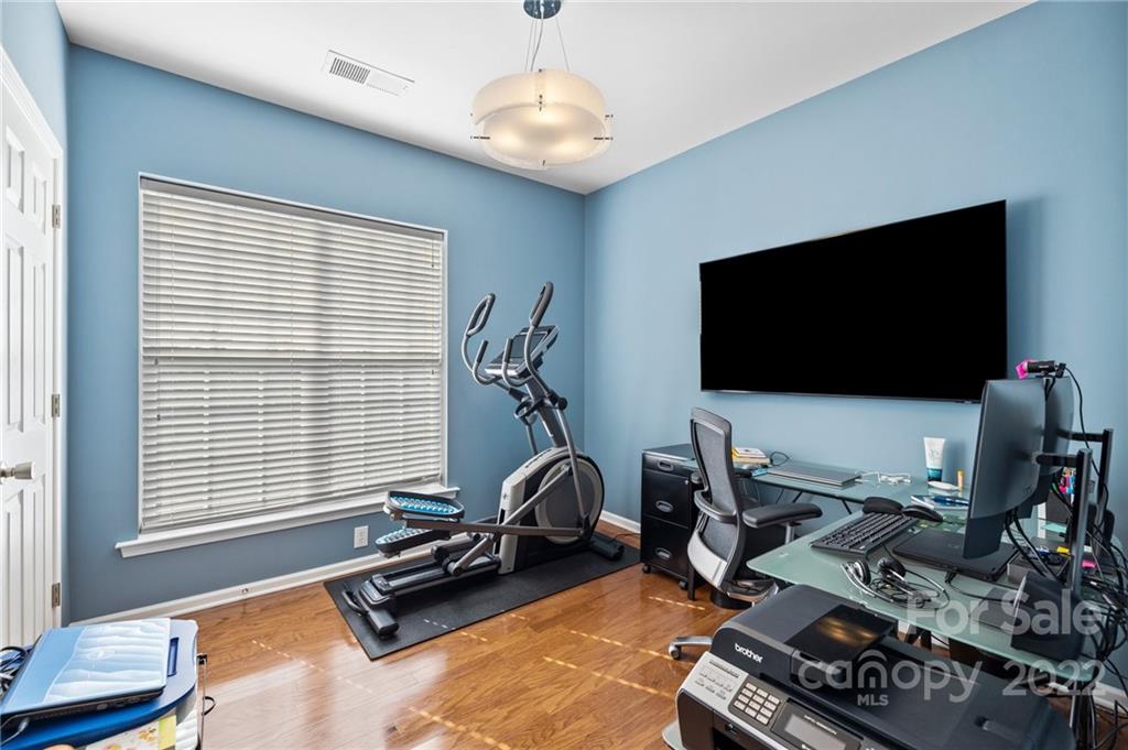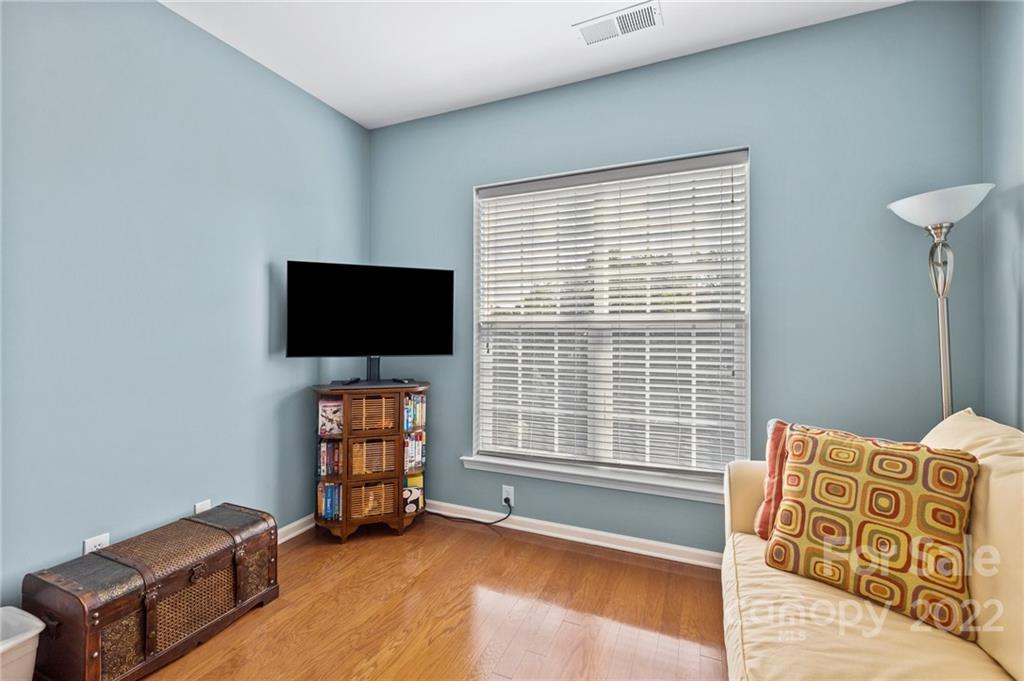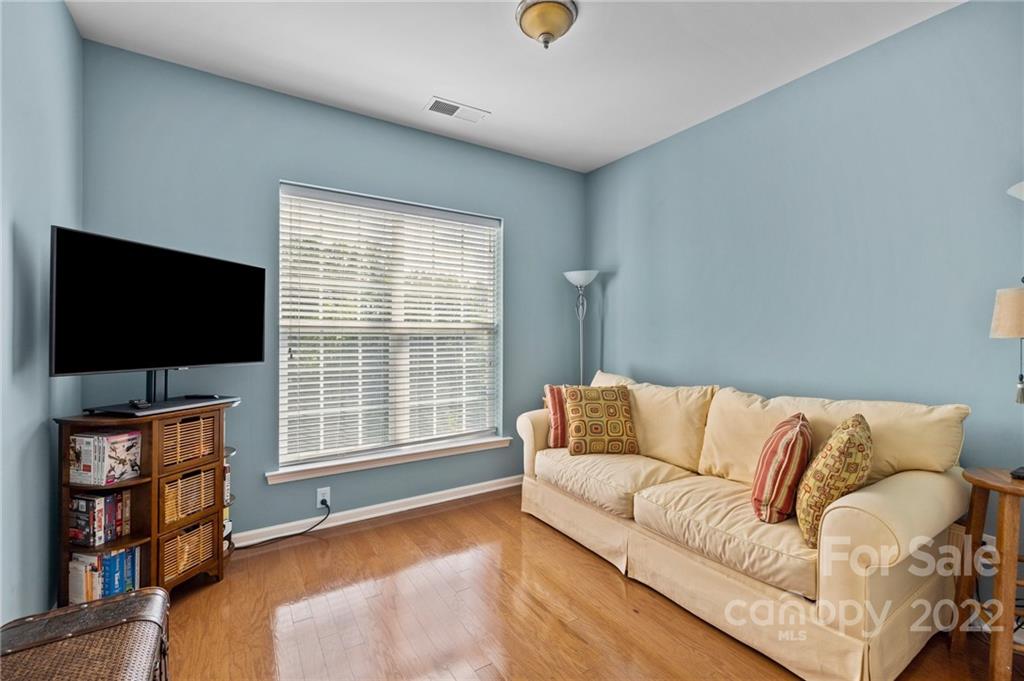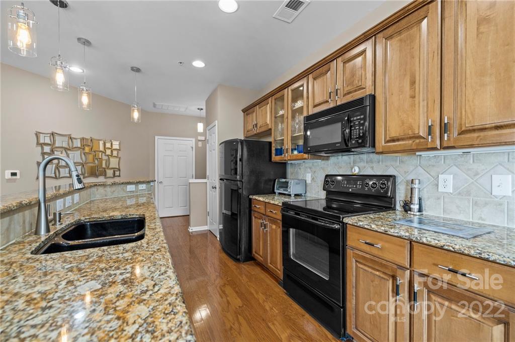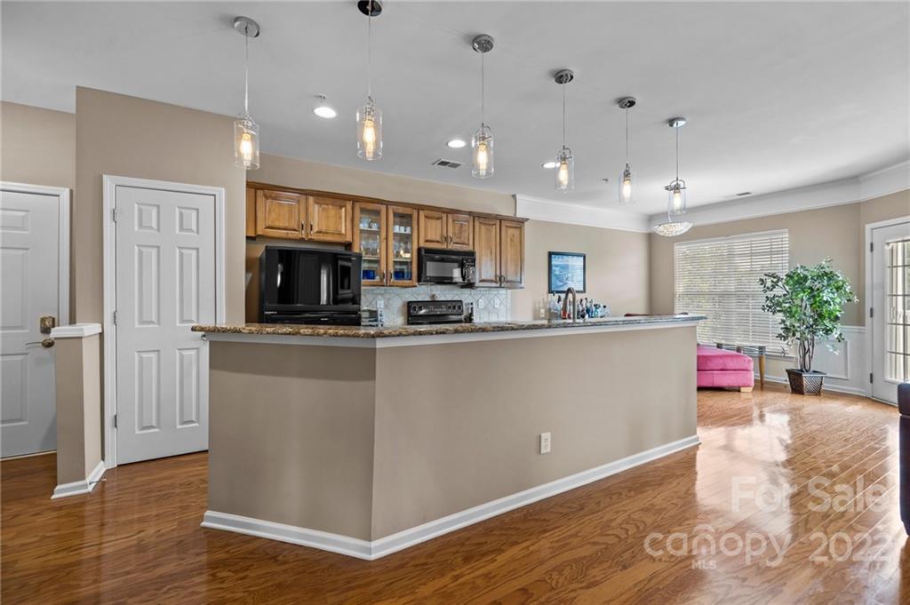 Location, Location, Location! Located in the Heart of Ballantyne, in the exclusive gated community of Belle Vista, this top floor, corner location offers wonderful privacy along with unobstructed views of the pond, fountain and the wooded backdrop. This condo is in pristine condition, featuring hardwood floors, granite countertops, updated light fixtures, , and a new (2021) HVAC. Master Bathroom features a double mirrored barndoor entrance, frameless shower with mosaic tile accents. Both Bathrooms and the Laundry Room are tiled. Community Pool and Veranda/Clubhouse.