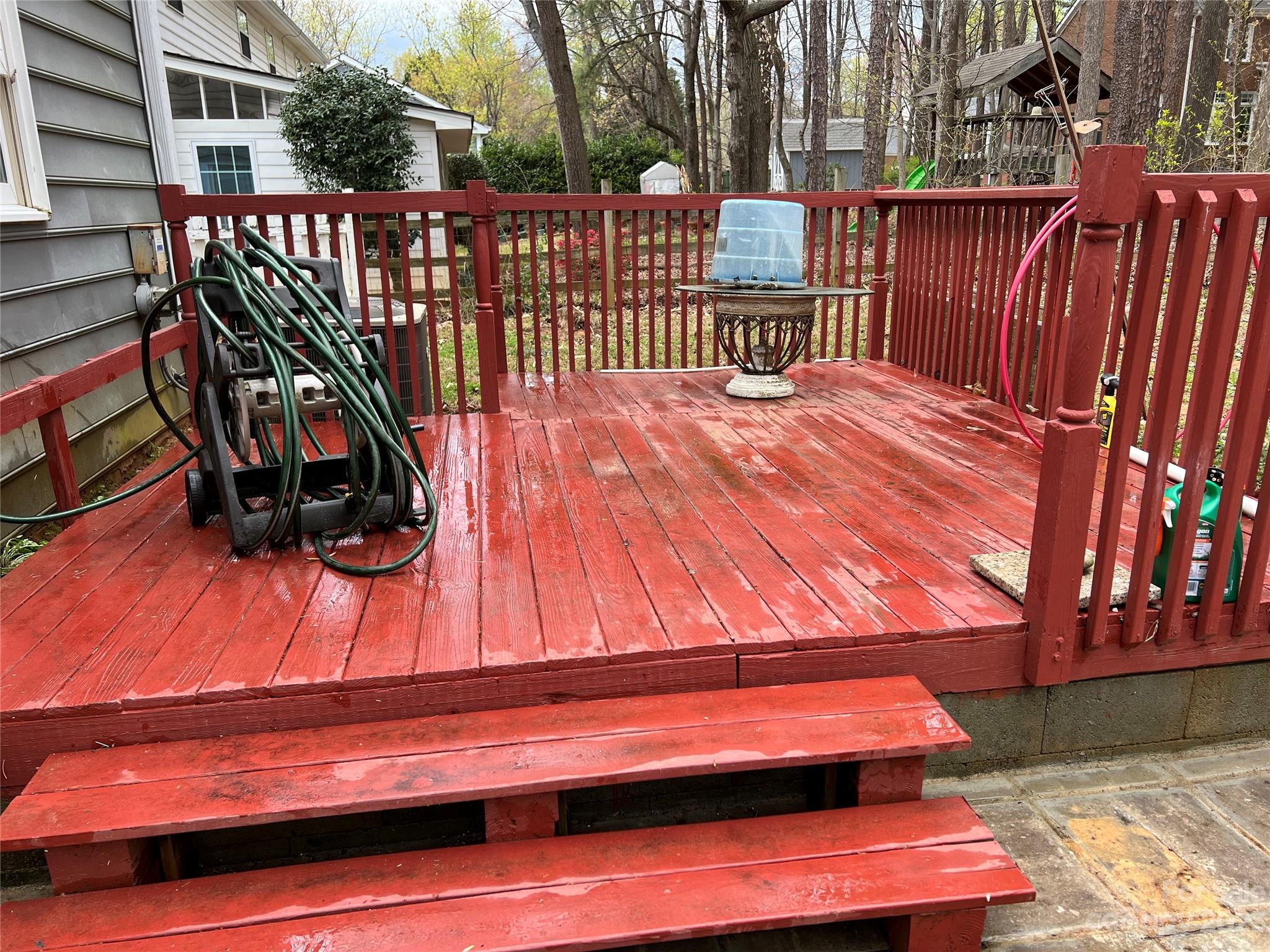 Outside back has motion sense light. You can enjoy green, flowers, plants & relax on thefront porch.