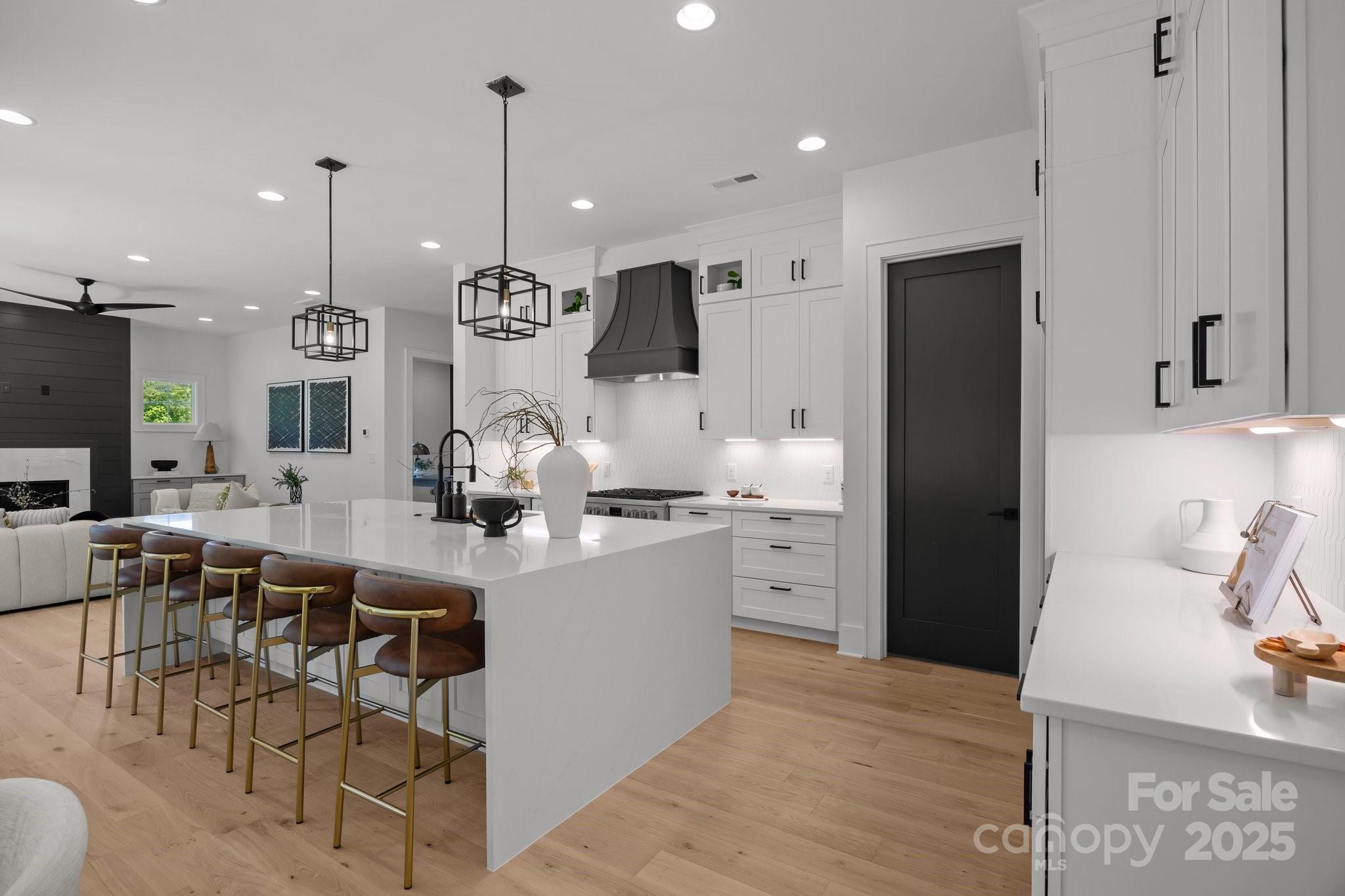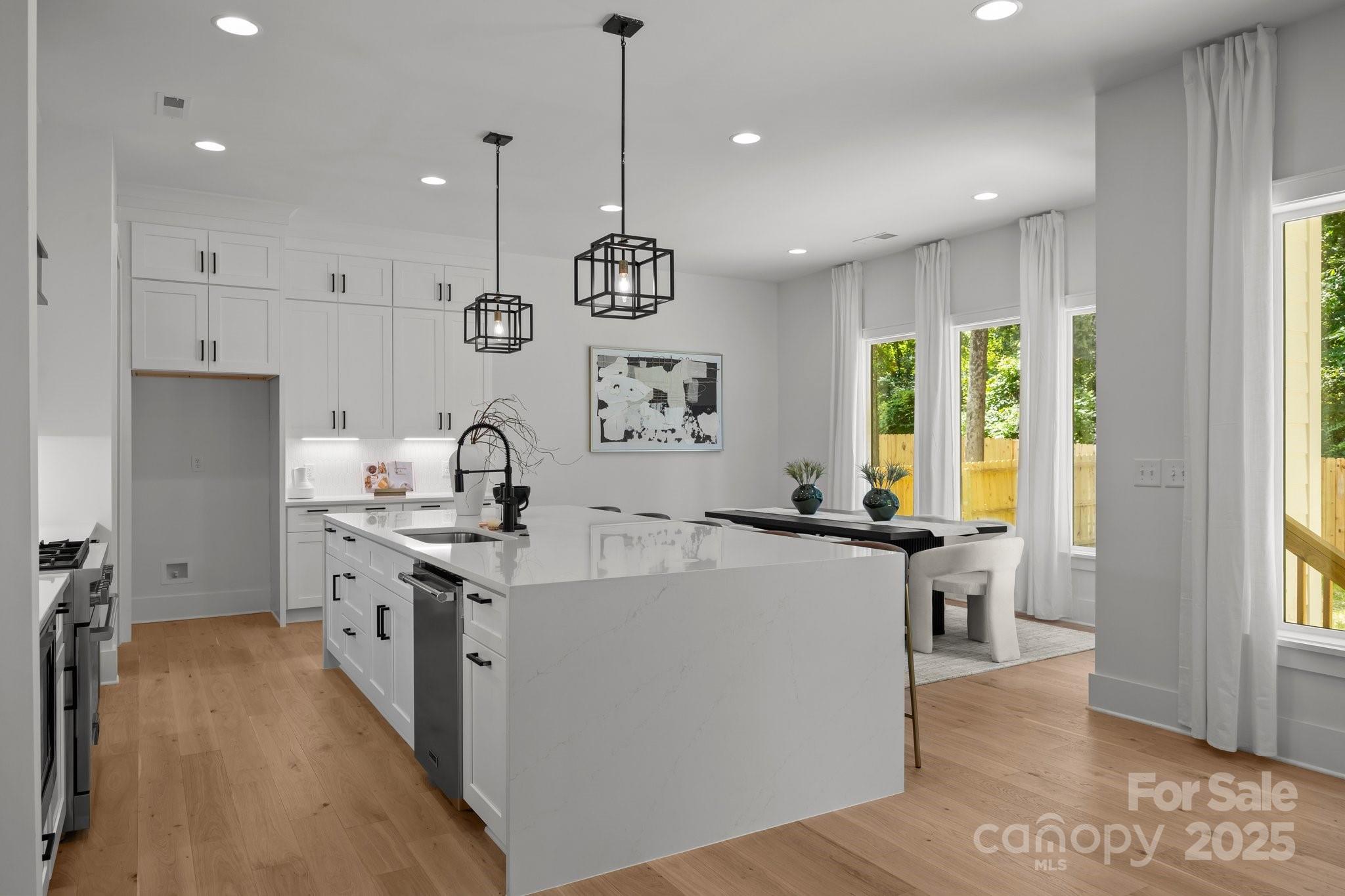 The open-concept main floor features a spacious living area with designer lighting and large windows that flood the home with natural light. At the heart of the home, the kitchen shines with quartz countertops, stainless steel appliances, custom cabinetry, and an extended island—perfect for both everyday meals and entertaining guests.