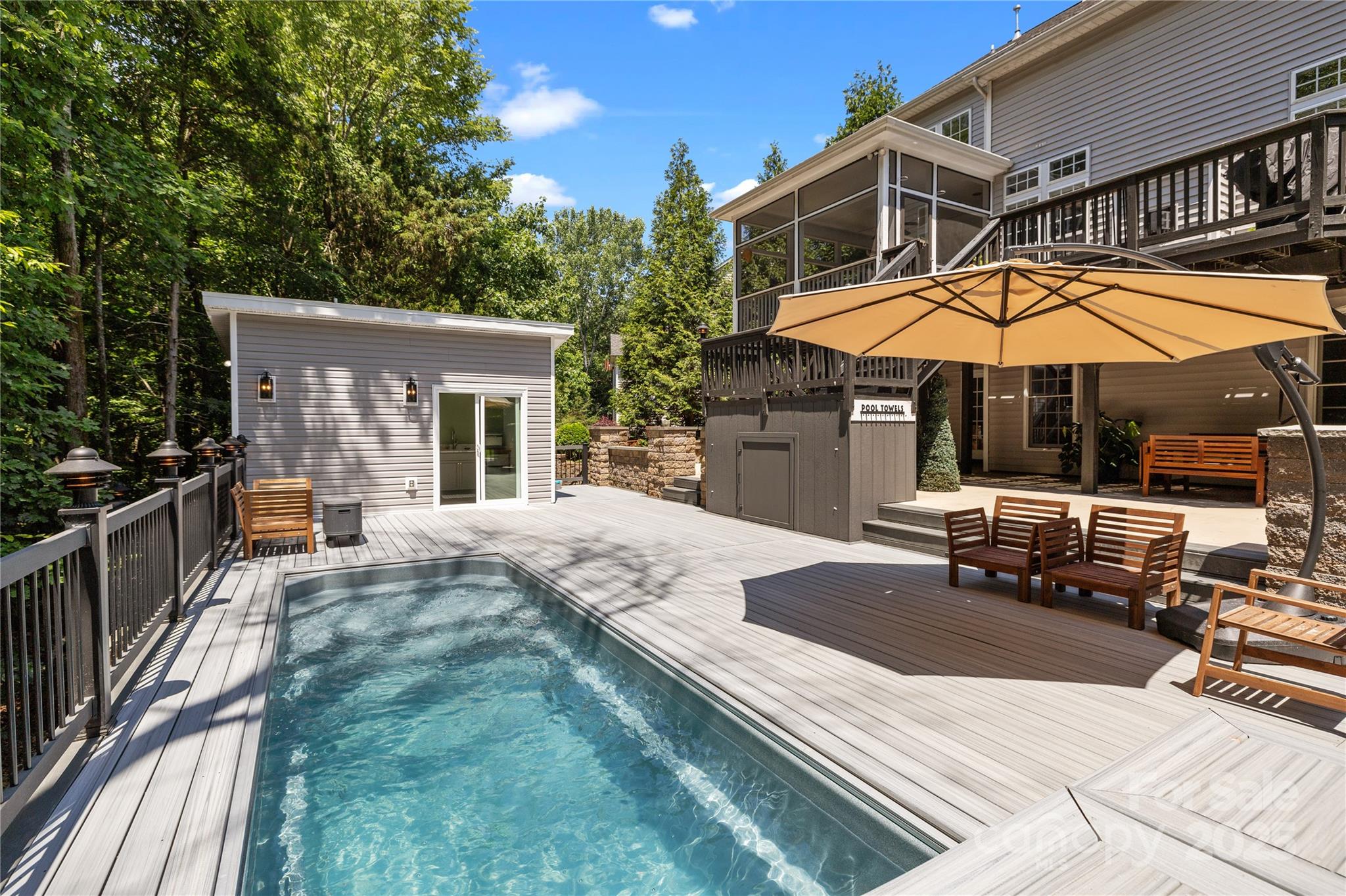Experience high class living w/this 5BR/5.5BA Move In Ready Beauty in sought-after Canterbury Place. This expansive home has 5500 sq ft w/fully finished basement & 2nd living quarters plus an outdoor oasis w/heated salt-water plunge pool & pool house surrounded by Trex Decking and “Turfed Backyard” for recreation & entertaining. 2-Story grand entrance & 2-Story Great RM, Formal Dining RM & Office, Open floor plan, modernized kitchen w/Double Ovens & Gas Cooktop + Sun Room overlooking the amazing backyard + Screened Porch & Firepit Area! Primary BR + 1 Upper BR have California Closets. Basement w/recreation living area & gas log fireplace, 2nd Primary BR w/Huge walk-in closet, dual sinks bathroom w/tub & separate shower, Media Room w/Murphy Bed & Large Wine Storage/Tasting Room + Lots of additional storage. Home has water purification system. Top-rated schools. This property represents exceptional value in a prime location. Don’t miss this opportunity, schedule your private tour today!