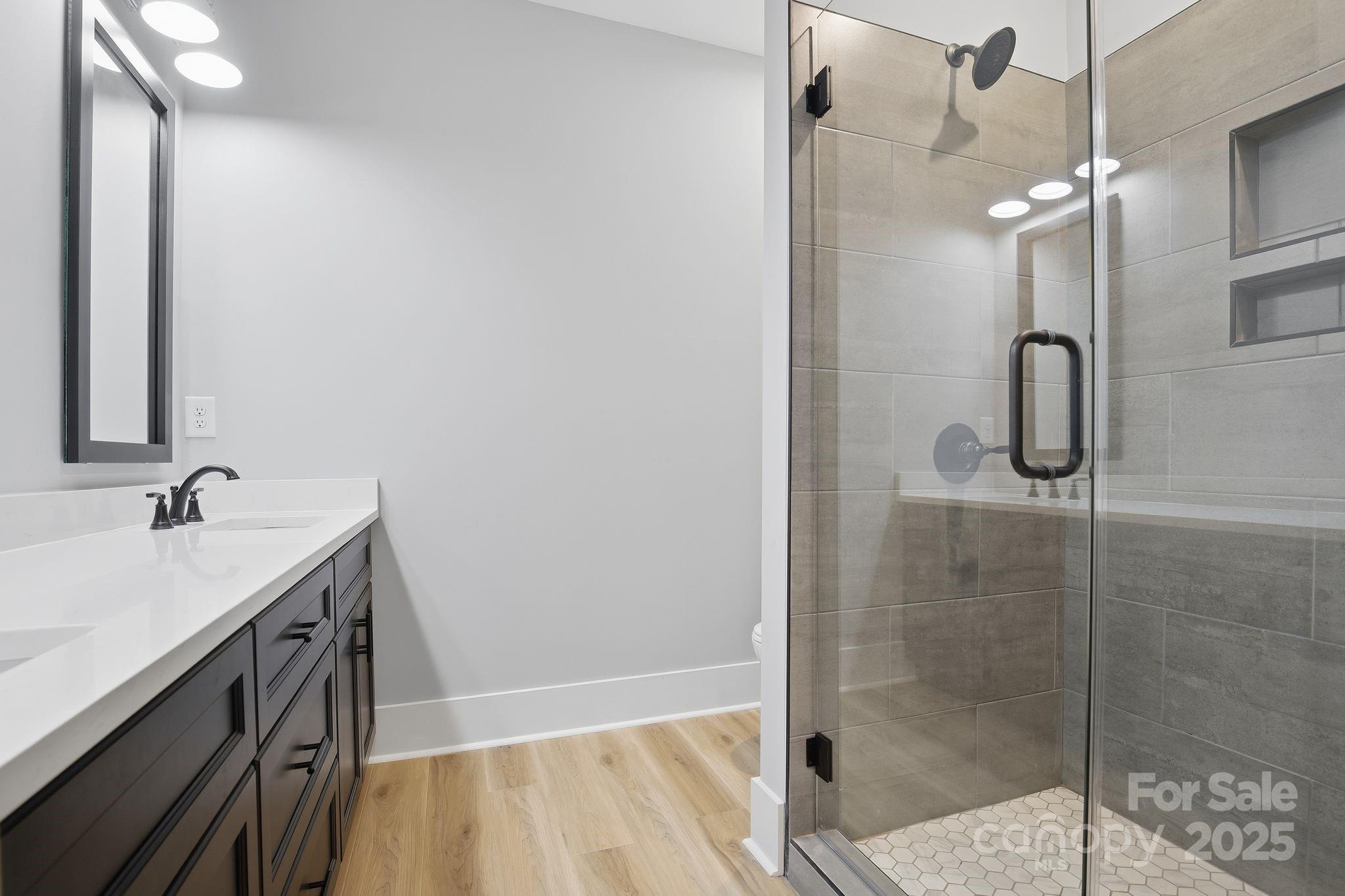 The main-floor primary suite offers a relaxing retreat with dual vanities, a walk-in shower, and a generous walk-in closet with direct access to the laundry room for added convenience.