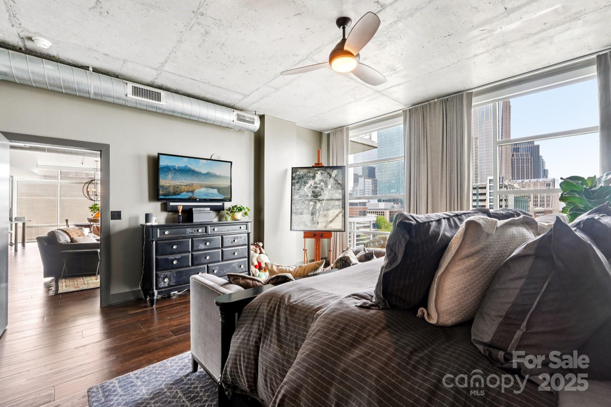 Iconic curved wall of floor to ceiling window and 10 foot ceilings make this a WOW view of the skyline and sunsets. This is a rare opportunity to own the ultra-desirable "01" unit on a high floor. Features include an oversized balcony with a dramatic views. Courtside was the first high-rise residential tower in Center City and has some hard to find features including above the typical square footage and room sizes. The Primary bedroom has a wall of floor to ceiling windows and is huge by city standards. The second bedroom and separate office are also very large. The open living area will shock you with its size. Newer hardwood floors shine and are a quality upgrade. Custom walk-in closet and tile bathroom features are highlighted in the primary ensuite bath. This is a secure entry building with 2 assigned parking spaces in the secure parking deck. Other amenities include a rooftop terrace and Amazon HUB on site for extra convenience. Just one block from a light rail stop.
