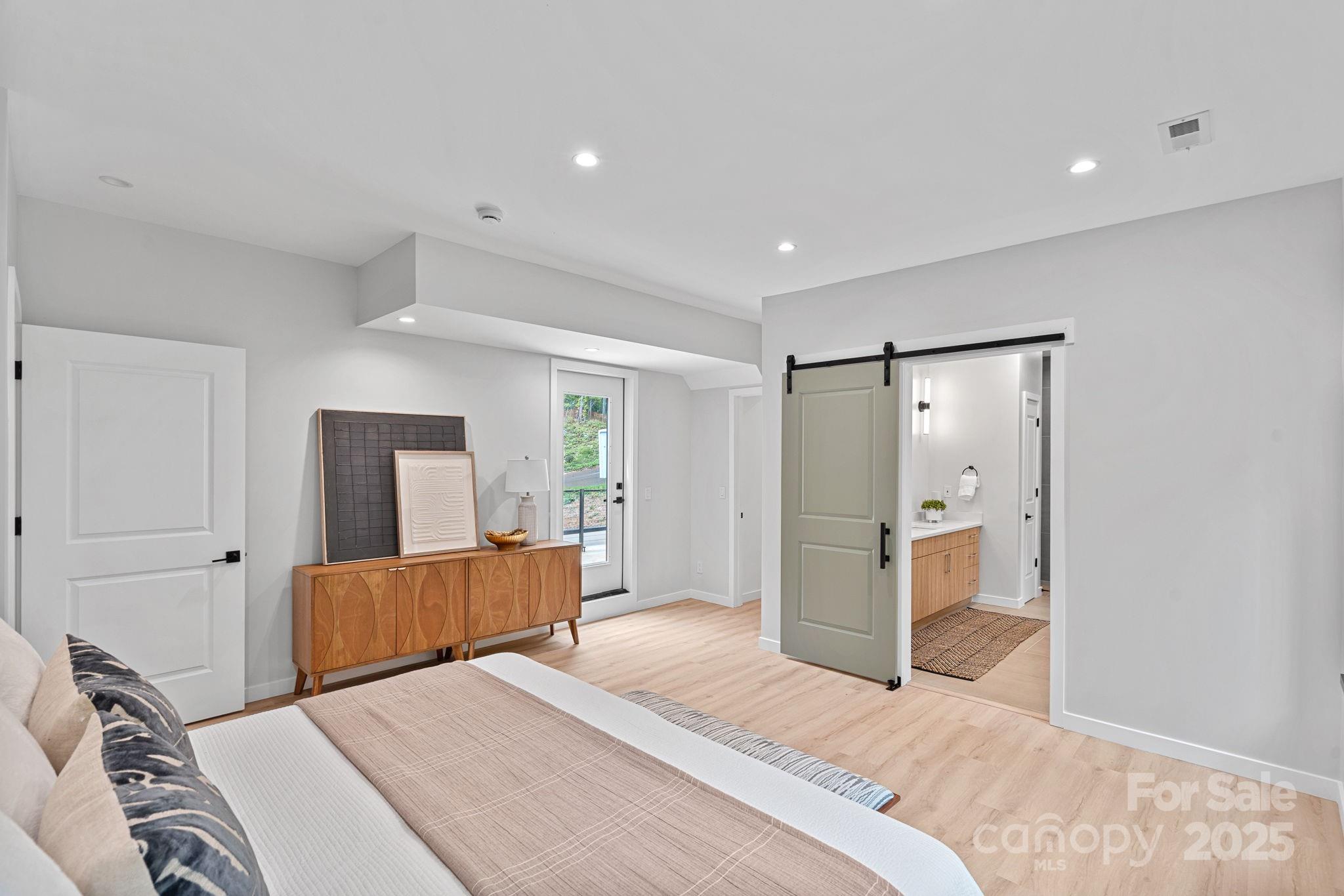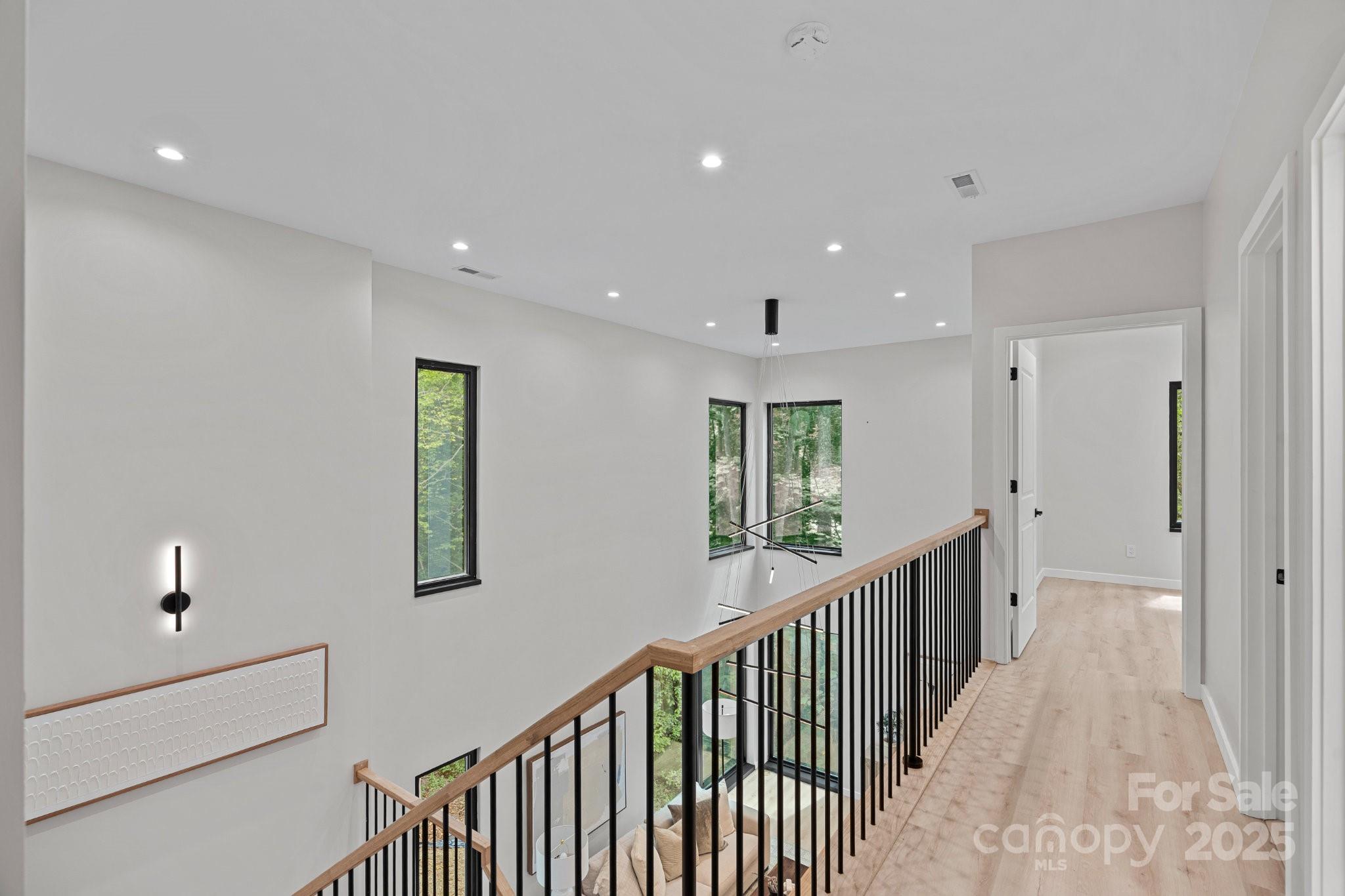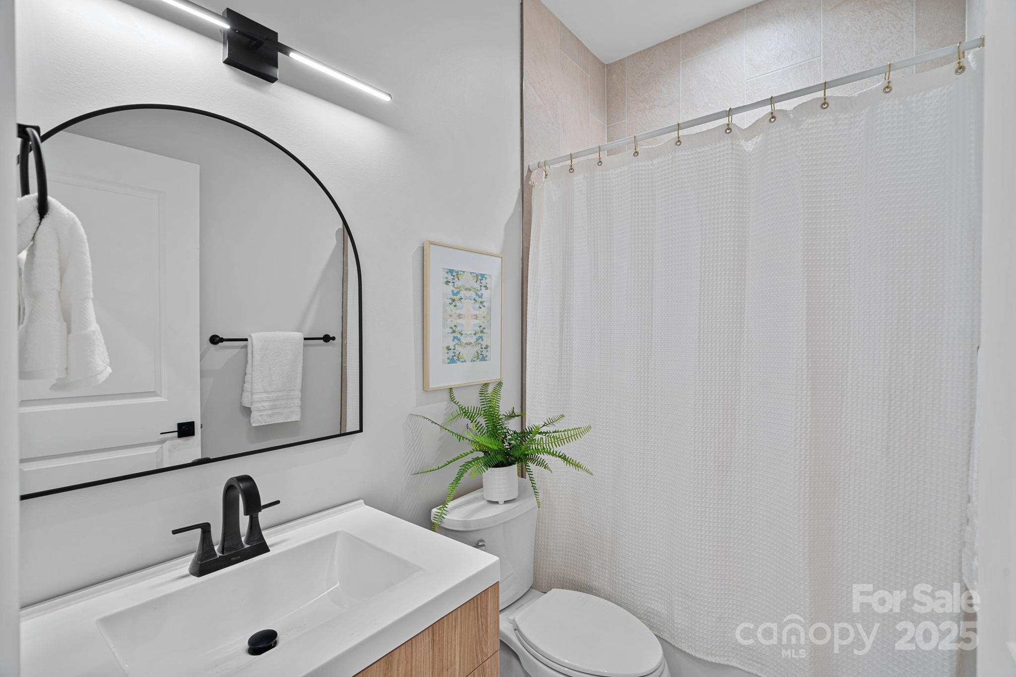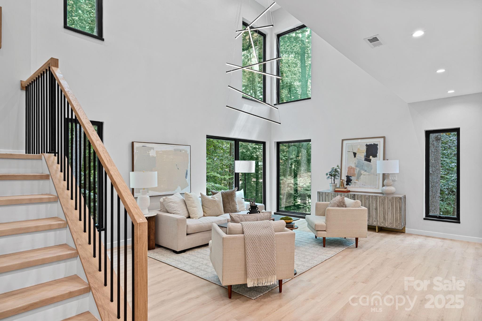 This architect-designed modern sanctuary sits on a private, oversized 0.76-acre wooded lot just 15 minutes from Uptown Charlotte, offering true seclusion for those who value peace and privacy. The open-concept main level features thoughtful craftsmanship, clean lines, and double-height windows that invite the outdoors in—creating a treehouse-like experience where you feel immersed in the woods. A spacious paver patio extends the living space outdoors, perfect for relaxing in a tranquil setting. Upstairs, three well-appointed bedrooms include a luxurious primary suite with a private balcony. The finished ground level offers a separate living area and a fourth bedroom with a private bath—ideal for guests or a dedicated work-from-home space. An attached two-car garage adds everyday convenience. Located directly across from the upcoming Cross Charlotte Trail extension, this home blends refined design, wooded views, and easy access to trails, greenways, and quiet connection with nature.