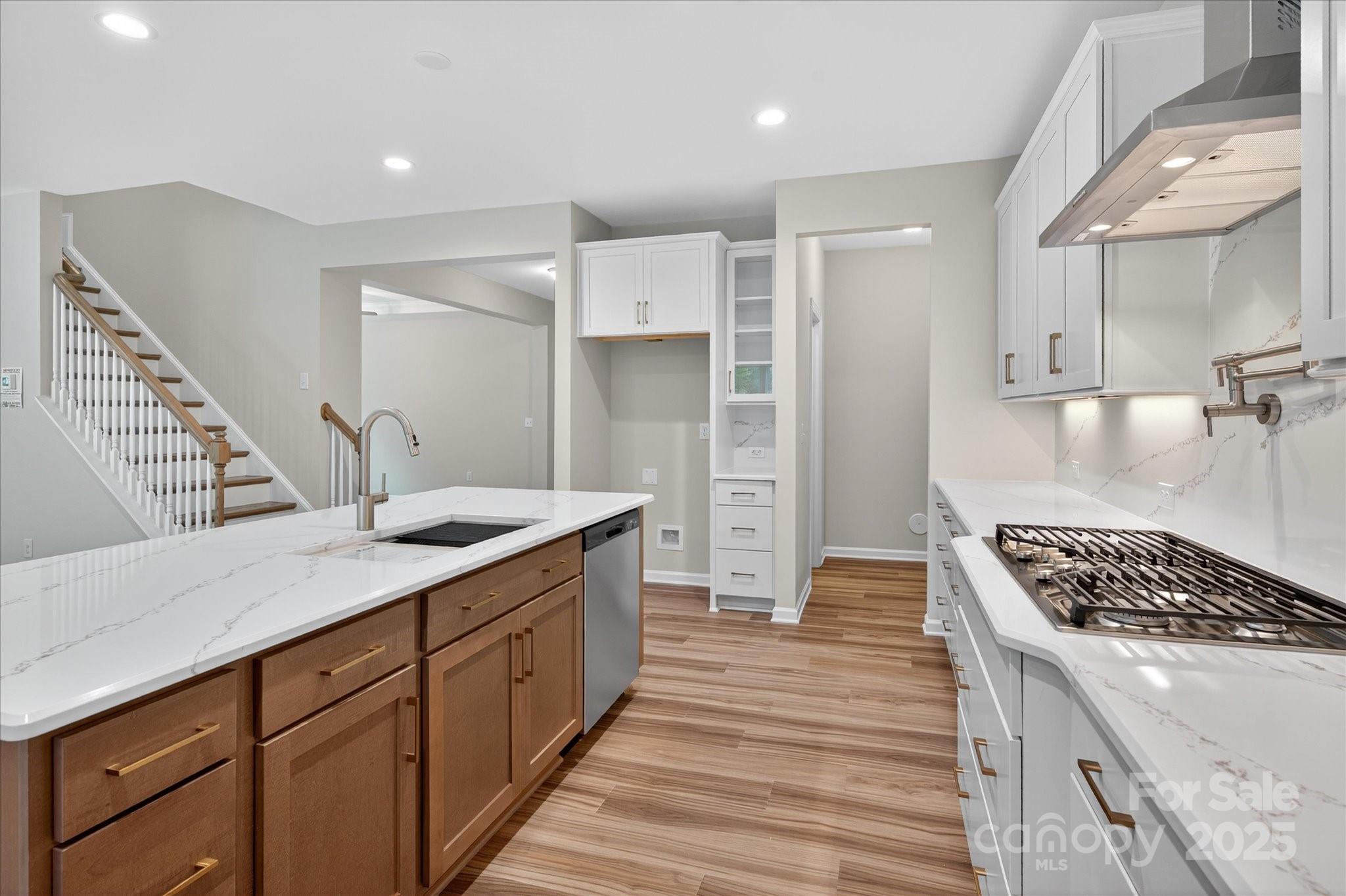 1.5-story home with open layout. Enjoy a wooded view from the rear covered extended patio, which has a gas line for grill. Kitchen features split cooking, GE Profile Stainless Steel 36" gas cooktop, GE Stainless wall mount chimney hood that vents to the outside, and Profile Stainless Steel Micro/Oven combo. Beautiful 42" soft-close cabinets in elegant white cabinets and wood island, quartz counter tops and backsplash, double trash pullout, pot filler, under cabinet lighting and several drawer stacks. Spacious dining area, and Family Room has a vaulted ceiling. Second floor has open Rec Room, guest bedroom, and full bath. Flex room off foyer can be a home office. Main floor Primary Suite! Tucked off the foyer is a mudroom with space for a drop zone, and laundry room with sink. Oak treads on stairs. All baths have quartz counters, tiled floors, and raised-height vanities. Home includes a tankless hot water heater and radiant barrier sheathing to maximize energy savings. Minutes from Reedy Creek Park.