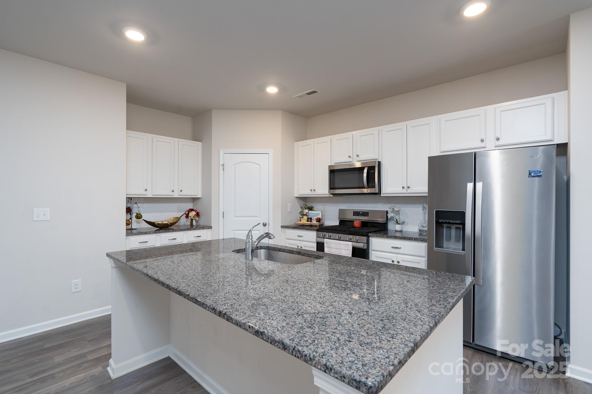 Step inside to a bright, open-concept main level featuring a primary suite on the first floor, complete with a walk-in closet and spa-inspired bath with dual sinks and a walk-in shower. The kitchen is a chef’s delight with granite countertops, stainless steel appliances, a stylish tile backsplash, and a large island that opens to the dining and living areas—perfect for entertaining.