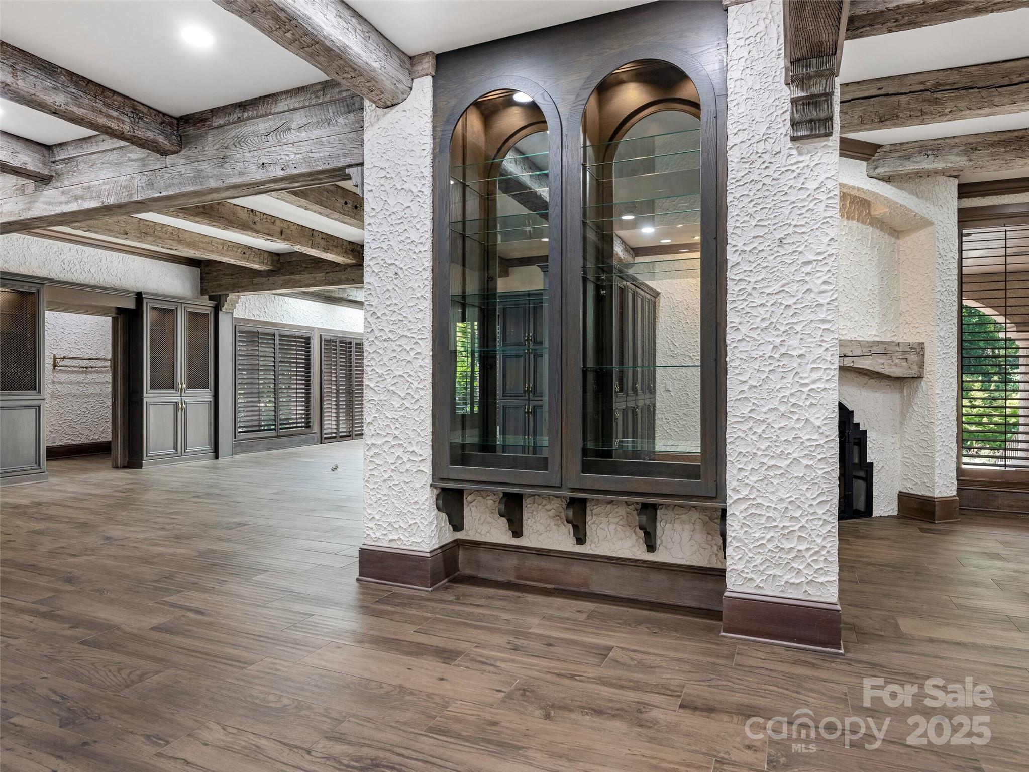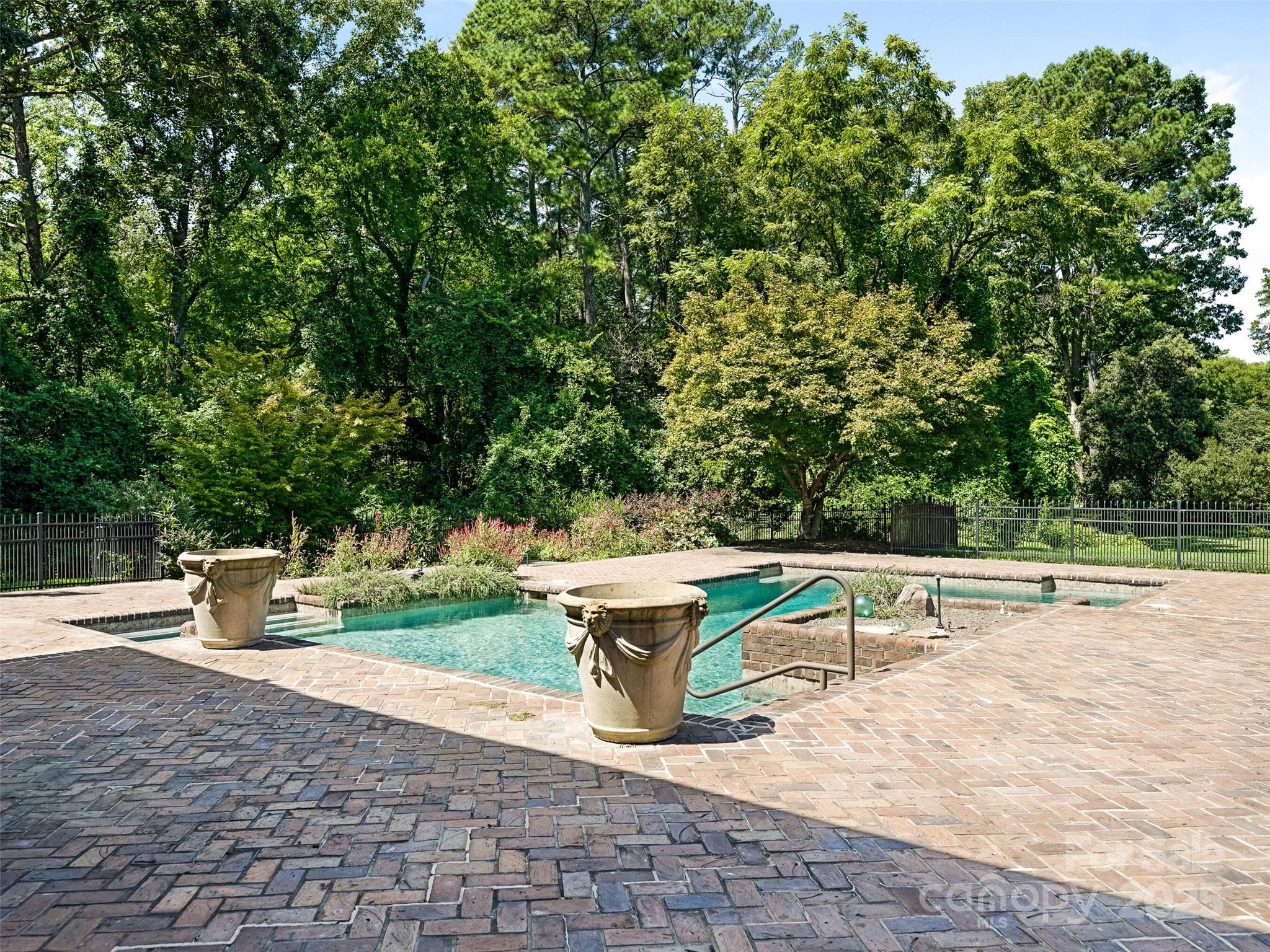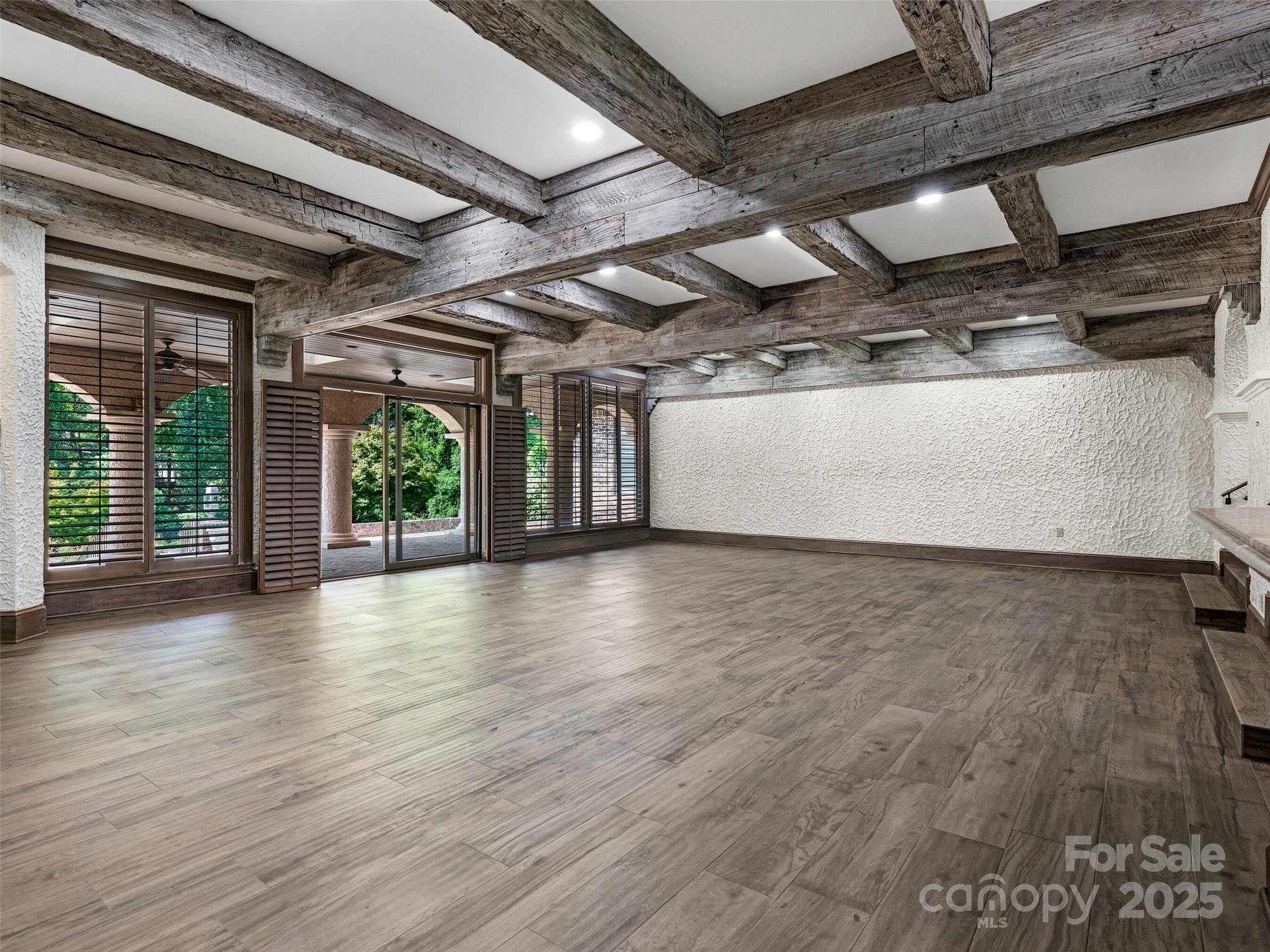 Exceptional Estate on Private Road - Welcome to this remarkable all-brick, 1-story estate offering nearly 6,000 sq. ft. of heated living space in one of South Charlotte’s most sought-after neighborhoods. Tucked away on a private road near Quail Hollow and Carmel Country Clubs, this residence blends timeless craftsmanship with modern comfort. Enter inside to high ceilings and stunning antique hand-hewn beams that anchor the main living spaces with warmth and character. The home boasts four bedrooms, four full baths and three half baths, along with abundant storage including a 1,200+ sq. ft. walk-up attic complete with a cedar closet. Multiple fireplaces create inviting gathering spaces plus, a dramatic wet bar in living room. Designed for both entertaining and everyday living, the floor plan flows seamlessly outdoors to expansive patios (with a 1/2 bath for the pool), a covered terrace and a sparkling pool—perfect for hosting or relaxing in privacy. A porte-cochere and four-car garage (with over 1,700sq ft) provide convenience and curb appeal. There is also a garage storage room and garage storage loft. Cedar shake roof and copper gutters compliment the exterior. This rare opportunity combines architectural detail, spacious design and a premier location—a true sanctuary just minutes from world-class golf, dining and shopping.