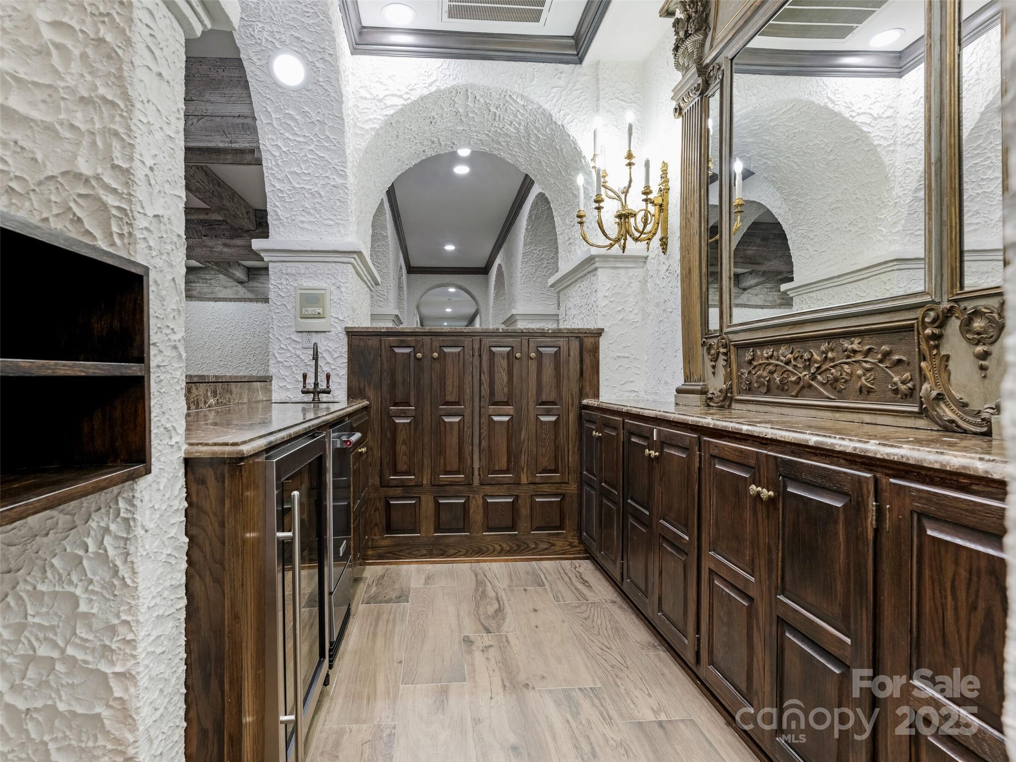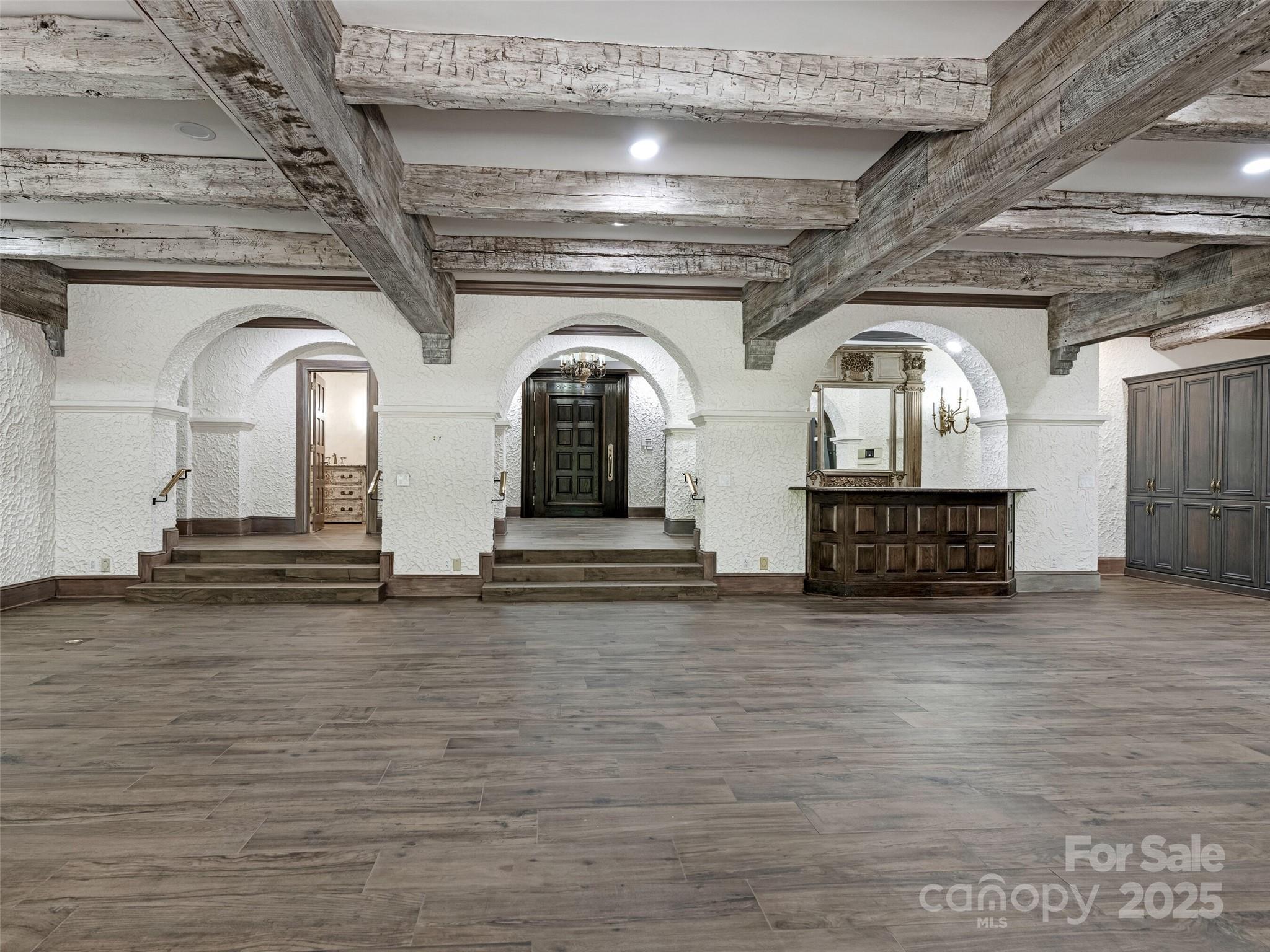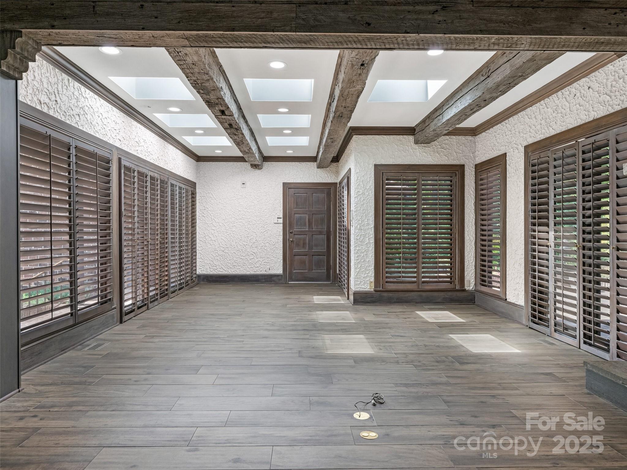 Exceptional Estate on Private Road - Welcome to this remarkable all-brick, 1-story estate offering nearly 6,000 sq. ft. of heated living space in one of South Charlotte’s most sought-after neighborhoods. Tucked away on a private road near Quail Hollow and Carmel Country Clubs, this residence blends timeless craftsmanship with modern comfort. Enter inside to high ceilings and stunning antique hand-hewn beams that anchor the main living spaces with warmth and character. The home boasts four bedrooms, four full baths and three half baths, along with abundant storage including a 1,200+ sq. ft. walk-up attic complete with a cedar closet. Multiple fireplaces create inviting gathering spaces plus, a dramatic wet bar in living room. Designed for both entertaining and everyday living, the floor plan flows seamlessly outdoors to expansive patios (with a 1/2 bath for the pool), a covered terrace and a sparkling pool—perfect for hosting or relaxing in privacy. A porte-cochere and four-car garage (with over 1,700sq ft) provide convenience and curb appeal. There is also a garage storage room and garage storage loft. Cedar shake roof and copper gutters compliment the exterior. This rare opportunity combines architectural detail, spacious design and a premier location—a true sanctuary just minutes from world-class golf, dining and shopping.