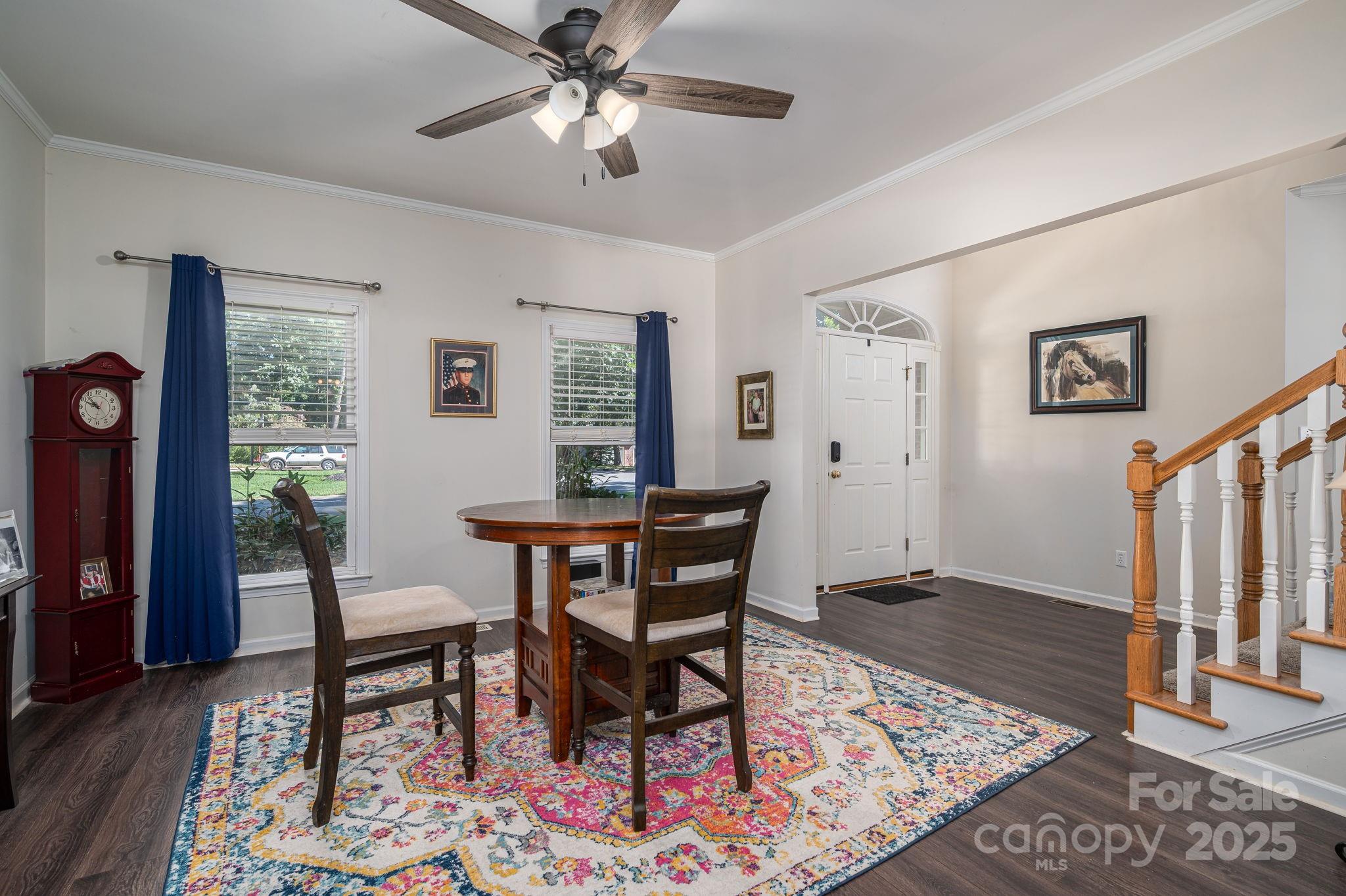 The dining room, framed by a charming bay window, feels bathed in natural light, setting the stage for memorable meals. With a 2021 HVAC system, comfort is assured year-round.