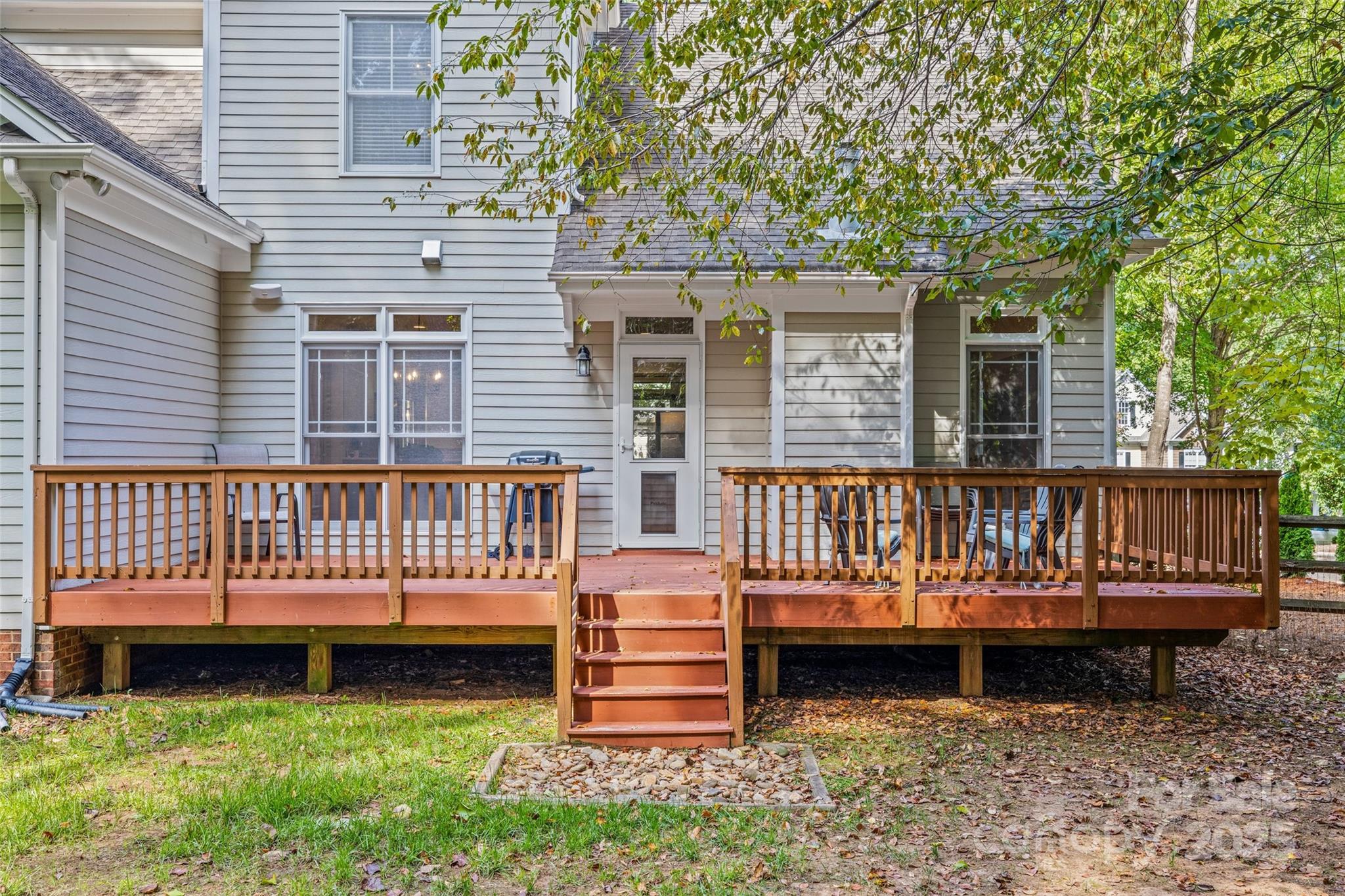 The outdoor living area includes a spacious fenced backyard and deck perfect for grilling and entertaining. Two-car garage provides additional storage.