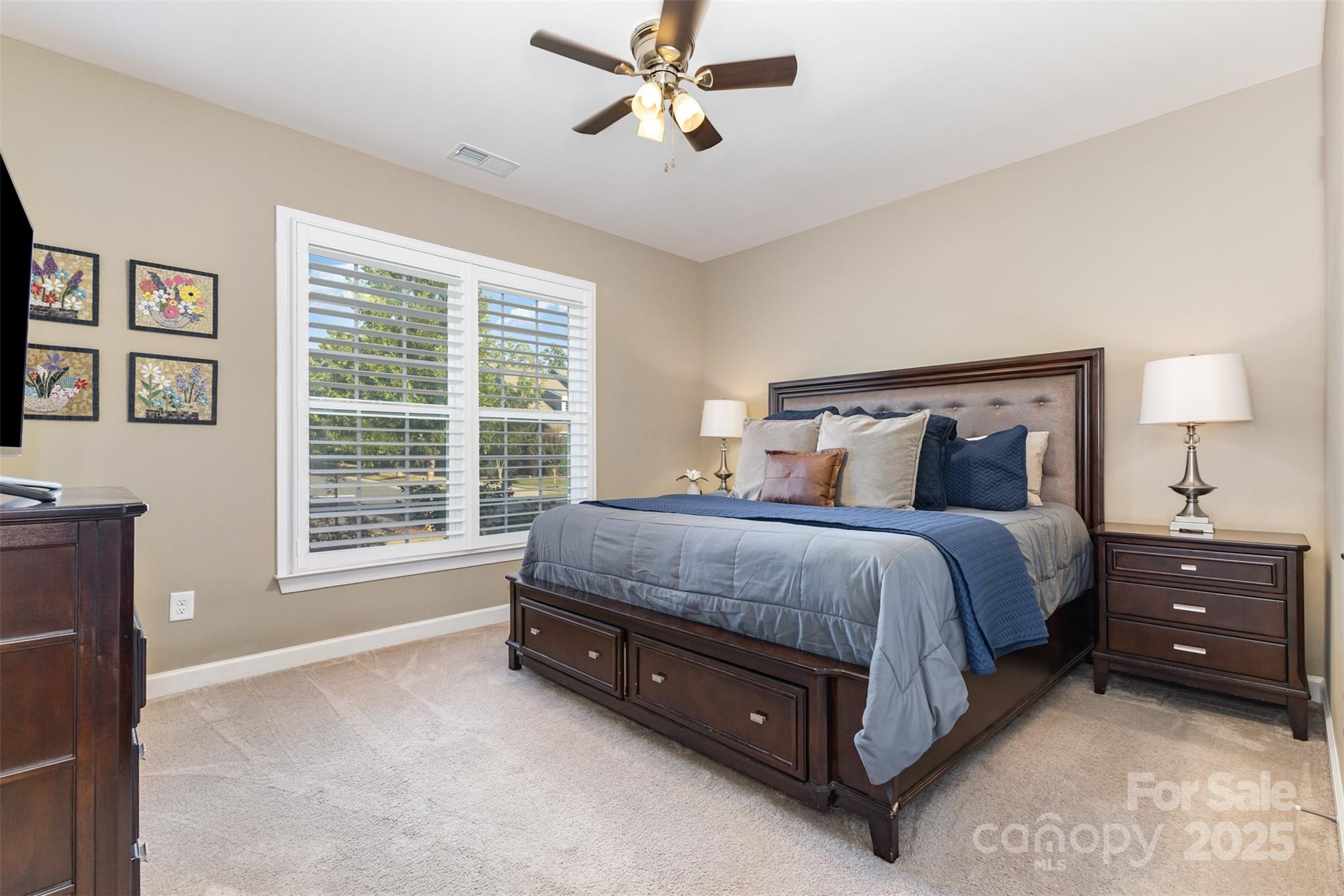 The main level primary suite offers a peaceful retreat with plush upgraded carpet, a custom built-in closet, and a spa-inspired bathroom with dual vanities, a separate water closet, and an extended frameless glass shower with bench seating. Two additional bedrooms on the main floor provide ample guest space or room for the family.