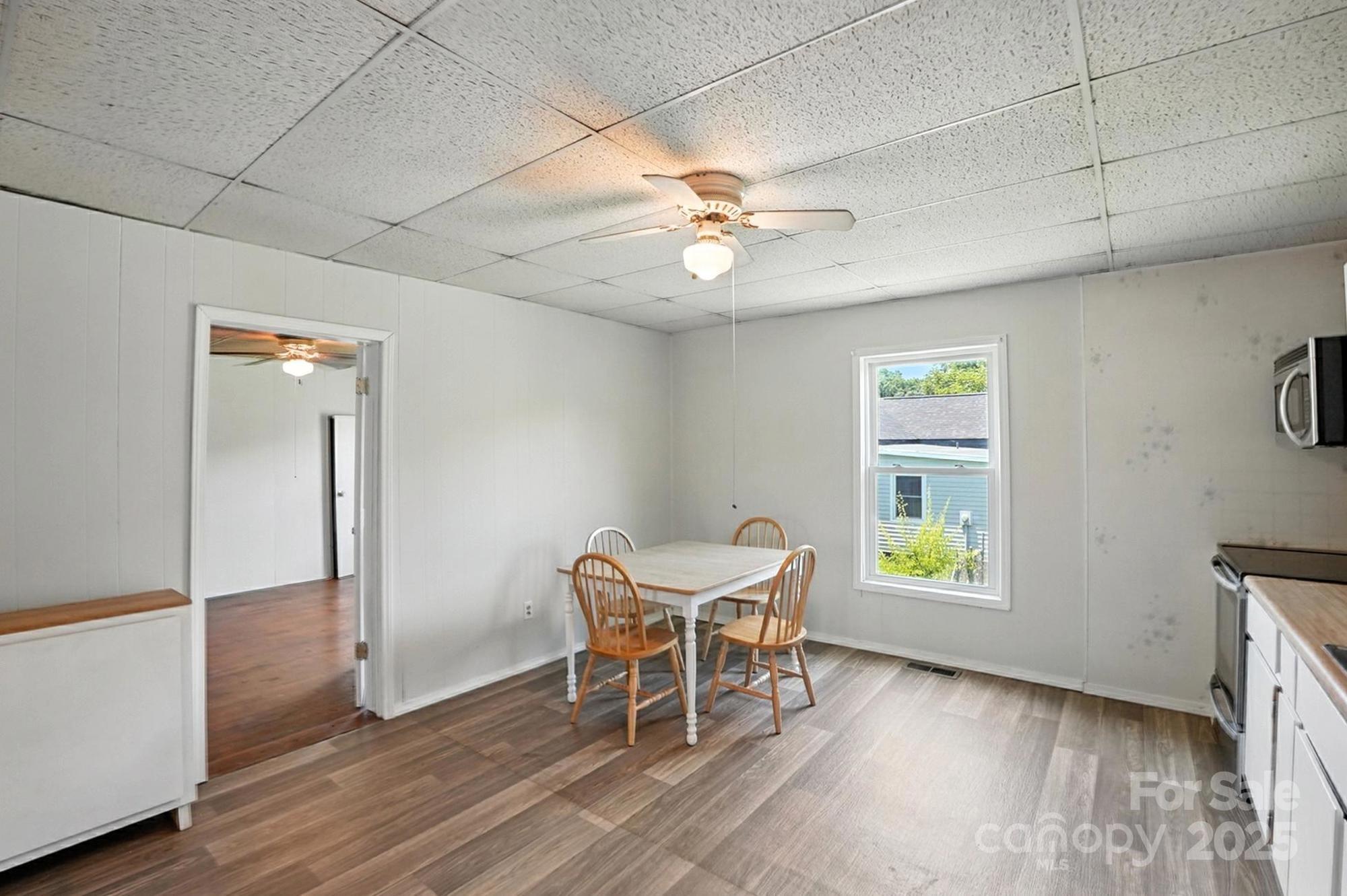 Enjoy the inviting curb appeal with a classic rocking chair front porch and a side deck. Inside, you’ll find a generous layout featuring a large kitchen, high 9-foot ceilings (visible with the drop panels removed), and a layout ideal for both comfortable living and future renovation.