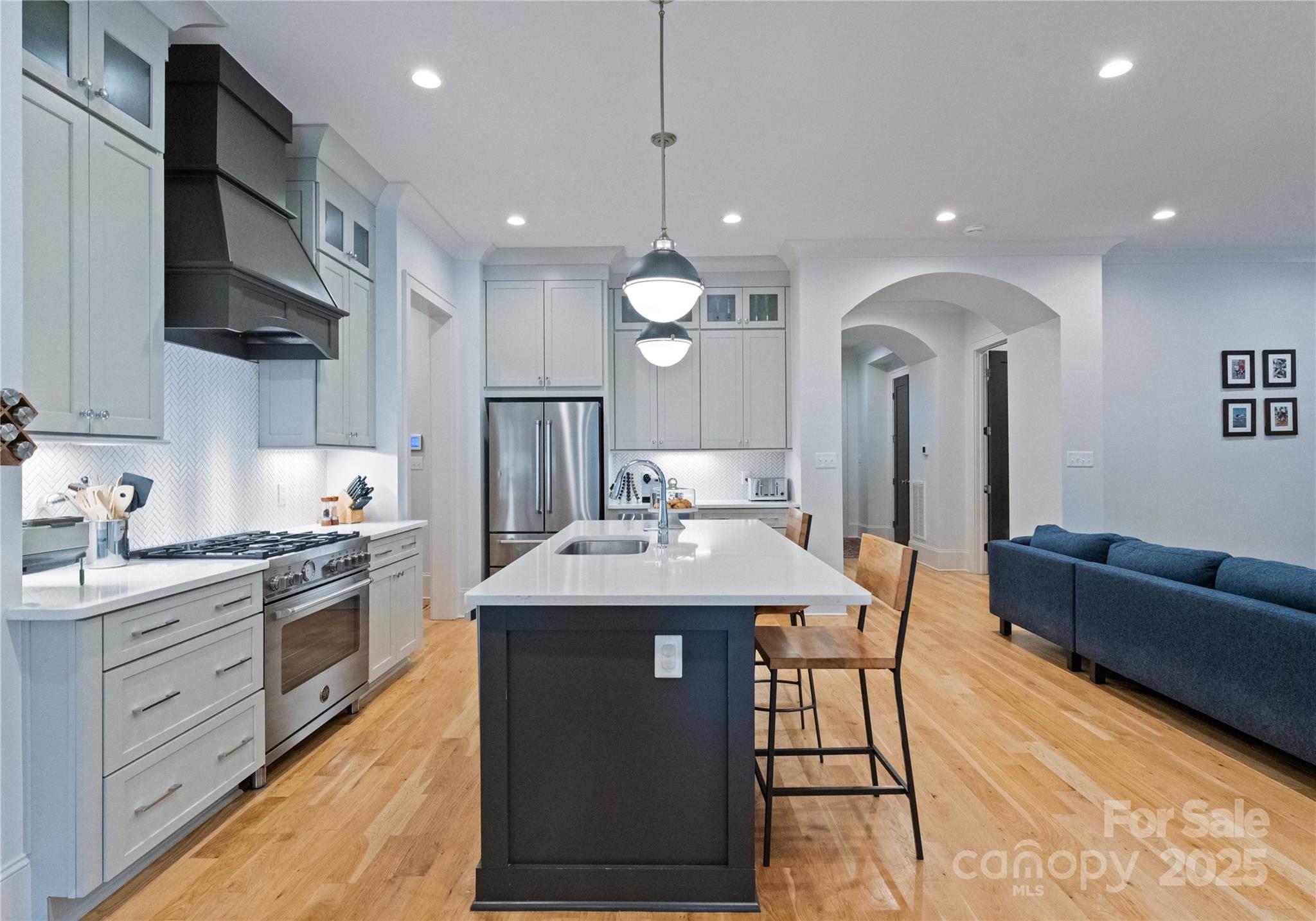 Enjoy a massive, flat fenced backyard designed for entertaining, complete with a hardscaped patio, built-in firepit, outdoor kitchen with grill, and lush professional landscaping. Inside, elegant details shine—site-finished white oak floors, arched openings, custom trim, coffered ceilings, and a custom carpet runner on the stairs. The chef’s kitchen impresses with quartz counters, a herringbone backsplash, Bertazzoni 5-burner gas range, and walk-in pantry.