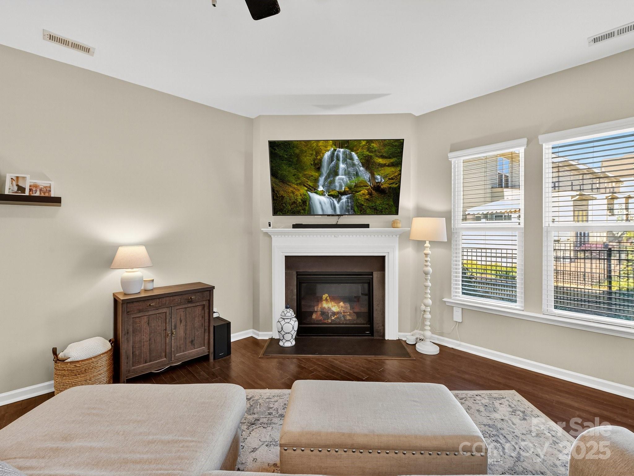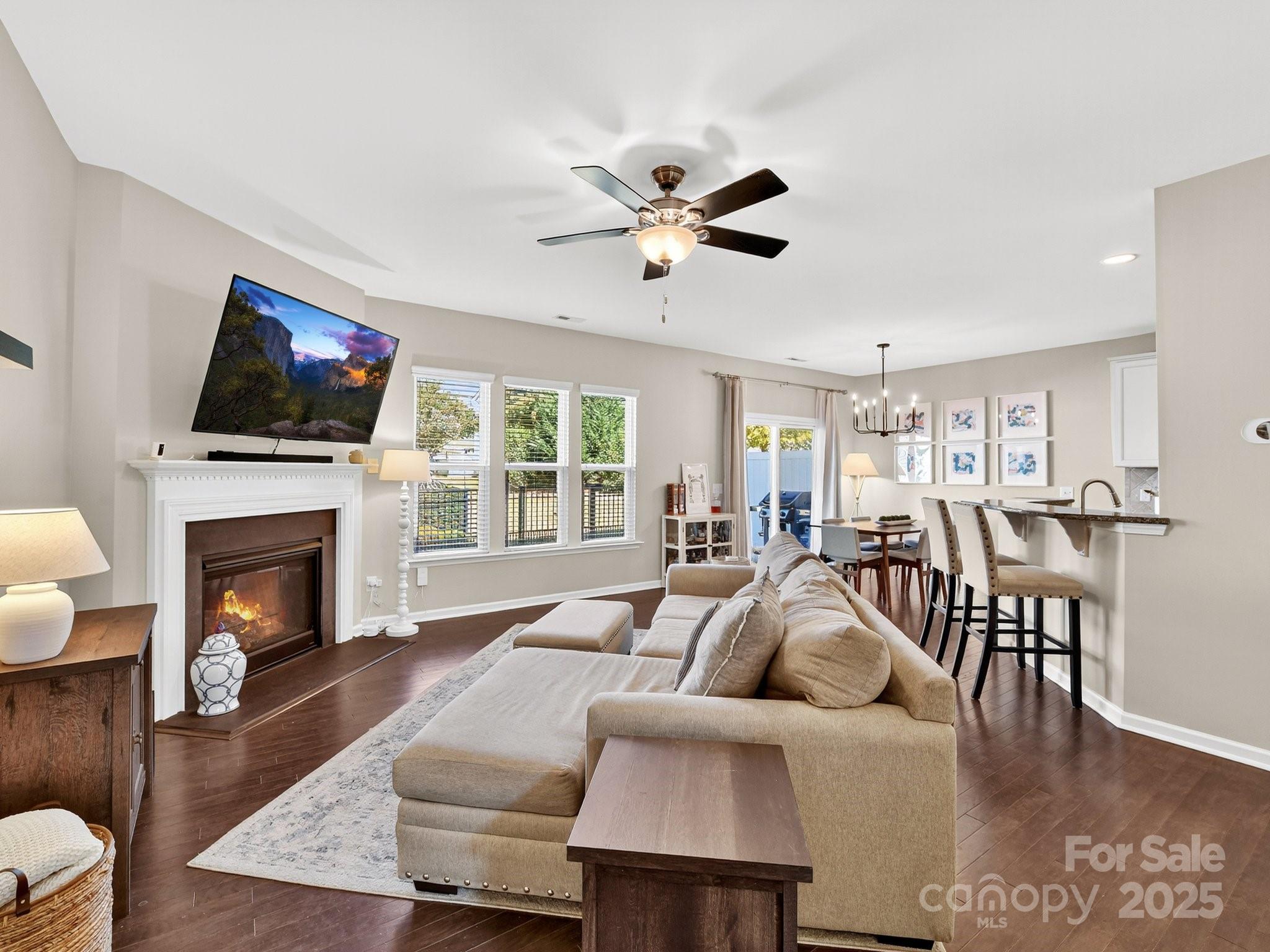 Don’t miss this beautiful, move-in-ready townhome located in the gated community of Park South Station. This 3-bedroom, 2.1-bath home features 9-foot ceilings, a fireplace, a 2-car garage & hardwood floors on the main level. The kitchen is complete with breakfast bar, white cabinets, gas range and pantry. Upstairs, the primary suite features a huge walk-in closet and an ensuite bathroom with a double vanity, shower, and water closet. Two additional bedrooms, walk-in laundry room and full bathroom complete the second level. Recent updates include fresh paint (all ceilings & 2nd floor), Nest thermostats, garage shelving, new garage system, and a new dishwasher. Step outside to a fenced backyard and a patio. Yard maintenance is covered by the HOA. Park South Station offers resort-style amenities, including a pool, clubhouse with fitness center, dog parks, and a playground. This home is located on a quiet dead-end street with no through traffic and just a few homes down, there is direct access to the Sugar Creek Greenway.
