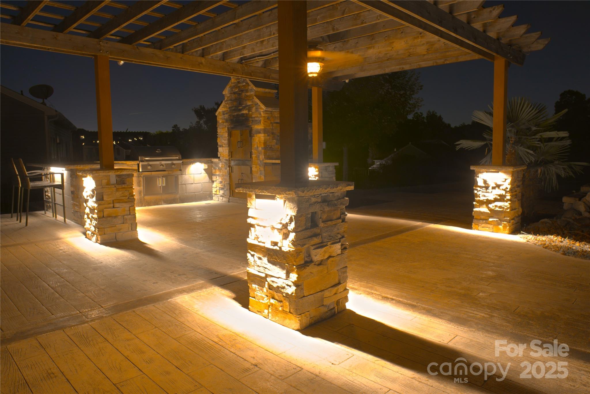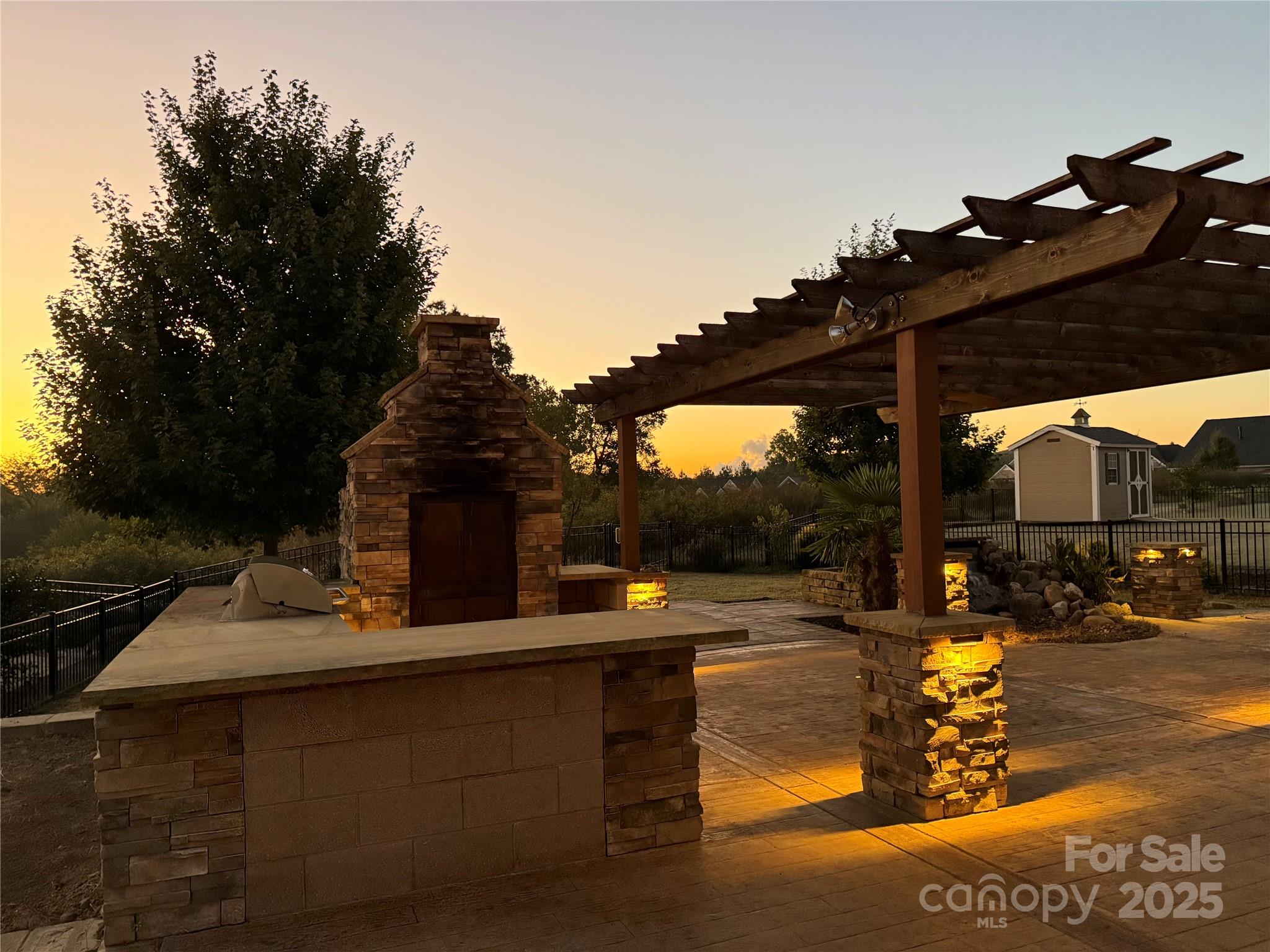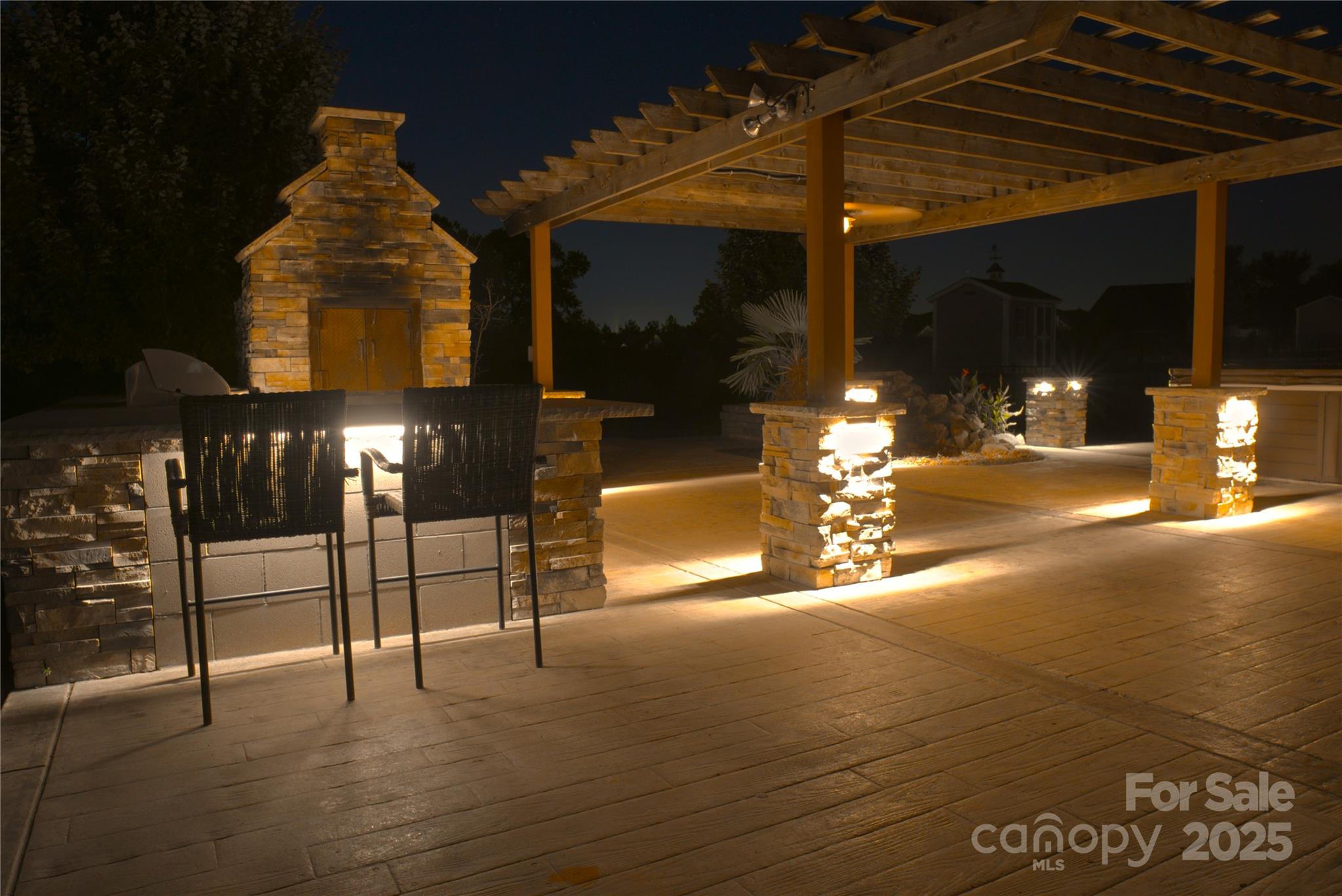This backyard was made for memories. Fire up the built-in stainless steel grill, slide a pizza into the custom stone oven, and dine under the pergola-covered patio, surrounded by the glow of soft lighting and stone accents. There’s even a paved area perfect for a fire pit, where you can gather with friends and family, share stories, and enjoy the stars. With stamped concrete flooring and a beautifully designed layout, the outdoor space feels like a natural extension of the home — cozy in the winter, vibrant in the summer, and completely unforgettable year-round.