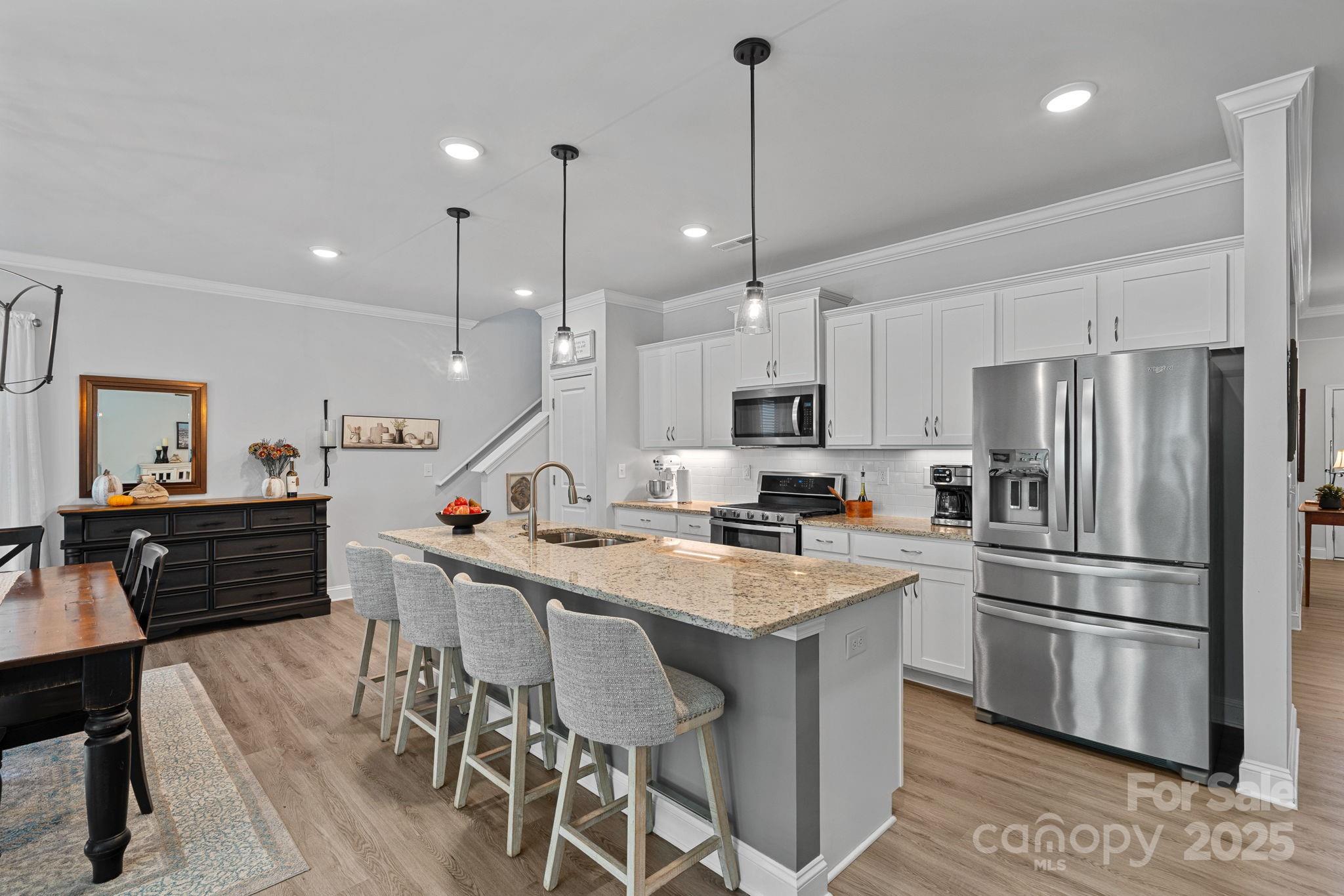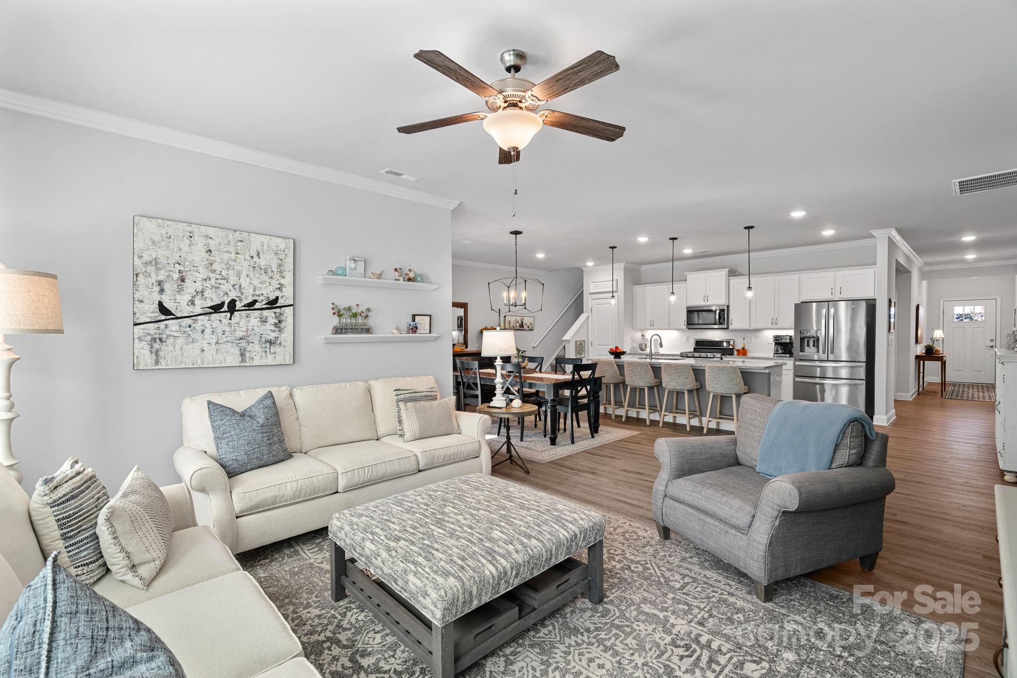 This thoughtfully designed home offers the ease of one-level living with just the right amount of extra space where you want it. The main floor features an open layout that connects the kitchen, dining, and living areas in a natural flow — perfect for everyday living or gathering with friends. The kitchen stands out with a large center island, gas range, and plenty of workspace for anyone who loves to cook.