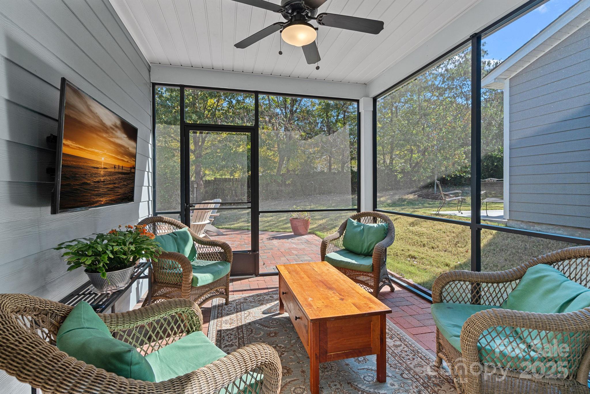 French doors open to a quiet office, ideal for working from home or curling up with a good book. The screened porch extends the living space outdoors, creating a peaceful spot to enjoy morning coffee or evening breezes.