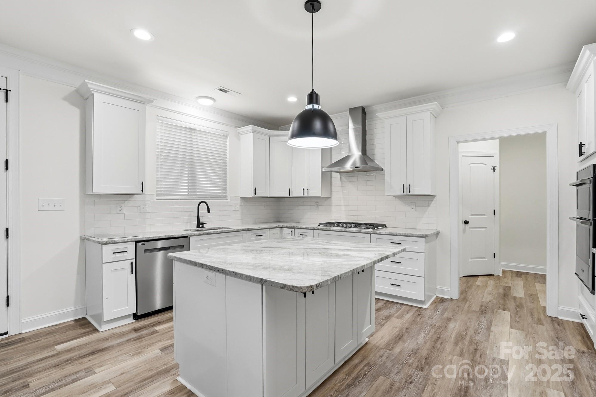 A large, covered rocking chair front porch welcomes you in. The open concept main level features LVP flooring throughout, a beautiful chef’s kitchen with a huge island, gas stove, vent hood, tile backsplash, new refrigerator, and generous storage. The kitchen opens to an oversized family room with a gas fireplace, perfect for everyday living and entertaining.