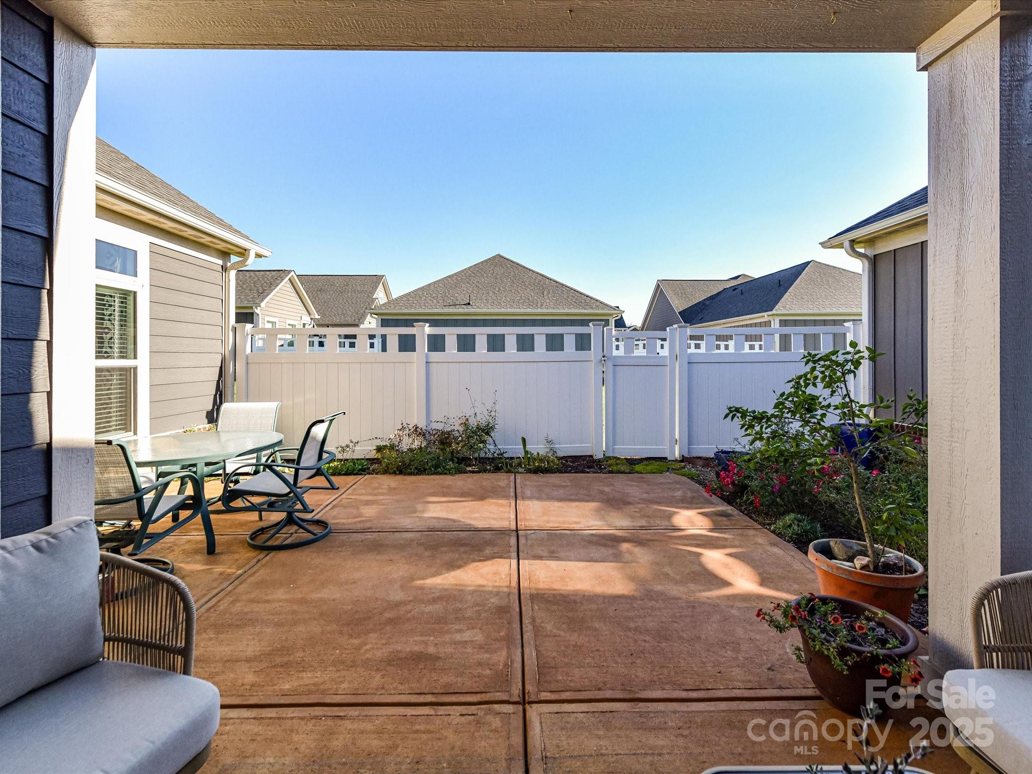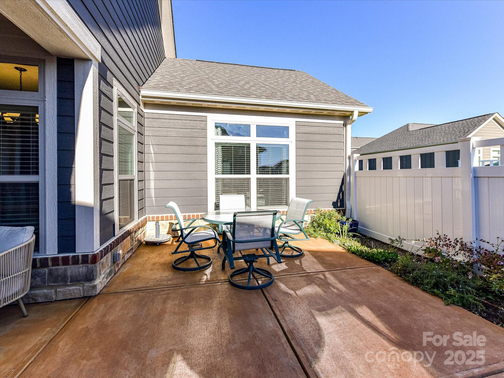 Meticulously maintained patio home in a desirable 55+ community (neighborhood allows a certain percentage to be under 55). Built in 2022, this home offers effortless living in a prime location with easy access to I-485 and walking distance to shopping and dining. Enjoy quiet mornings on the inviting rocking chair front porch or relax in the evening on the covered patio overlooking a private, fenced backyard with lush landscaping. Inside, the open floor plan connects the family room, kitchen, and dining areas, creating a warm and welcoming flow. The family room features built-ins and a cozy fireplace, while the kitchen impresses with beautiful cabinetry, Quartz countertops, tile backsplash, under-cabinet lighting, gas cooktop, wall oven, convection microwave, food pantry with wood shelving, center island with bar seating, and pendant lighting. The spacious primary suite includes a walk-in closet and a luxurious bath with a floor to ceiling tiled walk-in shower with bench, beautiful vanity w/ dual sinks & quartz countertops, plus a linen and water closet. The split-bedroom layout provides privacy, with the second bedroom—currently used as a den/office. Magnificent laundry room with sink. (Washer/Dryer included). Private exterior storage room perfect for gardening tools, patio cushions, etc. Meticulously cared for and move-in ready, this home combines comfort, convenience, and style in one perfect package. Don't miss this one! Refrigerator, Washer/Dryer included.