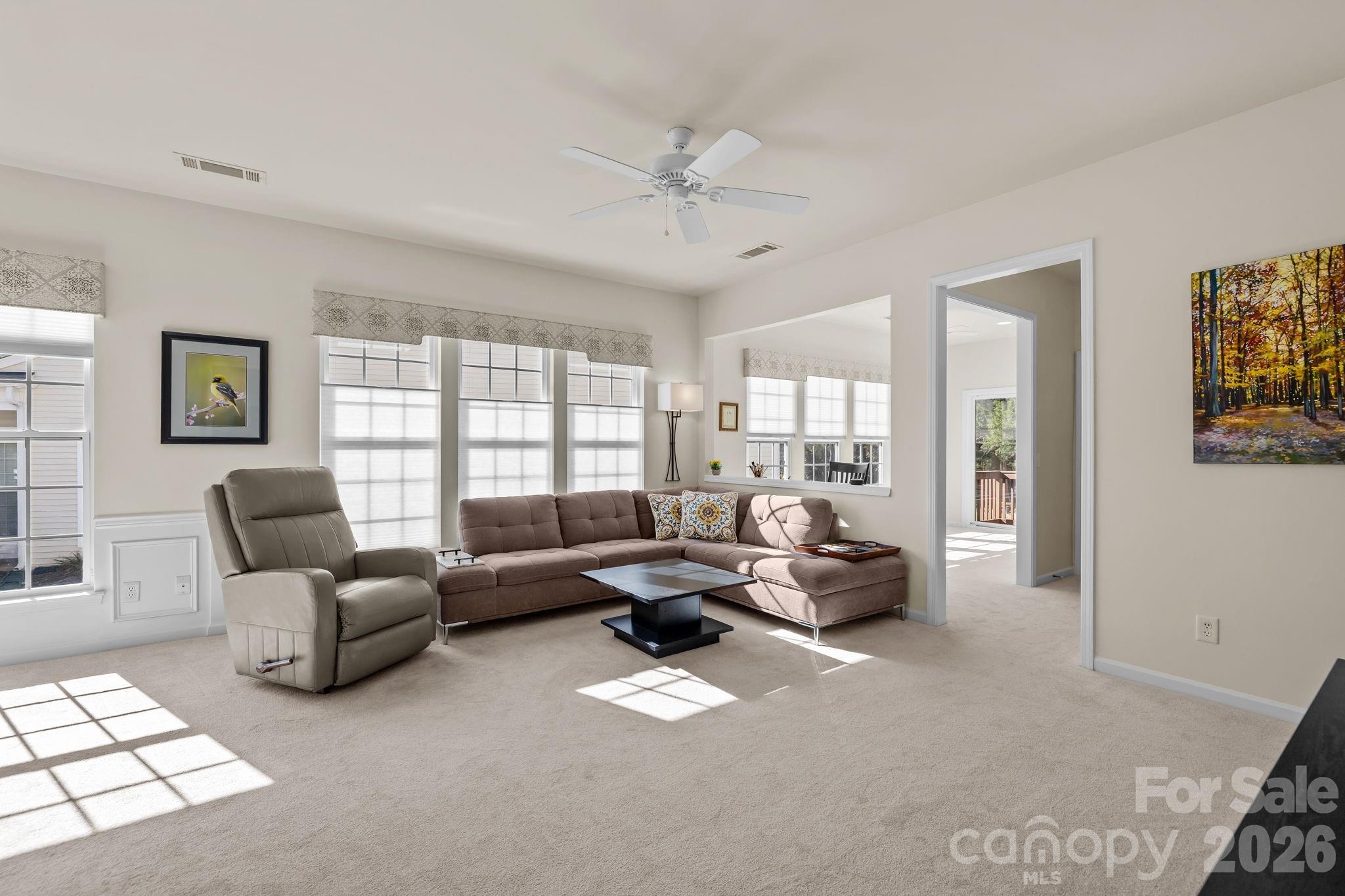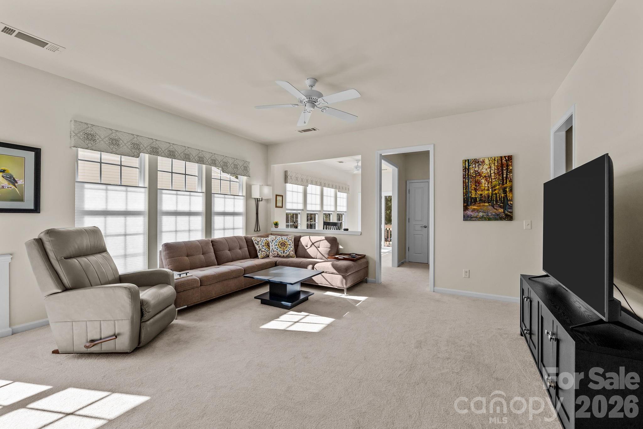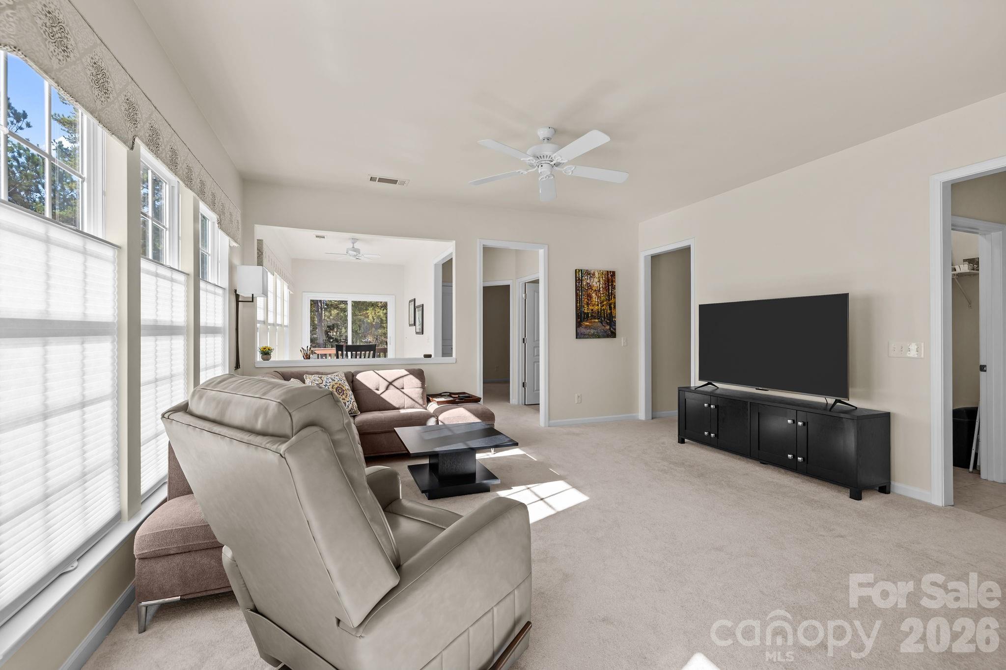 Lake Views From your back porch!!! All 2026 HOA fees will be paid by seller with an accepted offer. Enjoy the best of active adult living in this beautifully updated 2-bedroom, 2-bathroom townhome located in the highly sought-after Del Webb community of Sun City Carolina Lakes. Perfectly positioned overlooking one of the community’s picturesque lakes, this home offers peaceful water views and a low-maintenance lifestyle just steps from world-class amenities. Inside, you’ll find freshly updated paint, brand-new carpeting, and luxury blinds throughout, creating a bright and inviting atmosphere. The kitchen features modern appliances and flows effortlessly into the open-concept living and dining area—perfect for entertaining or relaxing with friends. Step out onto your private back porch to enjoy your morning coffee or evening sunsets overlooking the lake. Both bedrooms are generously sized, with the primary suite offering a full bath and plenty of closet space. Located just a short walk from the community clubhouse, fitness center, pools, and walking trails, this home offers the ideal blend of convenience and tranquility. Plus, you’re just minutes from Harris Teeter, restaurants, and shopping, making everyday living a breeze.