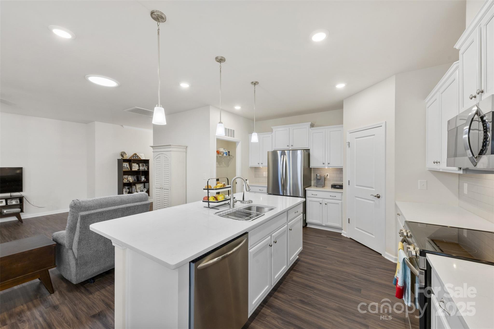 Designed with comfort and functionality in mind, this 2-bedroom, 2-bath home with an office/flex room features a spacious open floorplan that seamlessly connects the living, dining, and kitchen areas—perfect for both everyday living and entertaining. The kitchen showcases quartz countertops, crisp white cabinetry, stainless steel appliances, and a large island with breakfast seating, along with convenient nooks ideal for a coffee or beverage station.