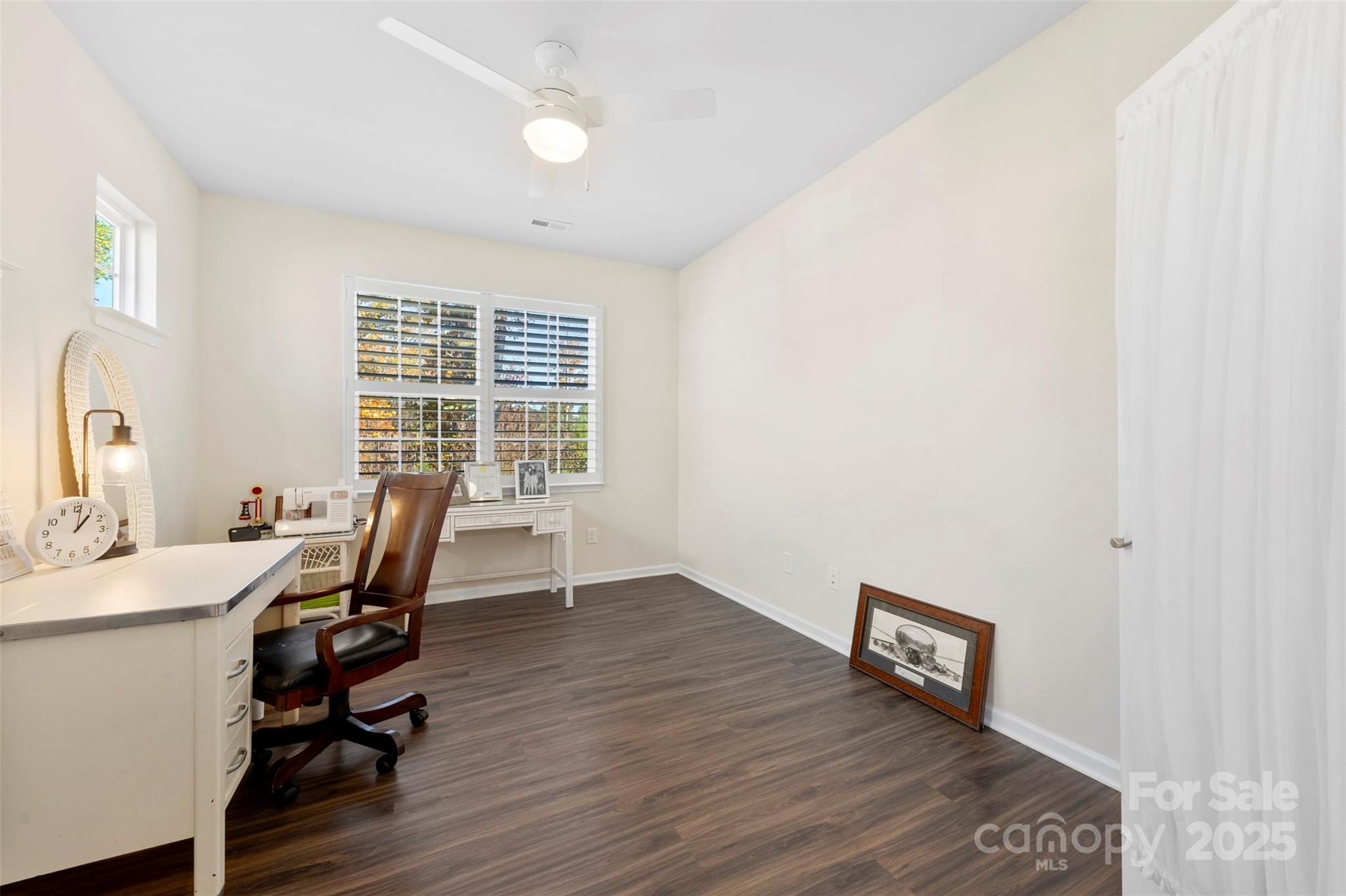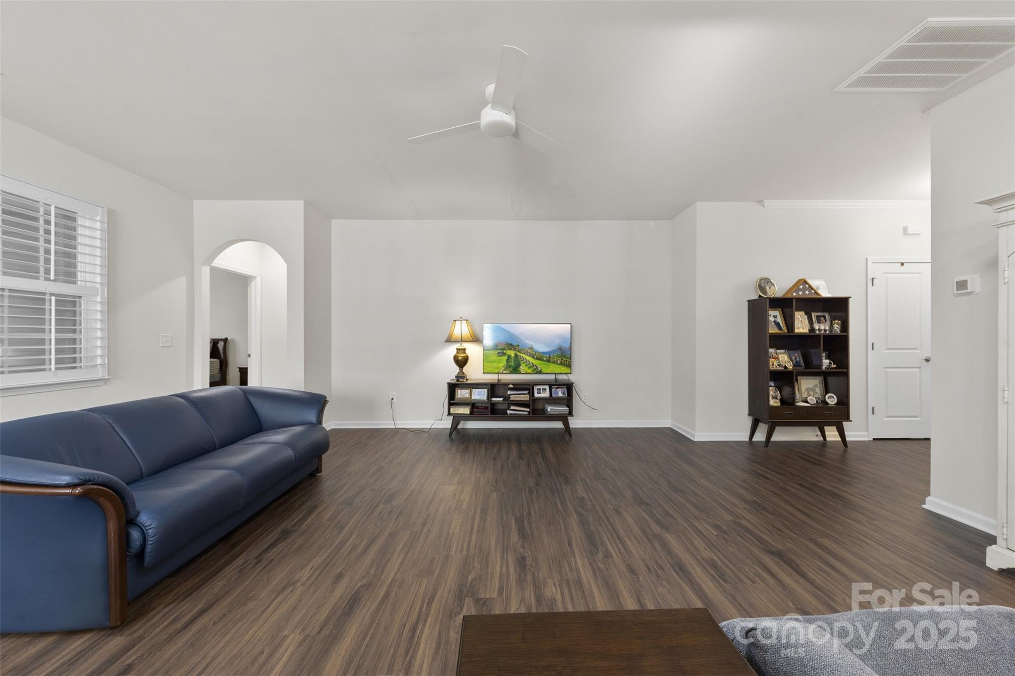 A split-bedroom layout offers privacy, highlighted by charming arched walkways leading to each suite. The French-door office provides a bright, quiet space for work or hobbies. The home is filled with natural light and enhanced by plantation shutters throughout for added privacy. Durable luxury vinyl plank flooring spans the main living spaces, with tile flooring in all baths. The serene primary suite features a spacious bath with dual vanities and quartz countertops. Step through the main living area onto a large screened-in porch, then out to an extended paver patio overlooking the community’s wooded walking trails—a peaceful and private outdoor retreat. The generous laundry room provides excellent flexibility, with space for a utility sink, folding station, or extra storage.