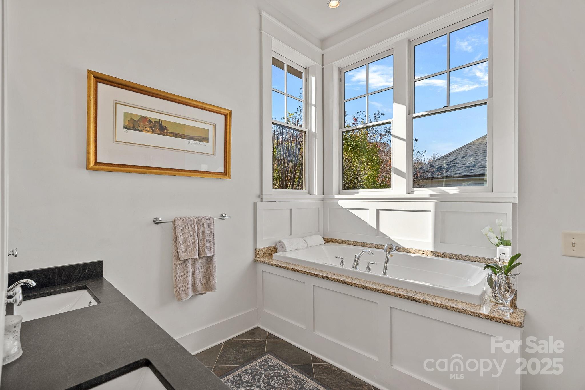 Upstairs, the tranquil primary suite impresses with vaulted ceilings, two closets (one currently used as a coffee bar), and a newly refreshed spa-like bath boasting black leathered granite countertops, new sinks, and new faucets. Three additional bedrooms and two updated full baths—both with new countertops, sinks, and faucets—along with a centrally located laundry room complete the second floor.