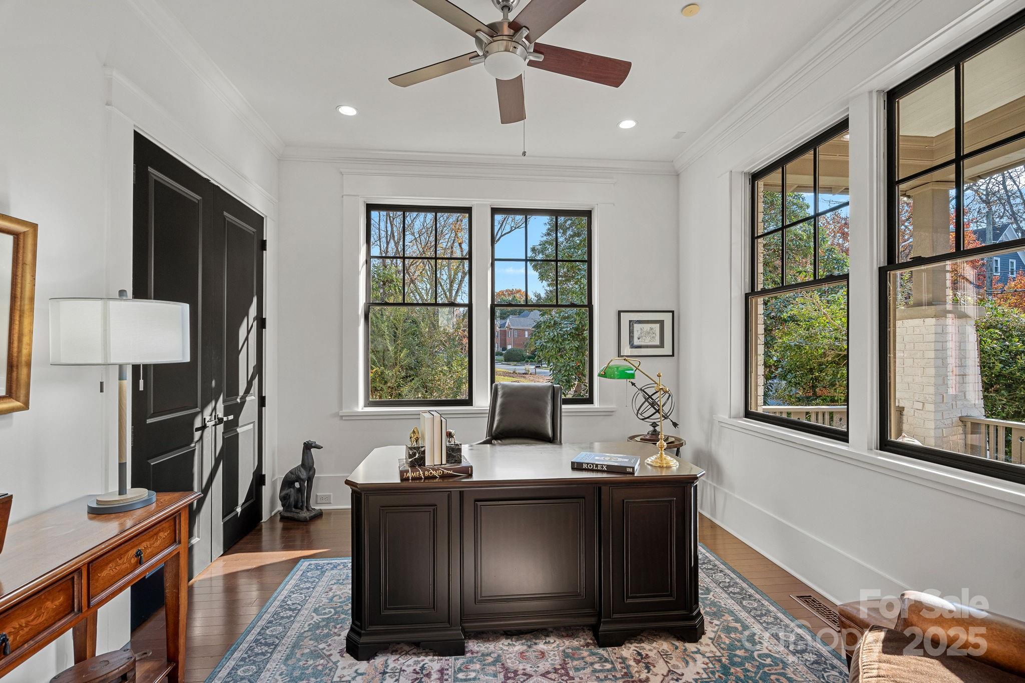 Thoughtful design touches continue throughout the main level, including a charming study nook with two built-in desks at the base of the stairs, a cozy sitting room, and a convenient side-entry drop zone.