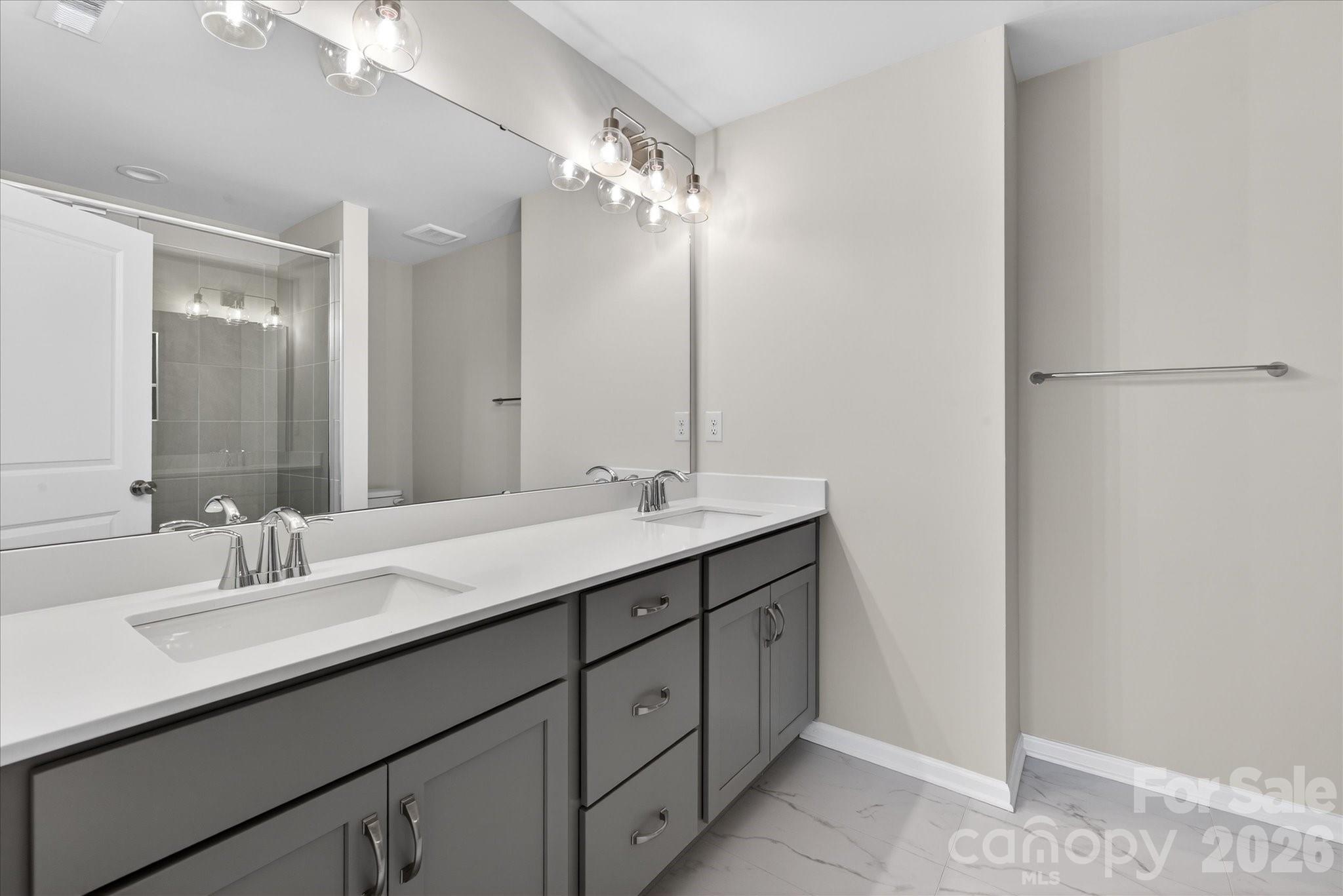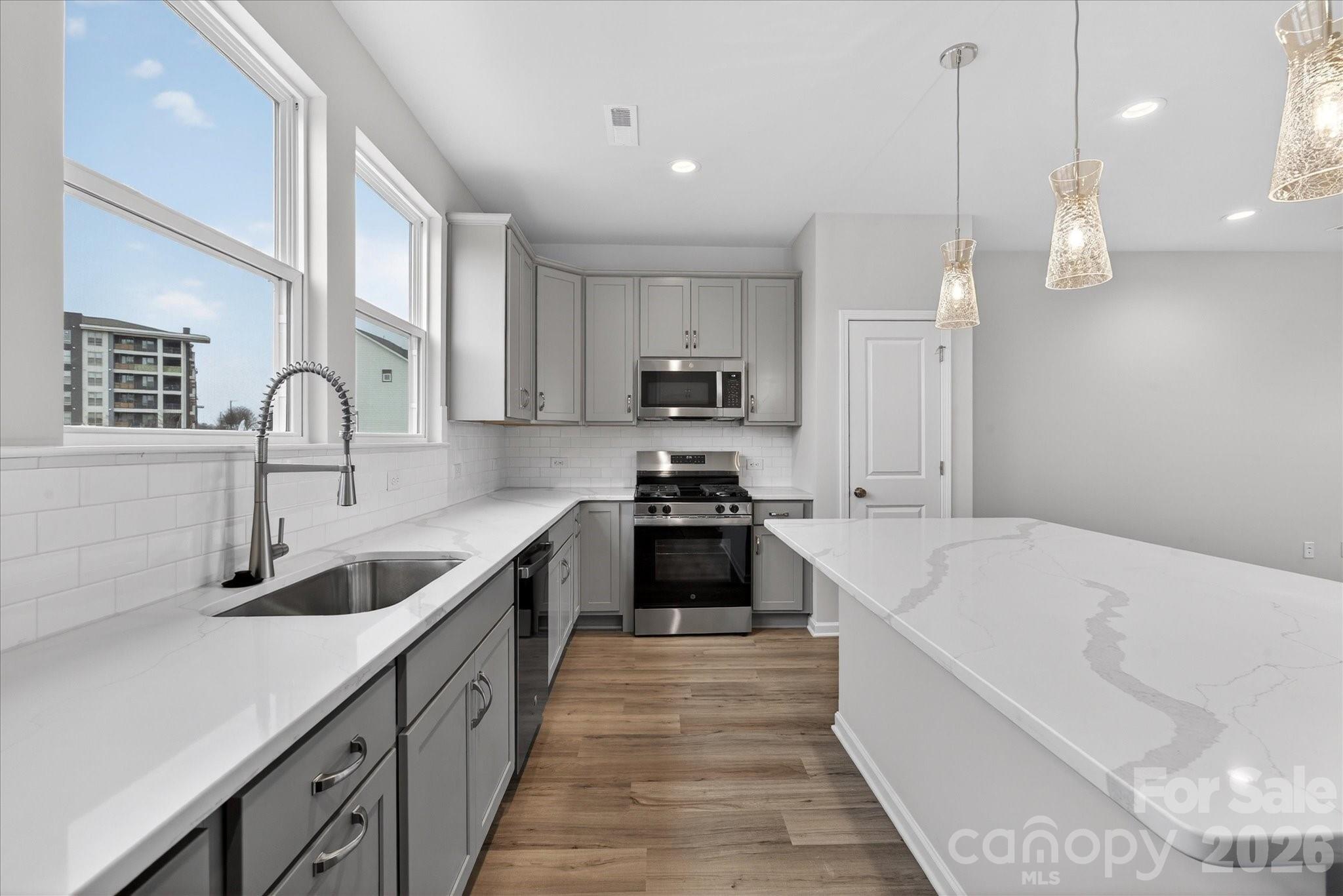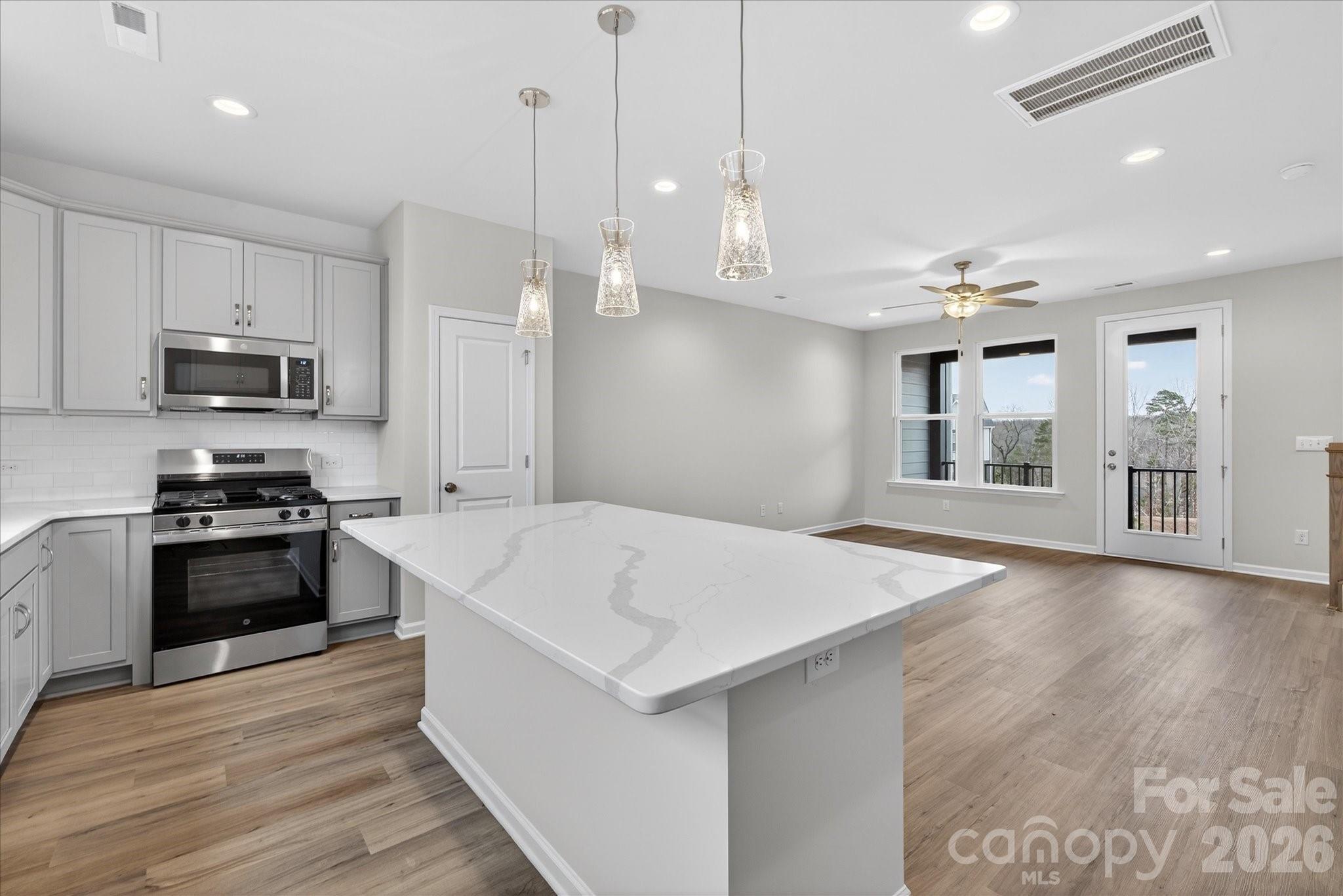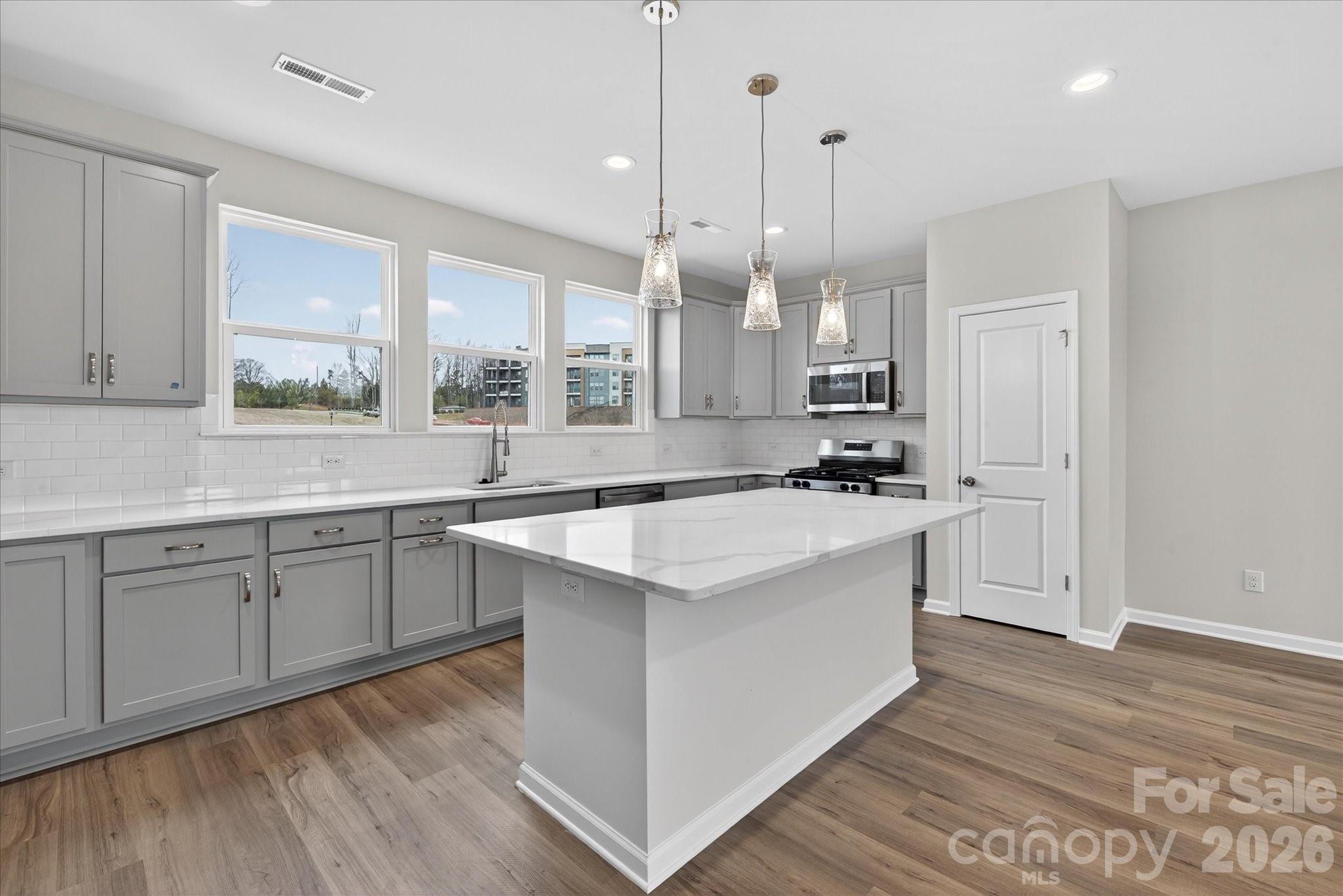 New 3-story townhome in Charlotte's University area, with a private bath in every bedroom. Walk to Toby Creek Greenway, with easy access to the light rail for heading to Uptown Charlotte, South End, and beyond. The first floor has a 2-car garage plus guest bedroom with private bath. Open-concept living on the second floor, with 9' ceilings and a private terrace with green space views and Trex decking. Layout the space with a separate living room and dining area, or you can use the large kitchen island as a dining table, with barstools on both sides. The spacious kitchen boasts 42" grey cabinets, quartz counters, tile backsplash, double pullout trash cabinet, sleek stainless steel Moen faucet, and GE stainless steel appliances with a gas range, plus a pantry closet. The third floor has a laundry closet large enough for a full-sized stacked washer/dryer. Nice sized Primary suite has a walk-in closet and bathroom with large tiled shower.  All bathrooms feature quartz counters, grey cabinets, and tiled floors. LVP flooring is at the entry and throughout the second floor, with oak treads on the first set of stairs. Located about 2 miles from UNC Charlotte, Brixton is set back in a quiet location, yet close to everything. Driveway plus on-street parking is included.