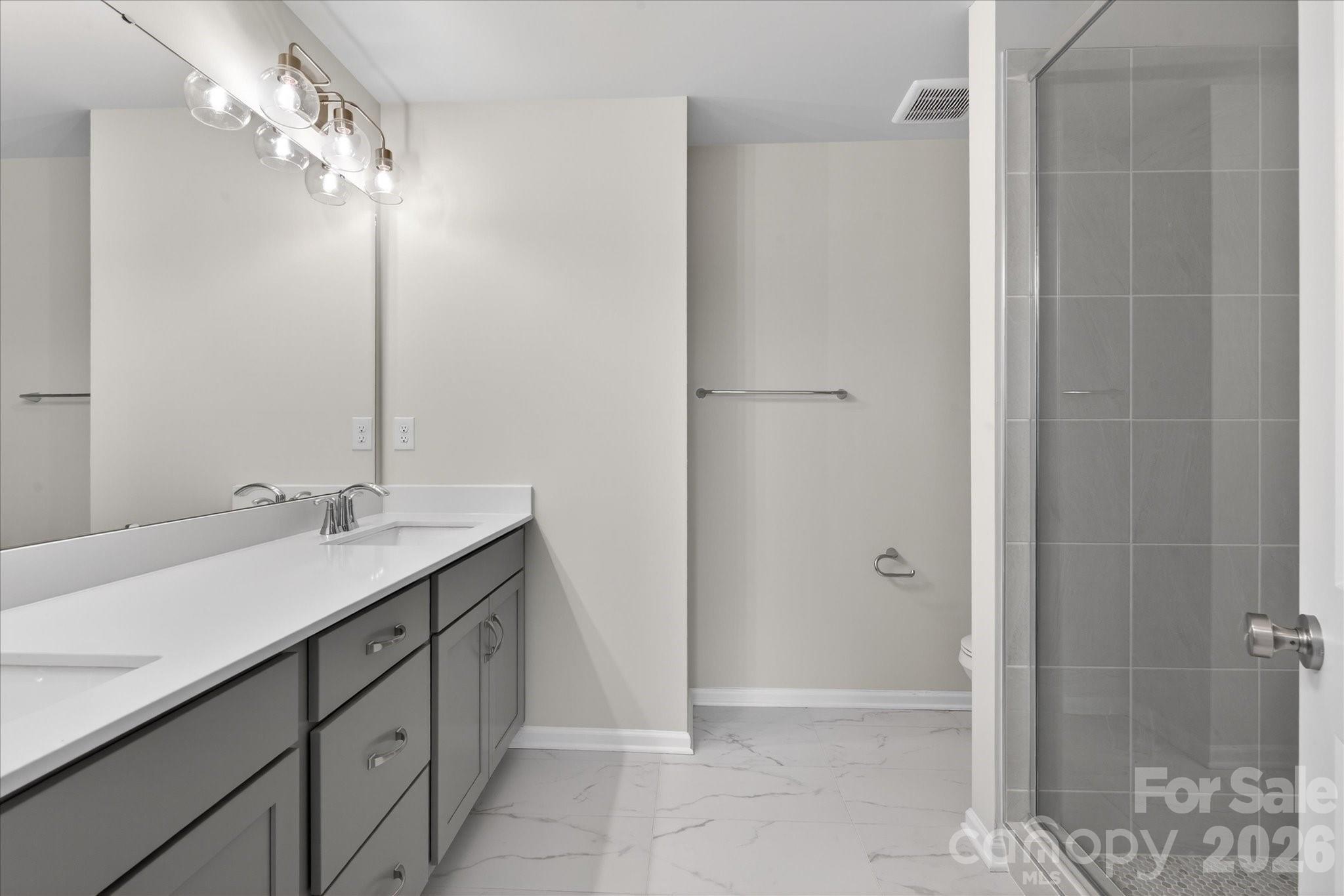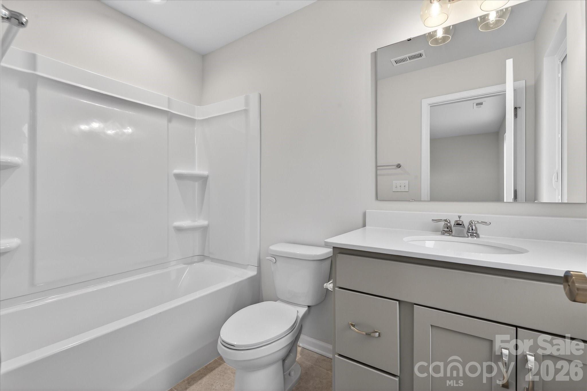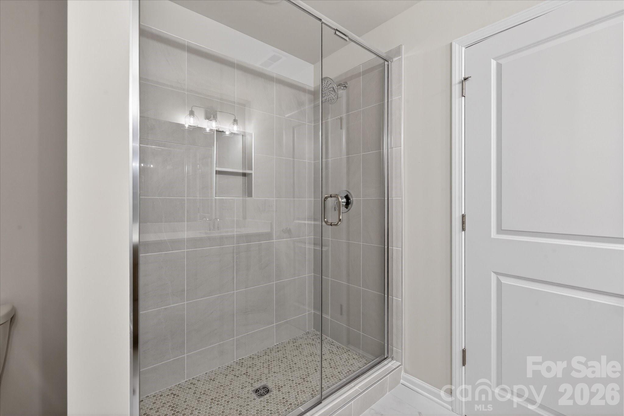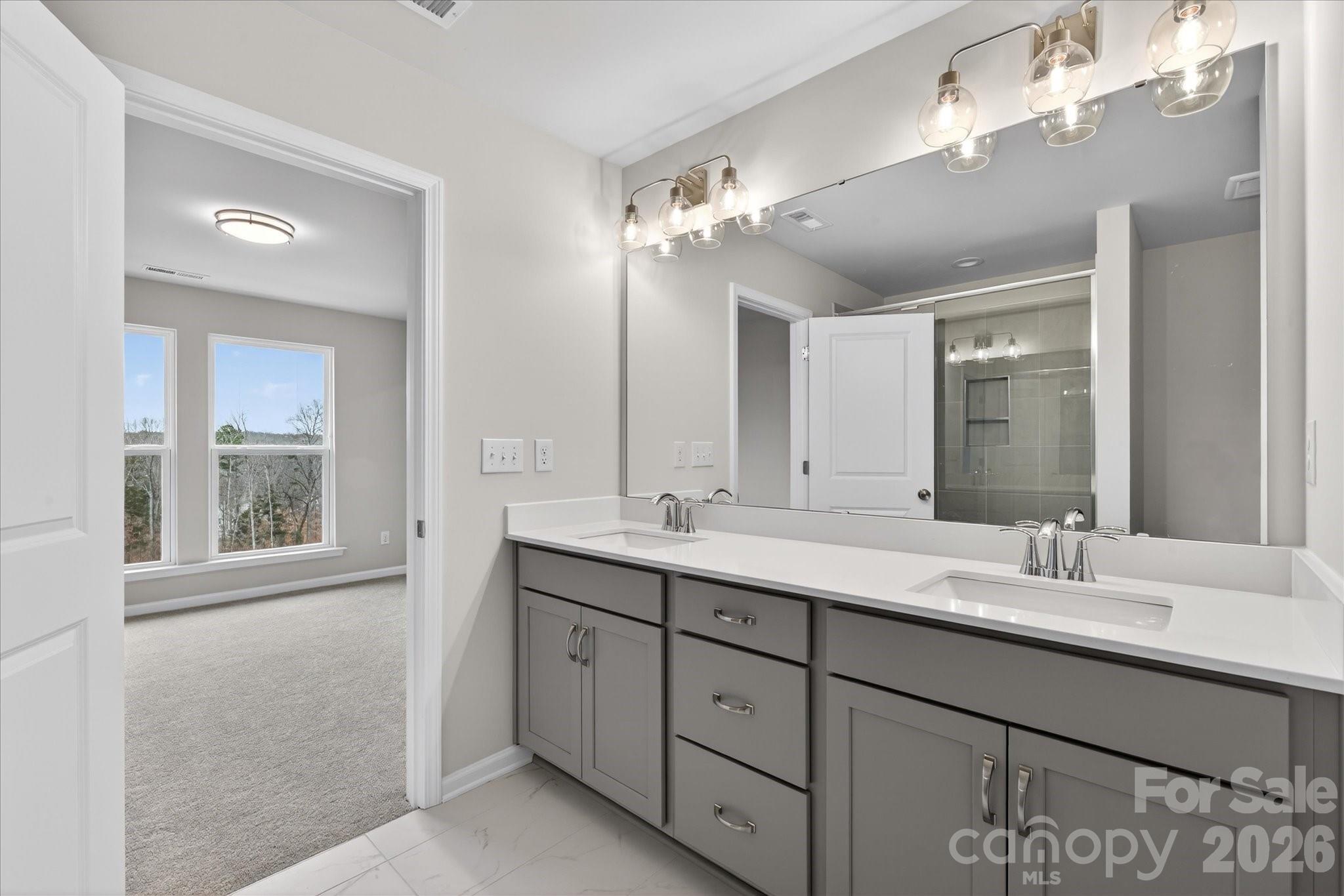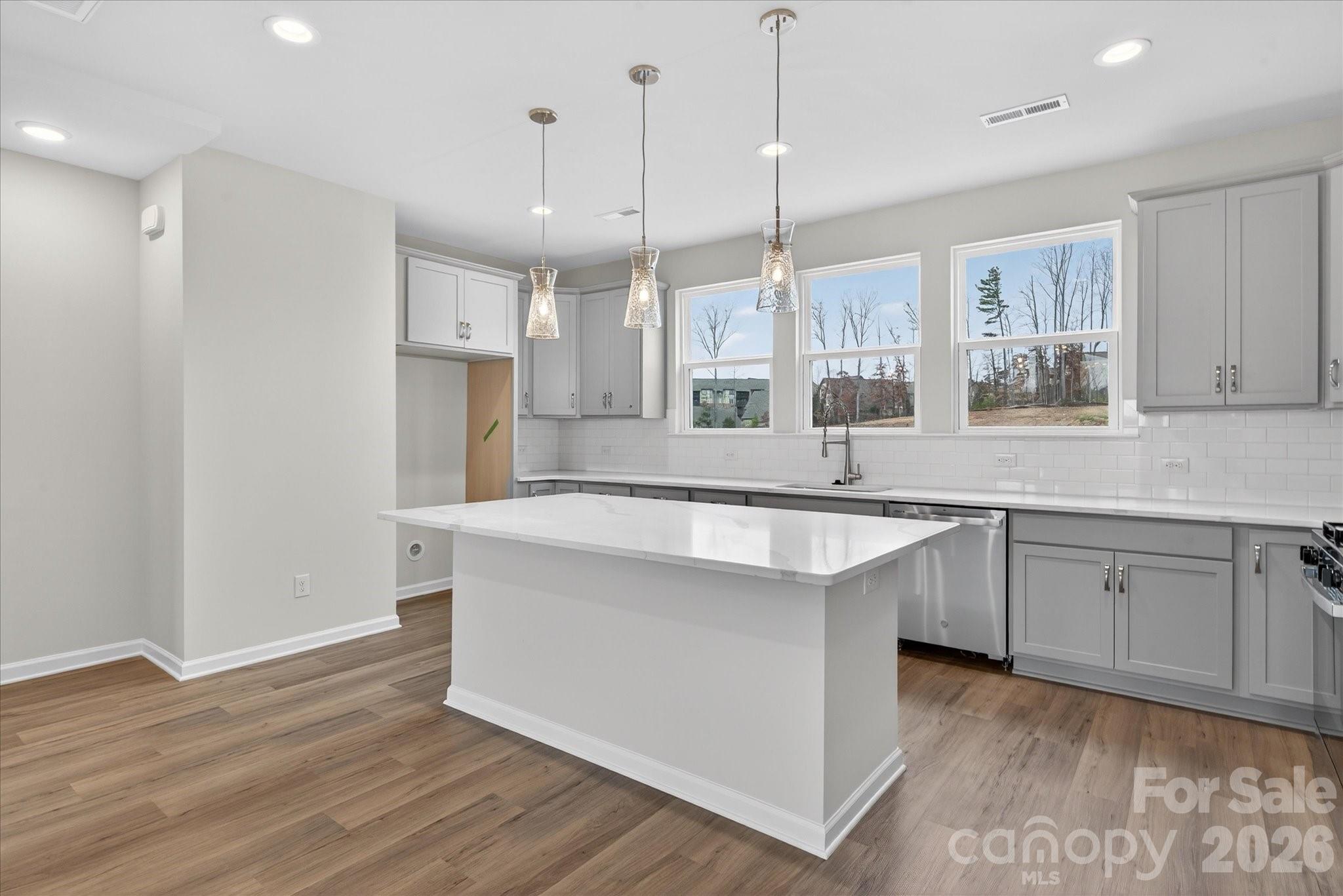New 3-story townhome in Charlotte's University area, with a private bath in every bedroom. Walk to Toby Creek Greenway, with easy access to the light rail for heading to Uptown Charlotte, South End, and beyond. The first floor has a 2-car garage plus guest bedroom with private bath. Open-concept living on the second floor, with 9' ceilings and a private terrace with green space views and Trex decking. Layout the space with a separate living room and dining area, or you can use the large kitchen island as a dining table, with barstools on both sides. The spacious kitchen boasts 42" grey cabinets, quartz counters, tile backsplash, double pullout trash cabinet, sleek stainless steel Moen faucet, and GE stainless steel appliances with a gas range, plus a pantry closet. The third floor has a laundry closet large enough for a full-sized stacked washer/dryer. Nice sized Primary suite has a walk-in closet and bathroom with large tiled shower.  All bathrooms feature quartz counters, grey cabinets, and tiled floors. LVP flooring is at the entry and throughout the second floor, with oak treads on the first set of stairs. Located about 2 miles from UNC Charlotte, Brixton is set back in a quiet location, yet close to everything. Driveway plus on-street parking is included.