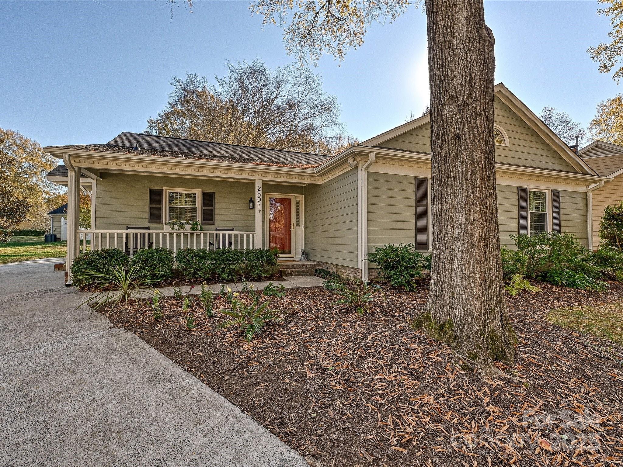 Welcome to 2507 Breuster Drive, an inviting 3-bedroom, 2-bath home perfectly positioned in a cul de sac in a south Charlotte community where the HOA dues cover water, sewer, lawn maintenance and more! A charming rocking-chair front porch sets the tone for this beautifully updated ranch featuring LVP flooring throughout, modern tile in the baths, plantation shutters, and elegant crown and raised baseboard moldings. The vaulted family room feels bright and airy with its painted brick fireplace and brand-new gas logs (2024). The dining room shines with updated lighting, and the renovated kitchen impresses with custom soft-close wood cabinetry, a stained wood-topped island, granite countertops, tile backsplash, recessed lighting, new GE stainless steel appliances, including a brand-new range, and a coveted walk-in pantry with wood shelving. A stylish laundry room with cabinetry and a frosted barn-door entry adds both charm and function. The spacious primary suite features a generous walk-in closet and a sleek bath with a frameless glass and tile shower. Both baths offer teak vanities, Carrara marble counters, and updated lighting. Thoughtful upgrades are found throughout: newer windows, newer HVAC (2019), new gutters, ceiling fans in every bedroom, double-door closets in the secondary bedrooms, a new tankless water heater, brand-new interior doors, dimmer switches on dining and kitchen lighting, pull-down attic storage, and a new side entry door.