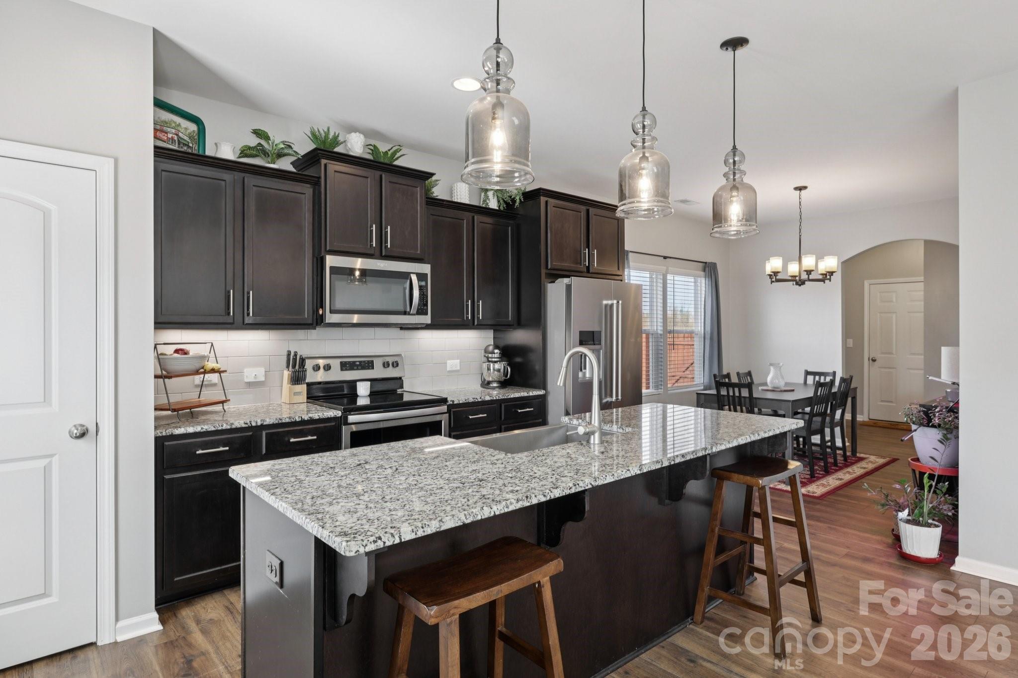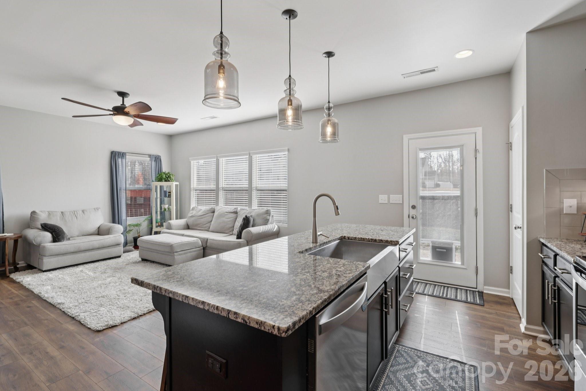The open-concept floor plan is ideal for both everyday living and entertaining. The spacious kitchen features granite countertops, large kitchen island, a charming farmhouse sink, subway tile backsplash, and excellent sight lines into the living room—perfect for staying connected with guests. A convenient drop zone off the garage helps keep life organized when you’re coming home from a busy day.