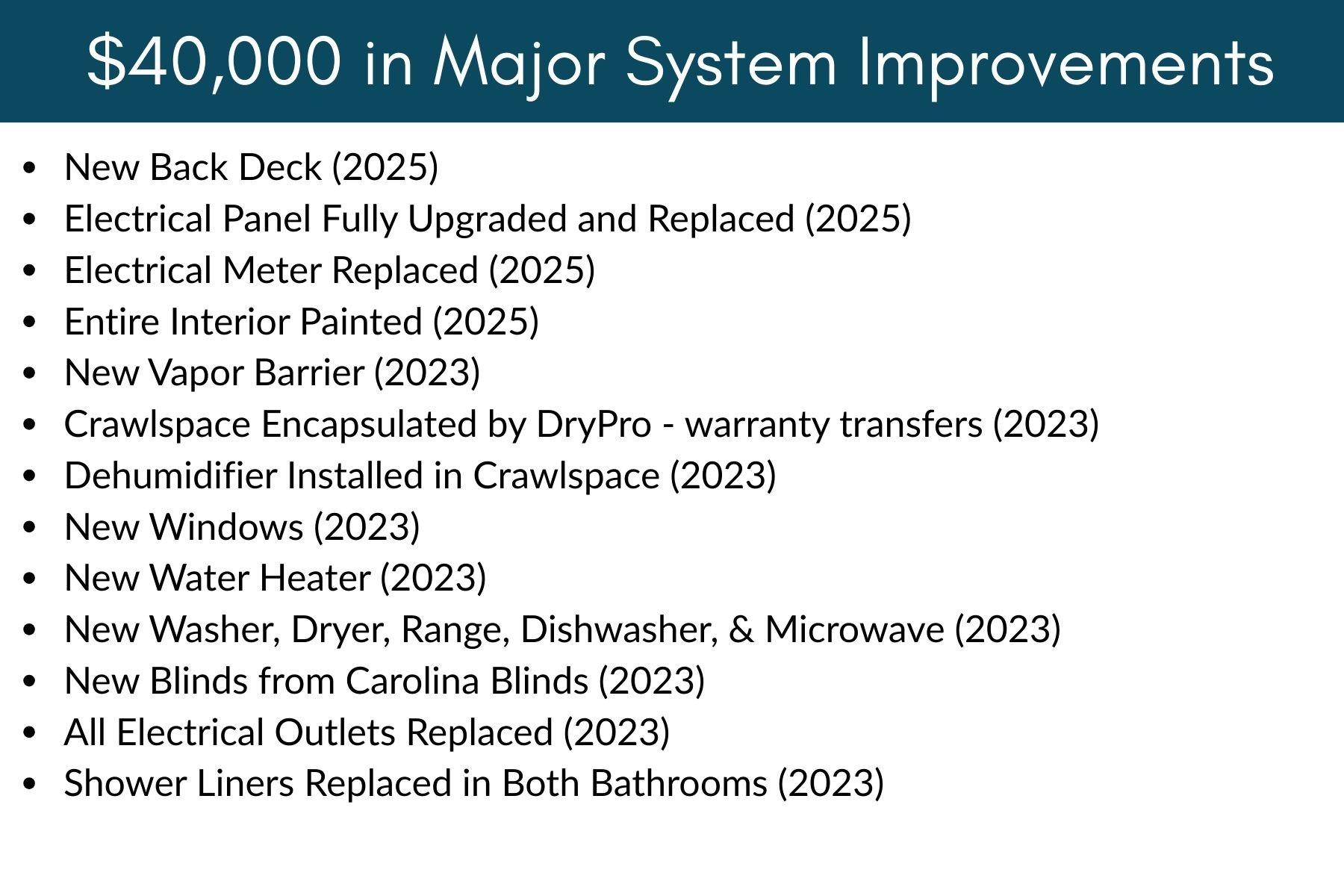 Major recent improvements provide peace of mind, including over $40,000 in system upgrades such as a fully encapsulated crawlspace with a transferable warranty, a new electrical panel, replacement windows, and a new deck. Fresh interior paint brightens the home, while abundant natural light enhances the inviting single-story layout.