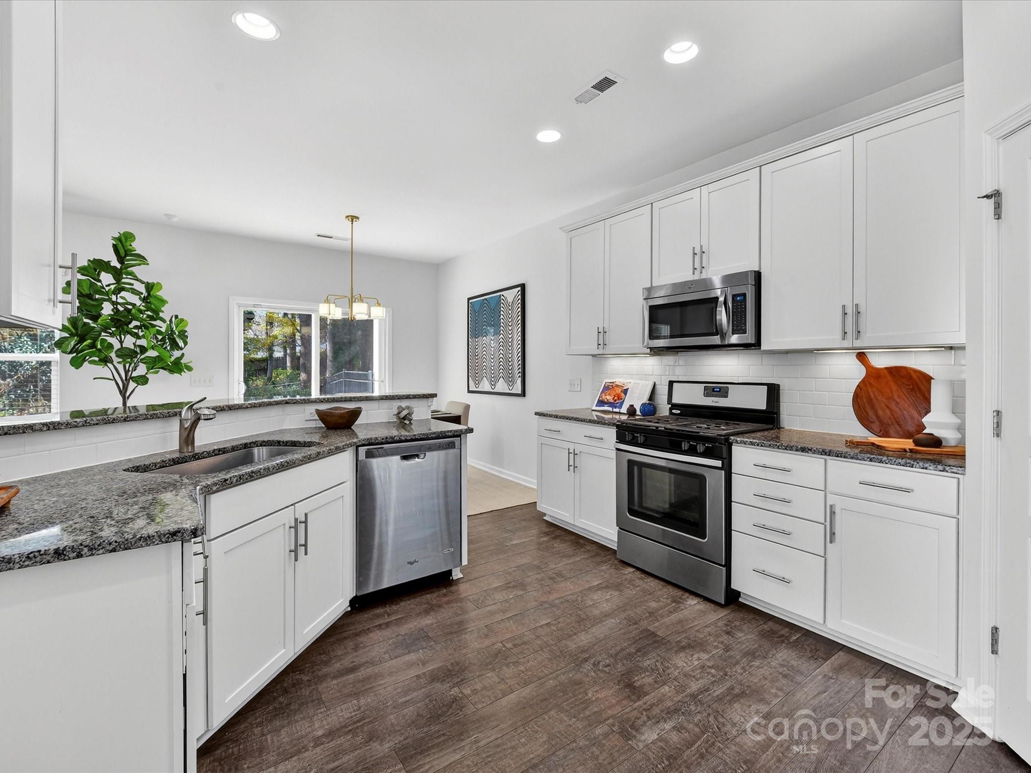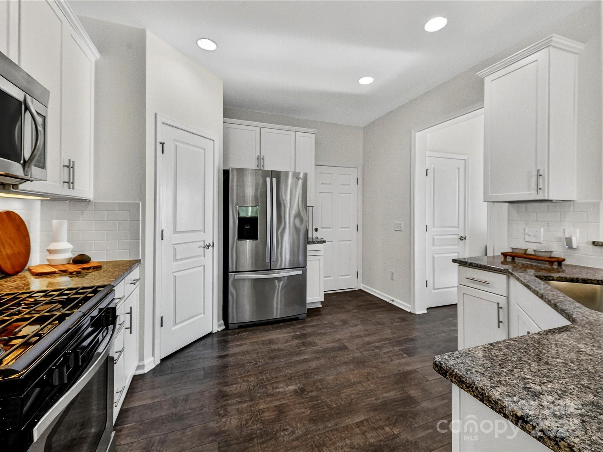 Luxurious laminate flooring is both gorgeous and impressively durable. Custom lighting. Spacious great room with fireplace and inviting dining area. Gourmet kitchen offers farm style sink, pantry, breakfast bar, white kitchen cabinetry with under-counter lights and granite counters. Whirlpool stainless steel gas range, microwave, and refrigerator with water/ice dispenser.
