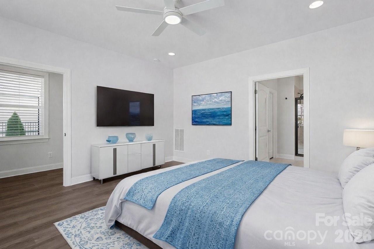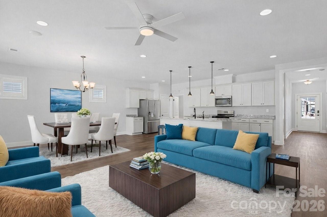 The Affirm Loft features a generous multi purpose, open, flowing floor plan. Exceptional kitchen with amazing storage/counter space, SS appliances, refrigerator, gas range, tile back splash and island breakfast bar that opens to the great room with wall mounted TV included. Dining area with wall of glass opens to a covered and screened Lanai that features an extended paver patio gas fire pit and grill connection plus a fenced yard for added entertaining options. LVP flooring throughout (no carpet) the home. Recessed & designer lighting, custom blinds and a multi use flex/office space with doors adds privacy. Primary bedroom includes an en-suite bath with dual sink vanity, walk in closet & tiled shower. Main floor has an additional guest bedroom with central bath, laundry room w/added cabinetry, (washing machine and dryer included) that connects to the 2 car extended garage. Upstairs is highlighted with an additional guest suite & full bath, 2 walk in closets providing excellent storage & family room area to spread out and relax (wall mount TV included). Trilogy Membership include Freedom Boat Club on Lake Norman plus award winning amenities